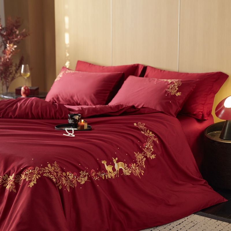 (总)云胡 2024新款50s双股长绒棉婚庆款重工刺绣四件套-一鹿有你