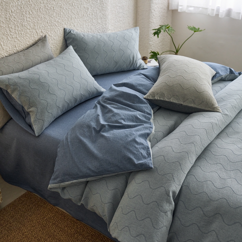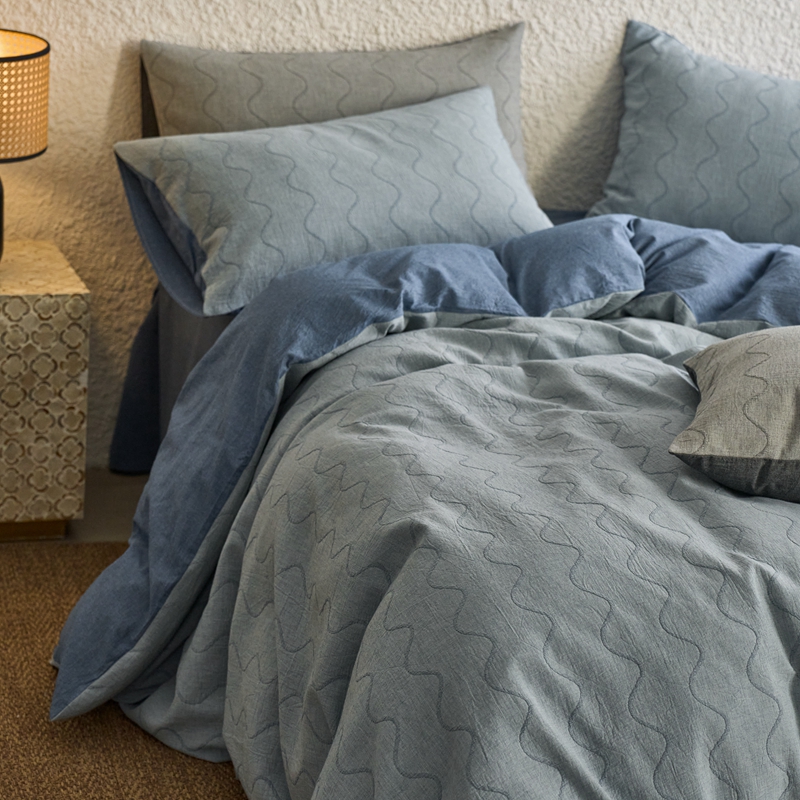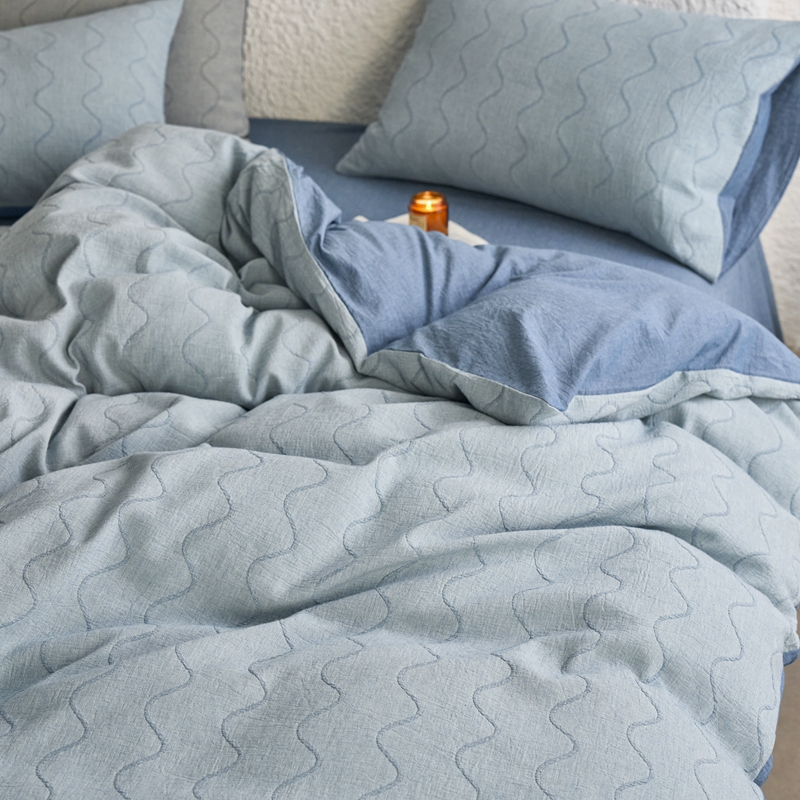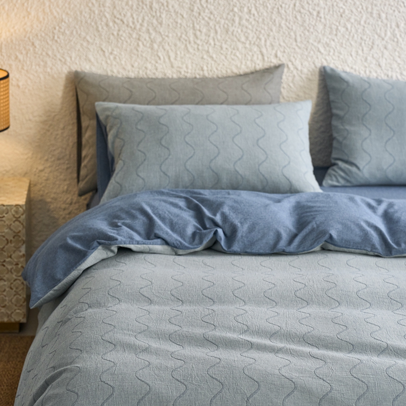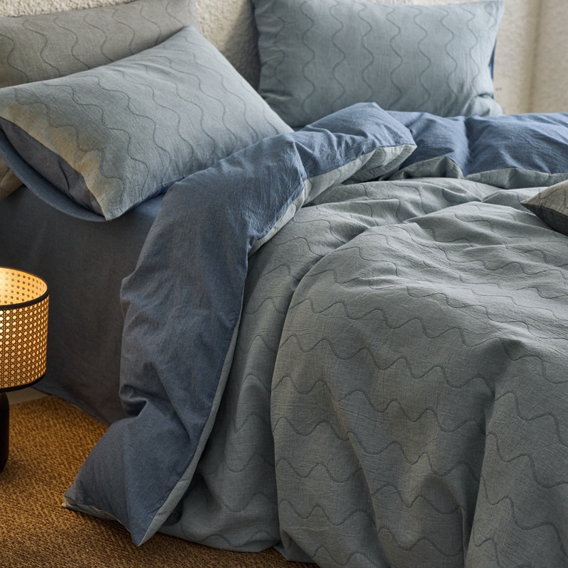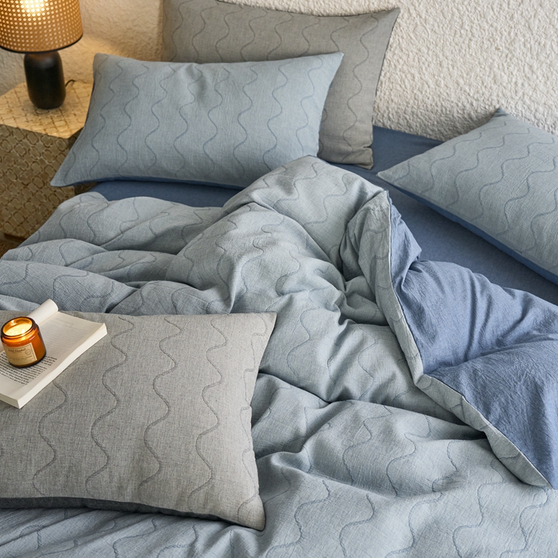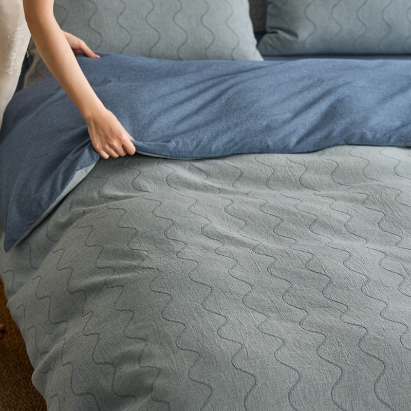 商品名称:安莱生活 2025新款双层纱色织提花波浪系列四件套 竖纹波浪 竖纹波浪-深蓝