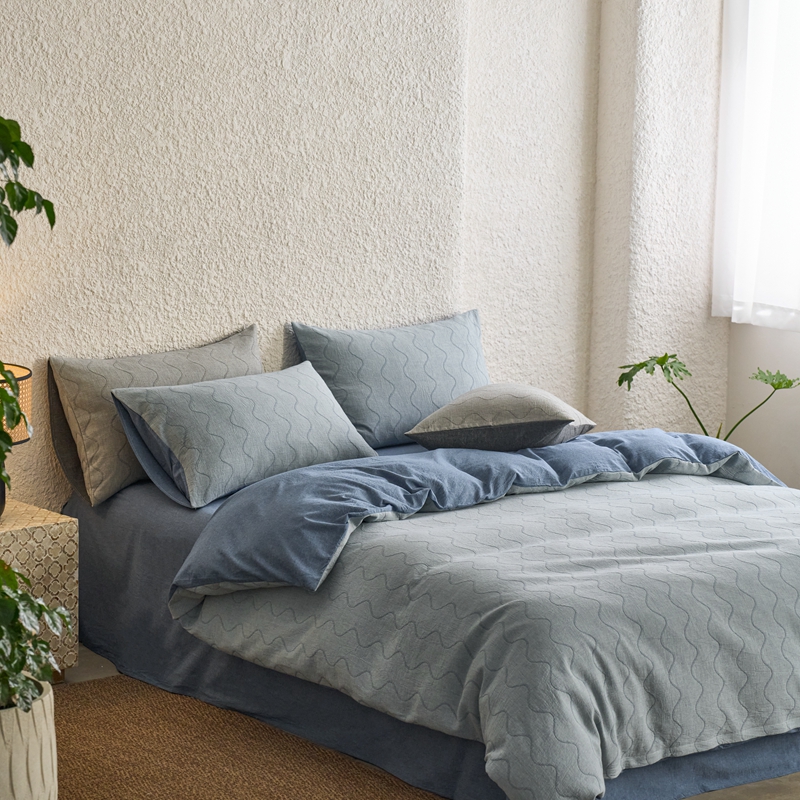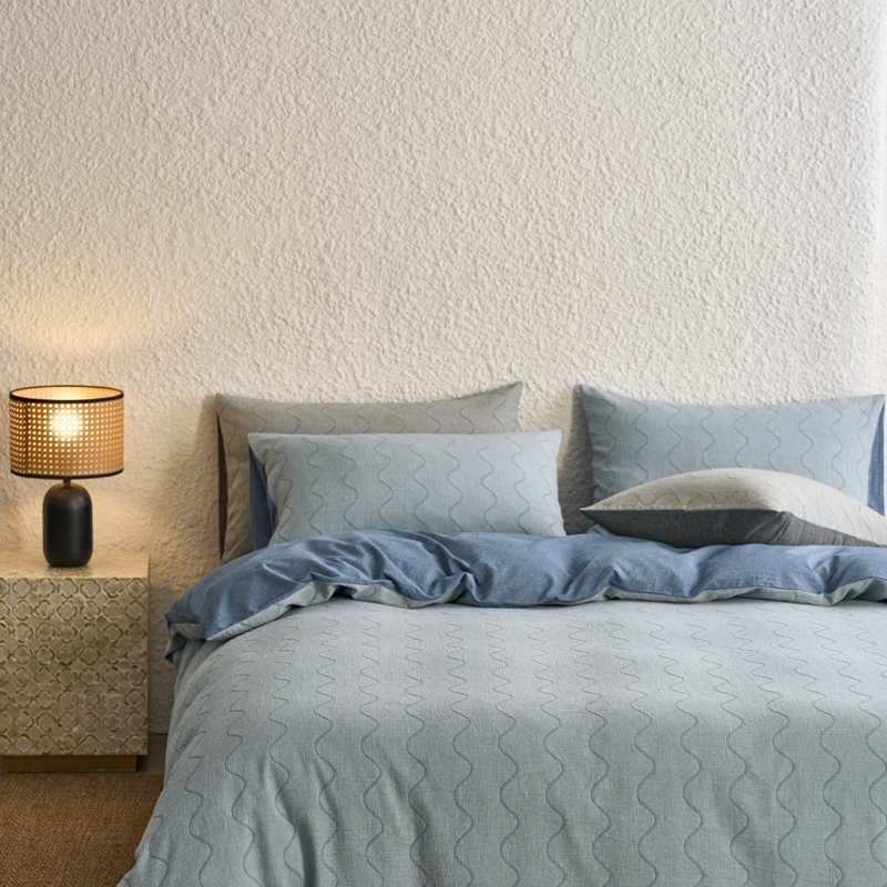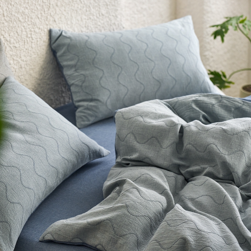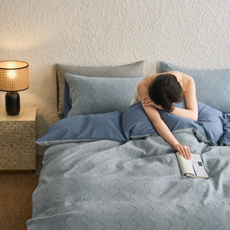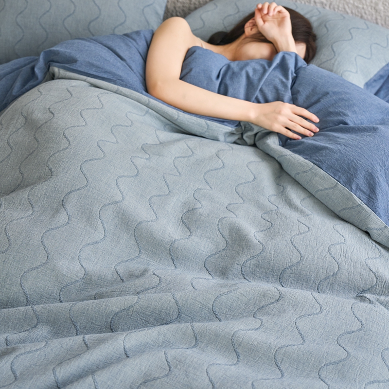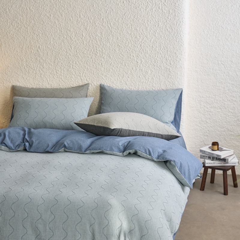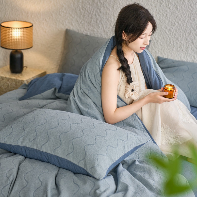 商品名称:安莱生活 2025新款双层纱色织提花波浪系列四件套 竖纹波浪 竖纹波浪-深蓝