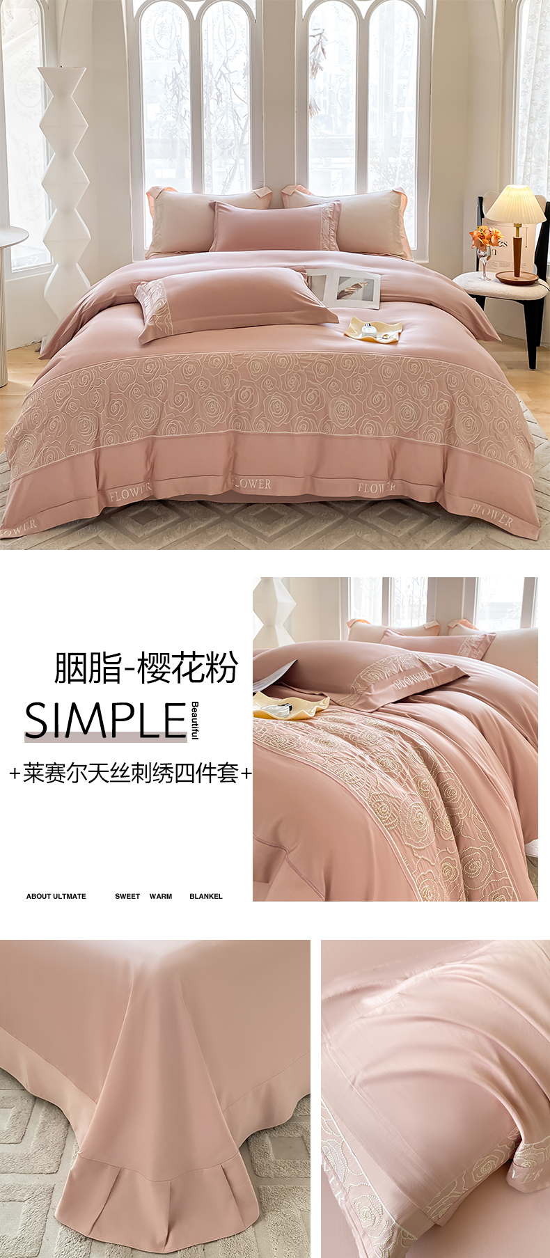 商品名称:新印象 2024新款60s天丝宽边绣花工艺四件套-胭脂 胭脂-樱花粉