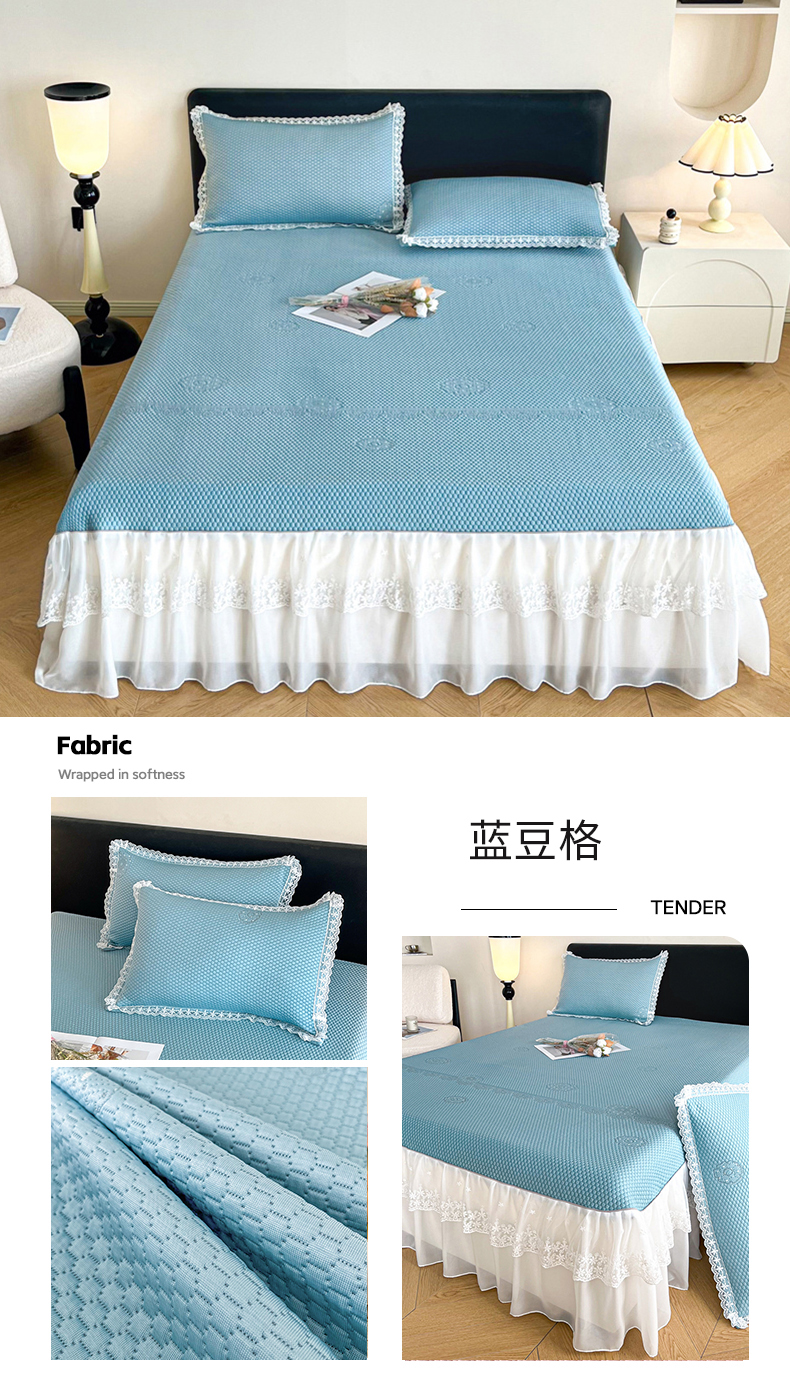商品名称:吉祥家纺 2024新款华夫格冰豆豆凉感床裙套件 蓝豆格