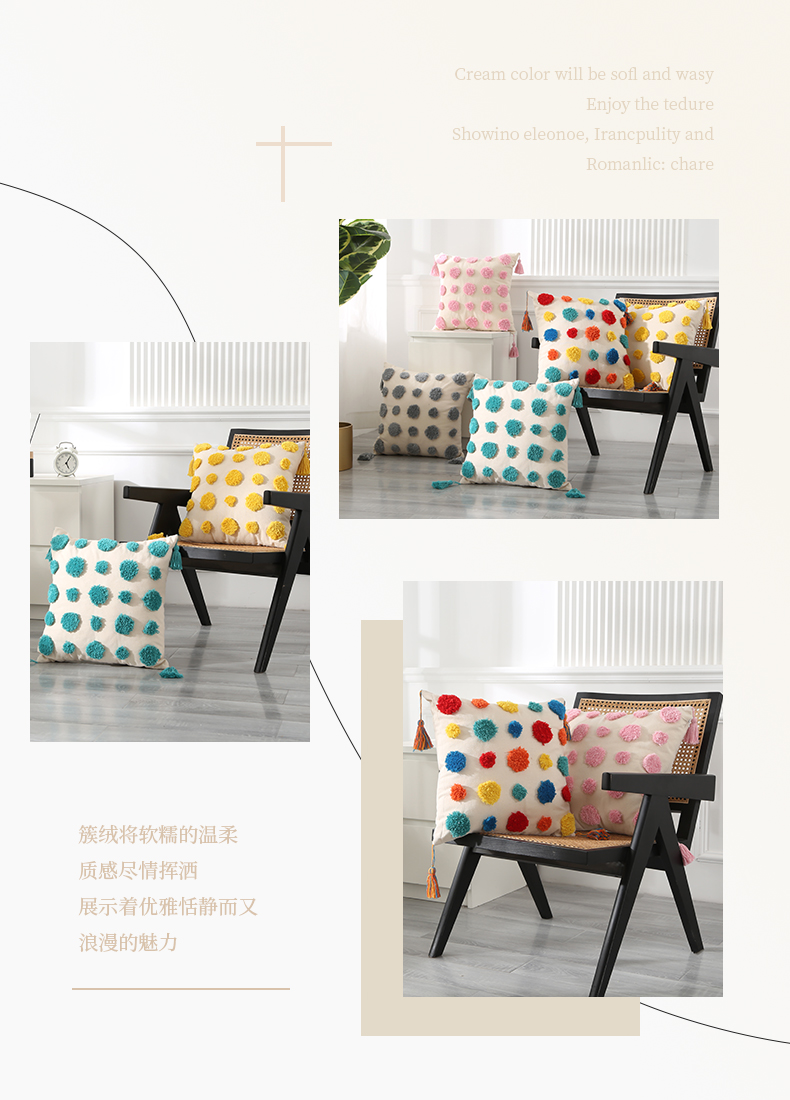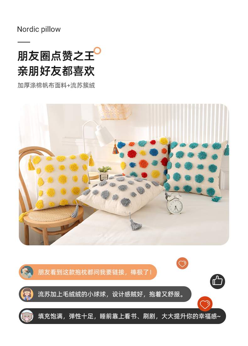 商品名称:囍莱家纺 2024新款亲肤多彩涤棉抱枕 流苏圆点-彩色