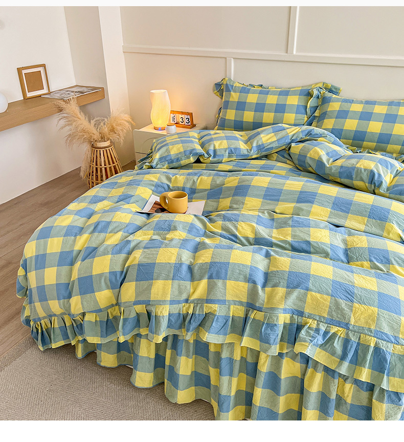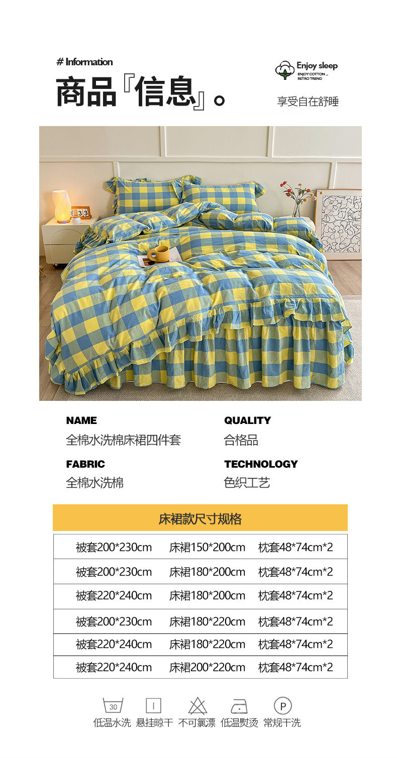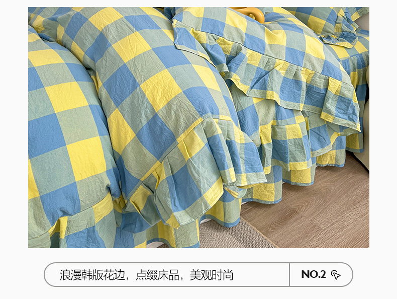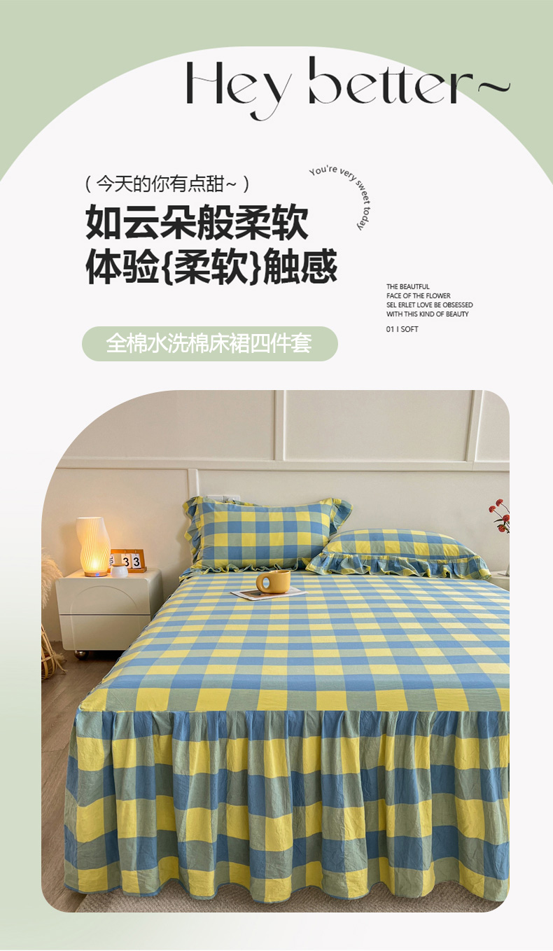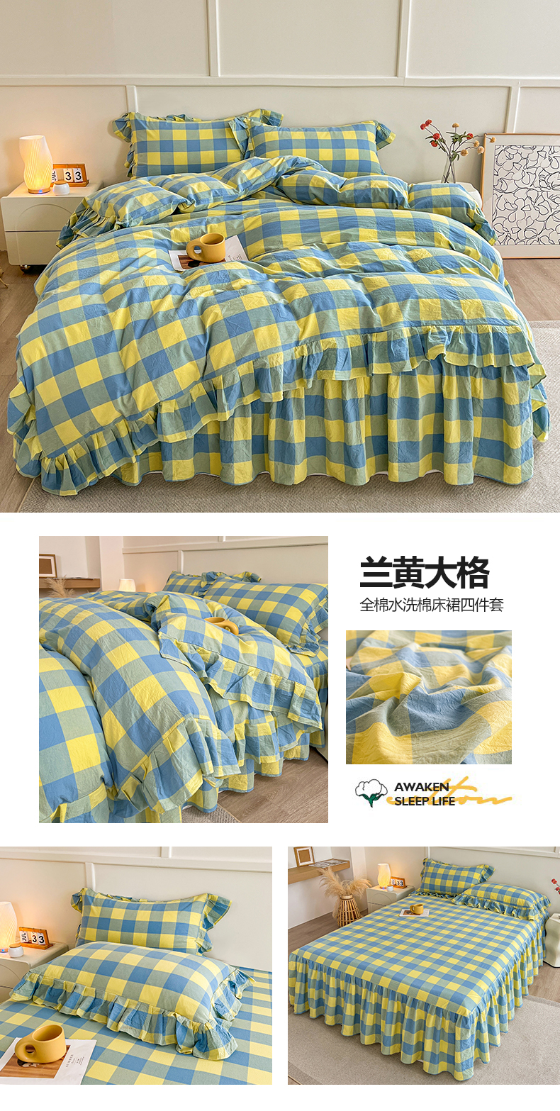 当前位置: 91家纺网 > 商品网购 > 床品套件 > 四件套 > 全棉普通四件套 > 糯米猪家纺 2024新款全棉水洗棉床裙四件套 兰黄大格