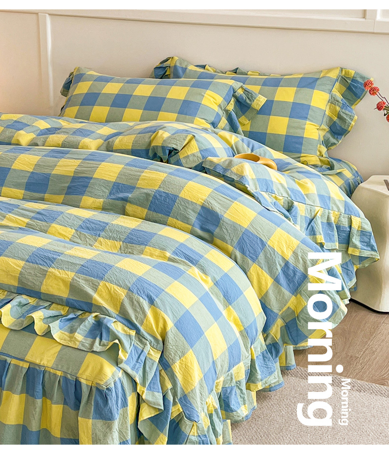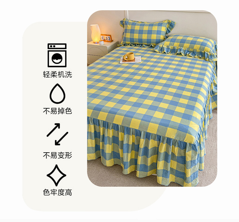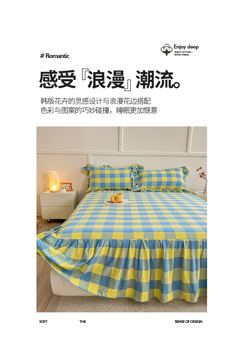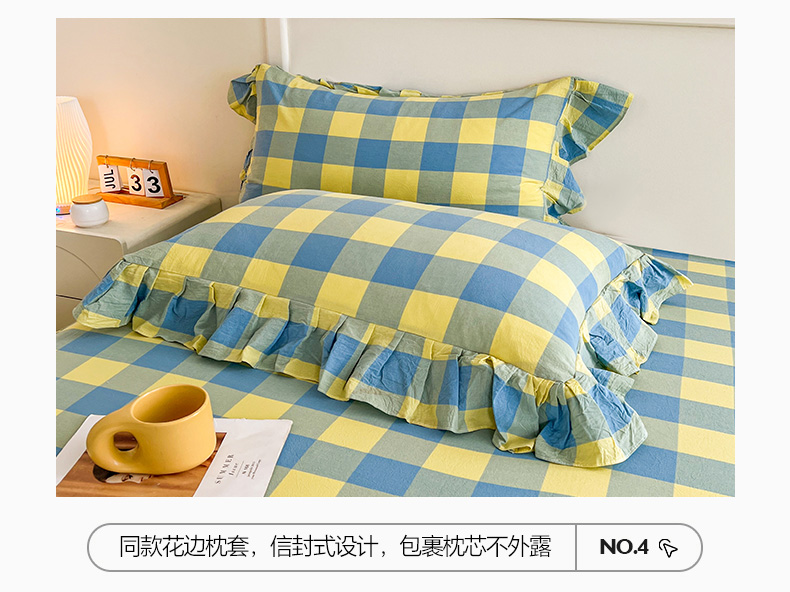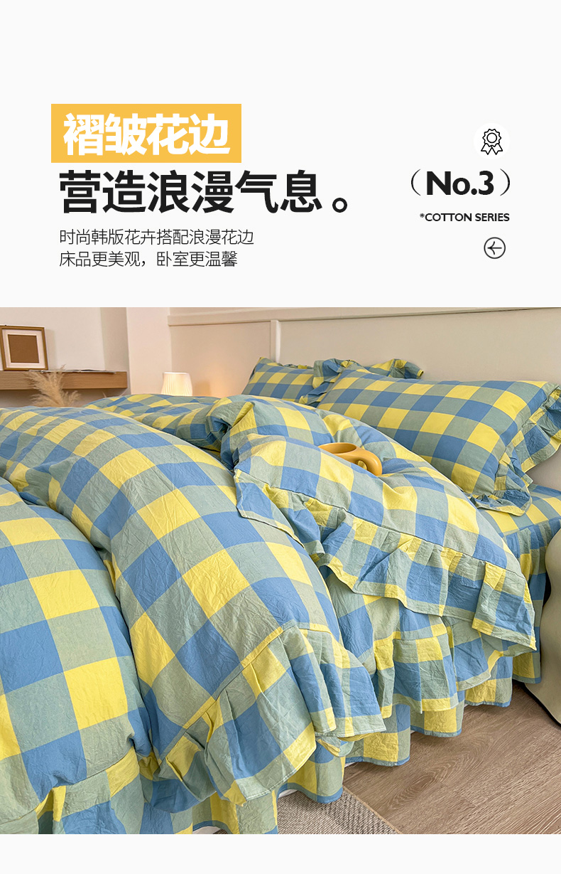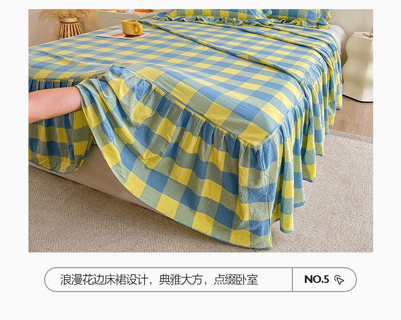 当前位置: 91家纺网 > 商品网购 > 床品套件 > 四件套 > 全棉普通四件套 > 糯米猪家纺 2024新款全棉水洗棉床裙四件套 兰黄大格