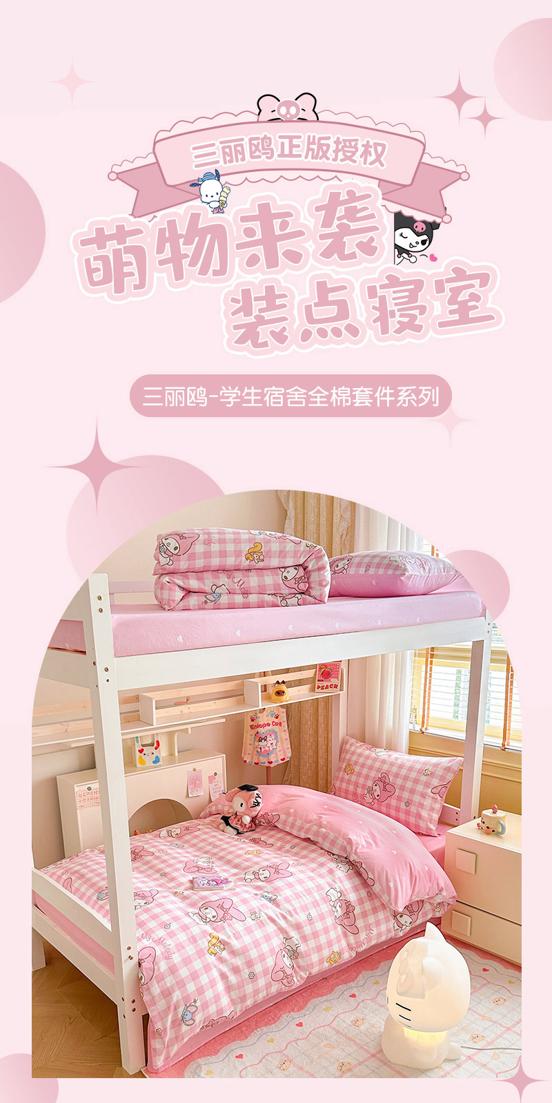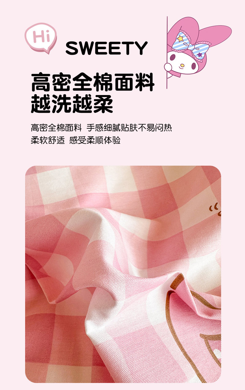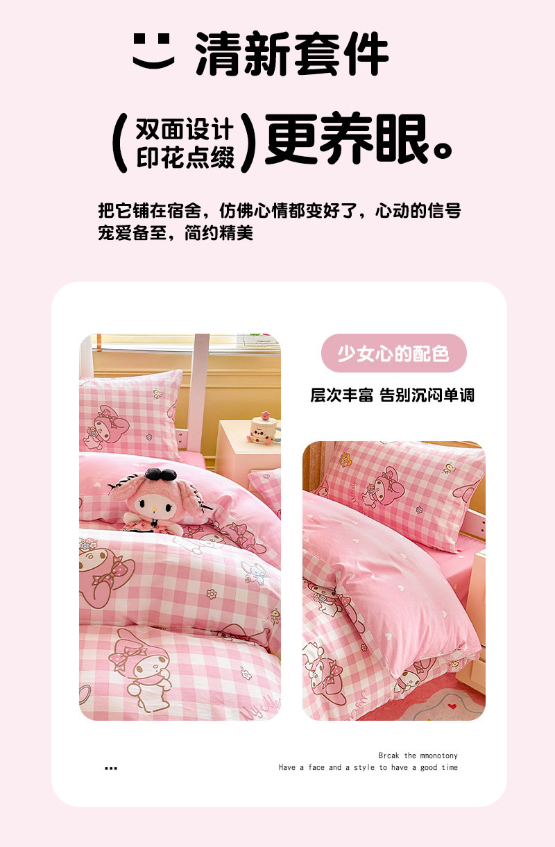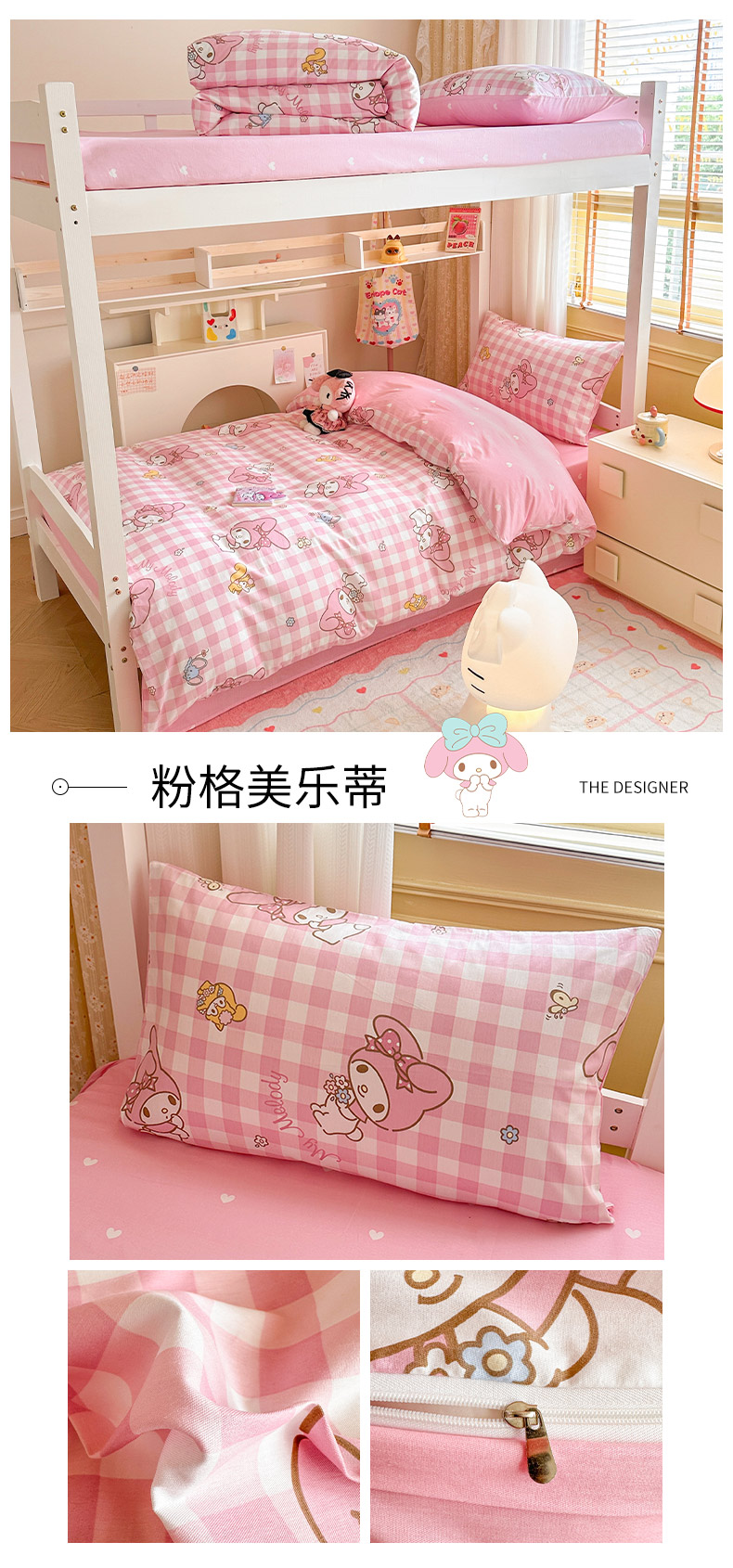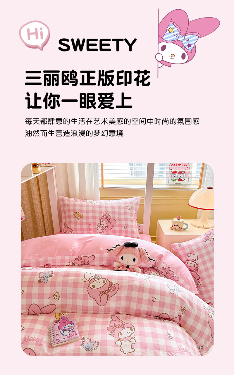 当前位置: 91家纺网 > 商品网购 > 床品套件 > 四件套 > 全棉普通四件套 > 蓝邻家纺 2024新款三丽鸥正版授权学生宿舍全棉印花四件套 粉格美乐蒂