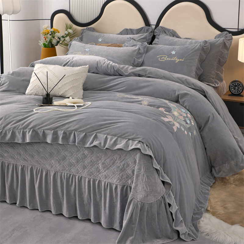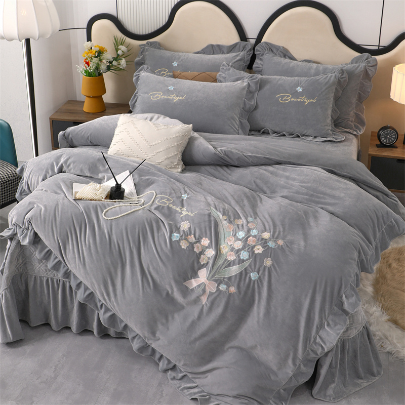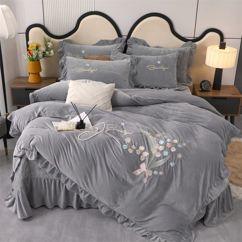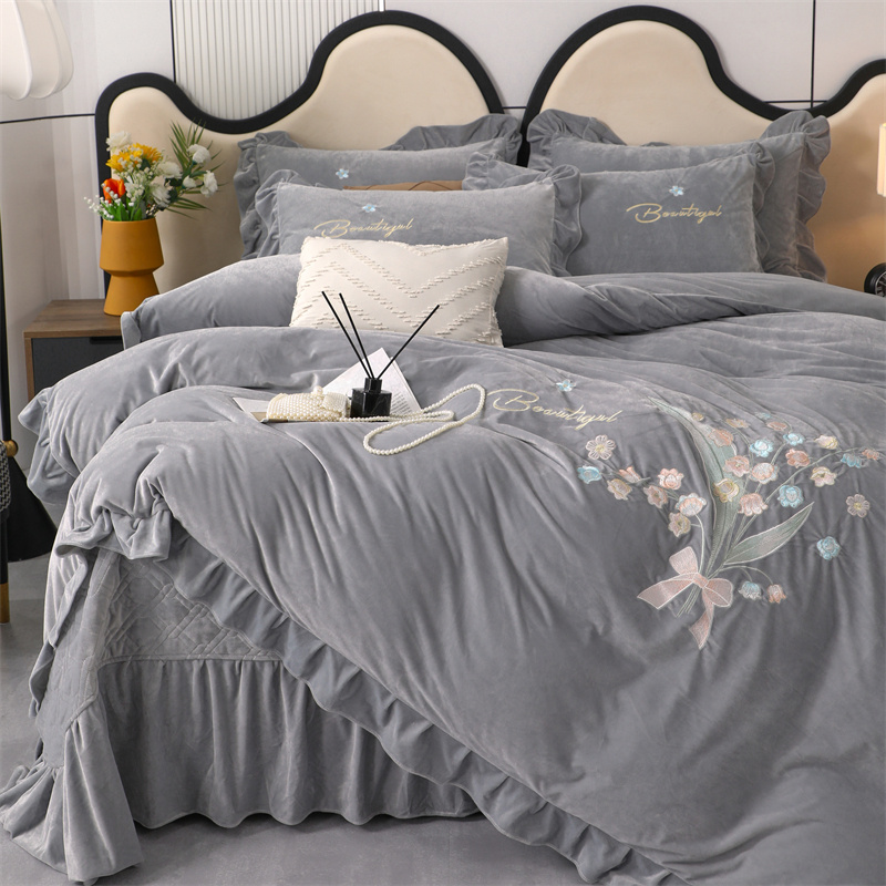 商品名称:卡迪亚家纺 2024新款宝宝绒绣花床盖款四件套-铃兰花 轻奢灰