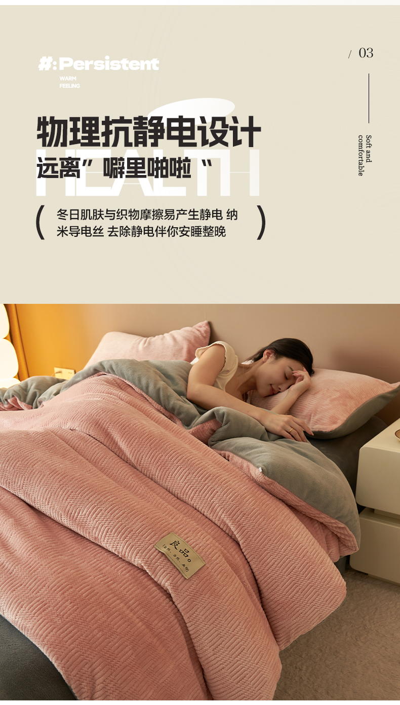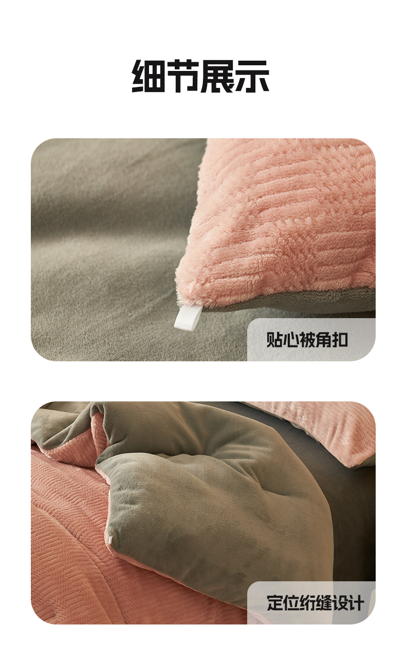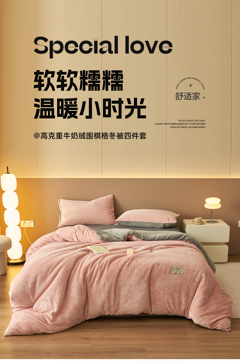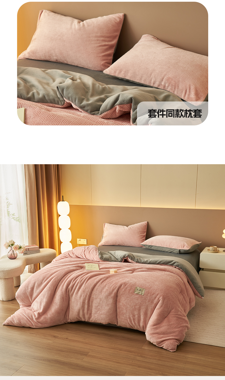 • 91家纺网 家纺一手货源 找家纺 2024新款牛奶绒提花围棋格冬被四件套 格子-粉拼灰