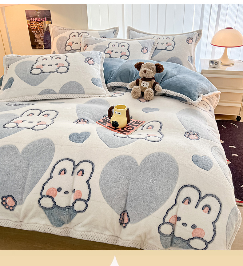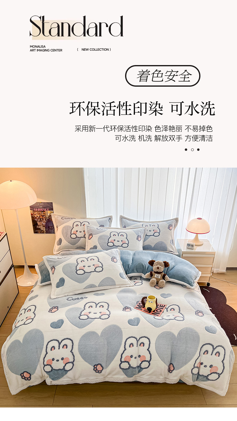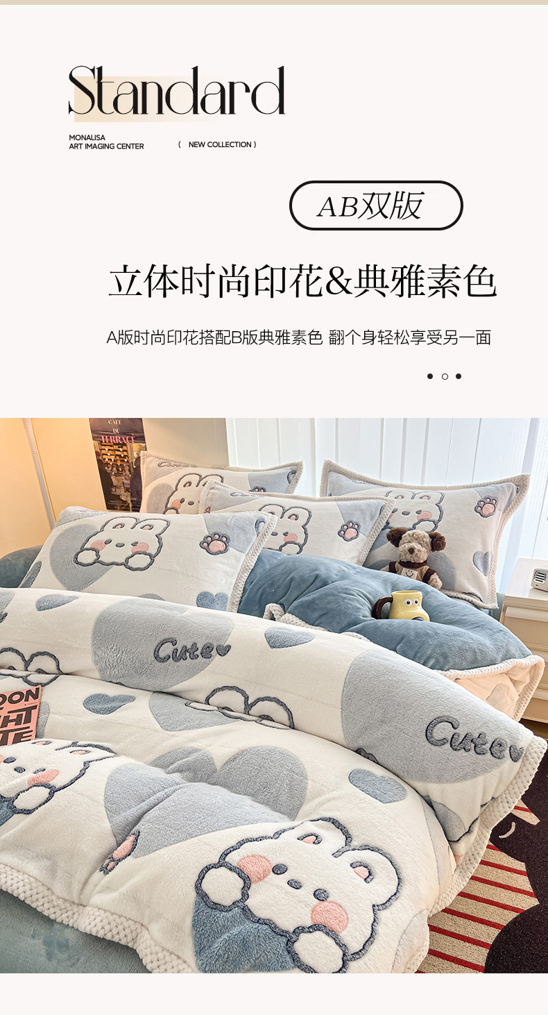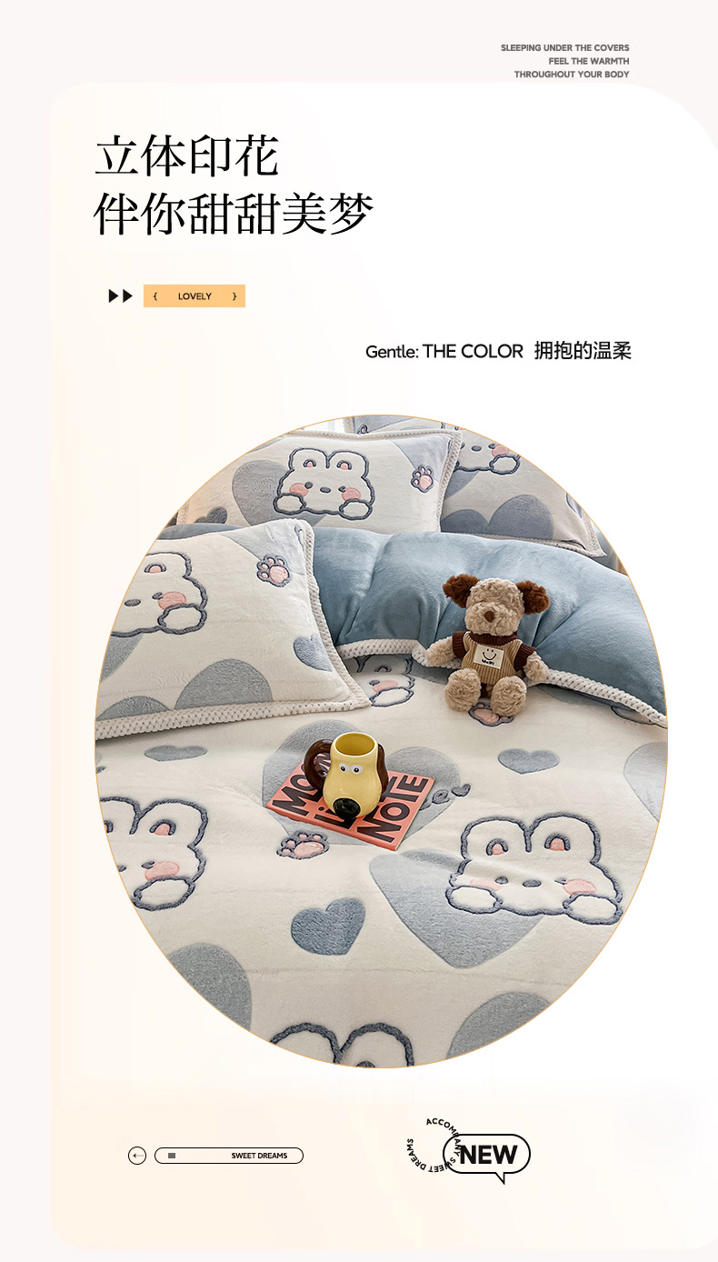 (总)倾慕家纺 2025新款卡通毛巾绣加厚保暖牛奶绒四件套,爱心女孩,咖啡小狗,猫咪熊兔,迷你小车,圣诞树熊,音乐企鹅