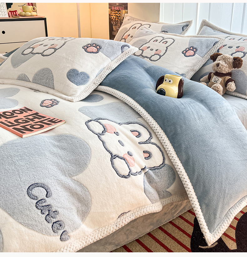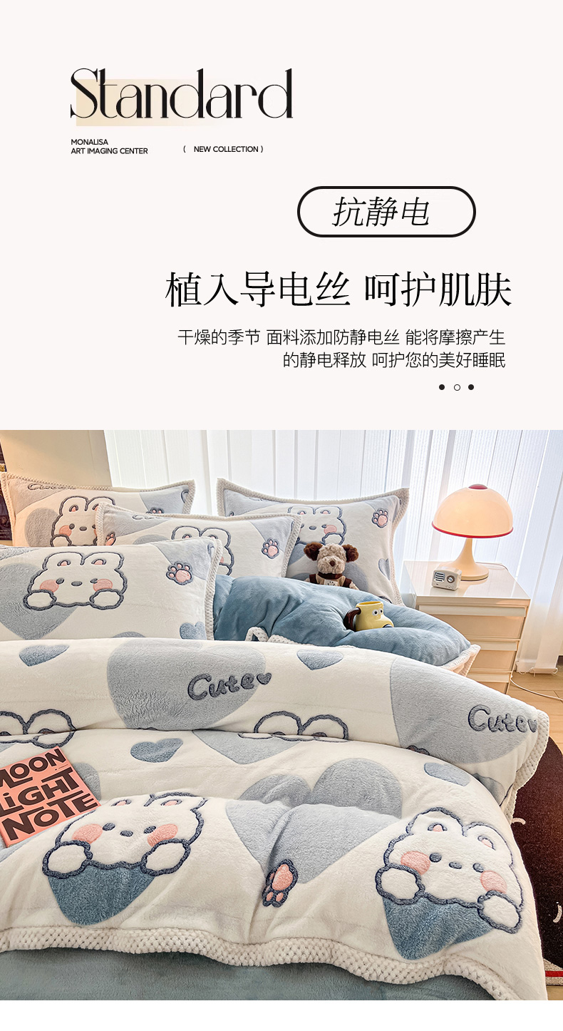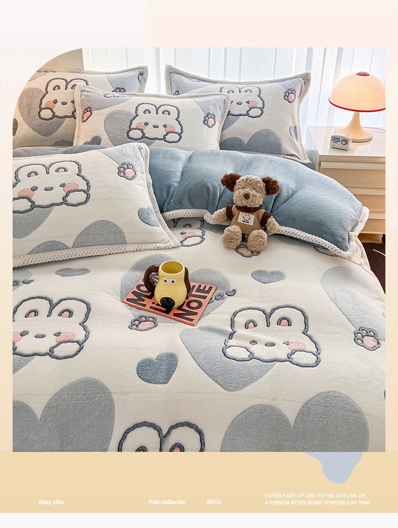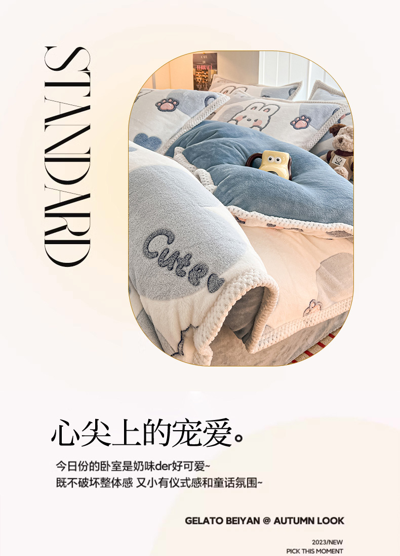 (总)倾慕家纺 2025新款卡通毛巾绣加厚保暖牛奶绒四件套,爱心女孩,咖啡小狗,猫咪熊兔,迷你小车,圣诞树熊,音乐企鹅