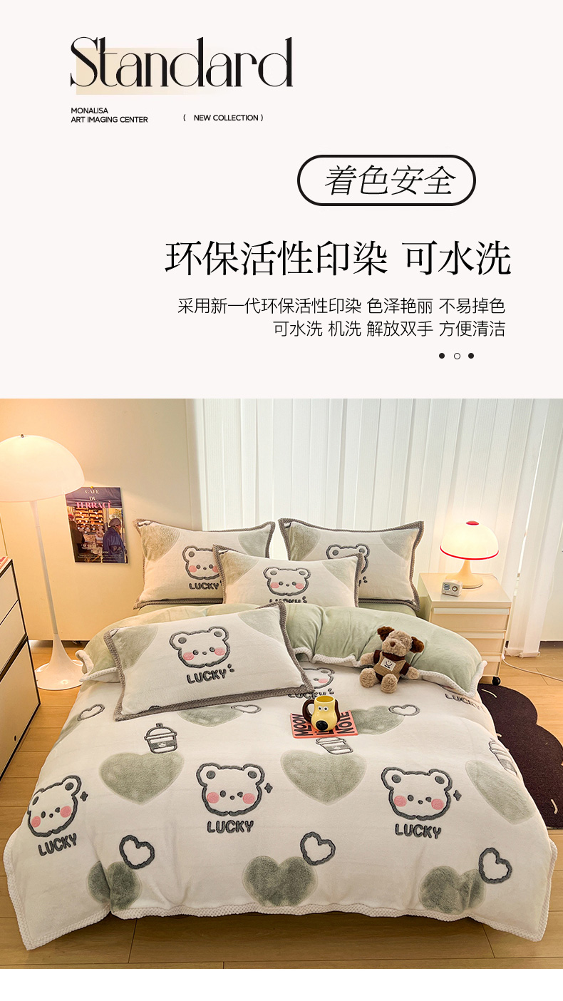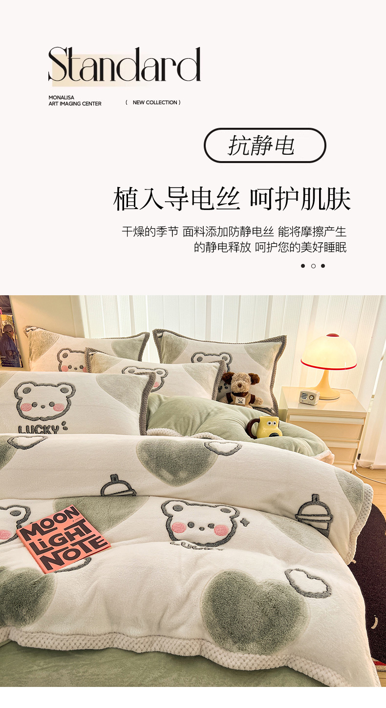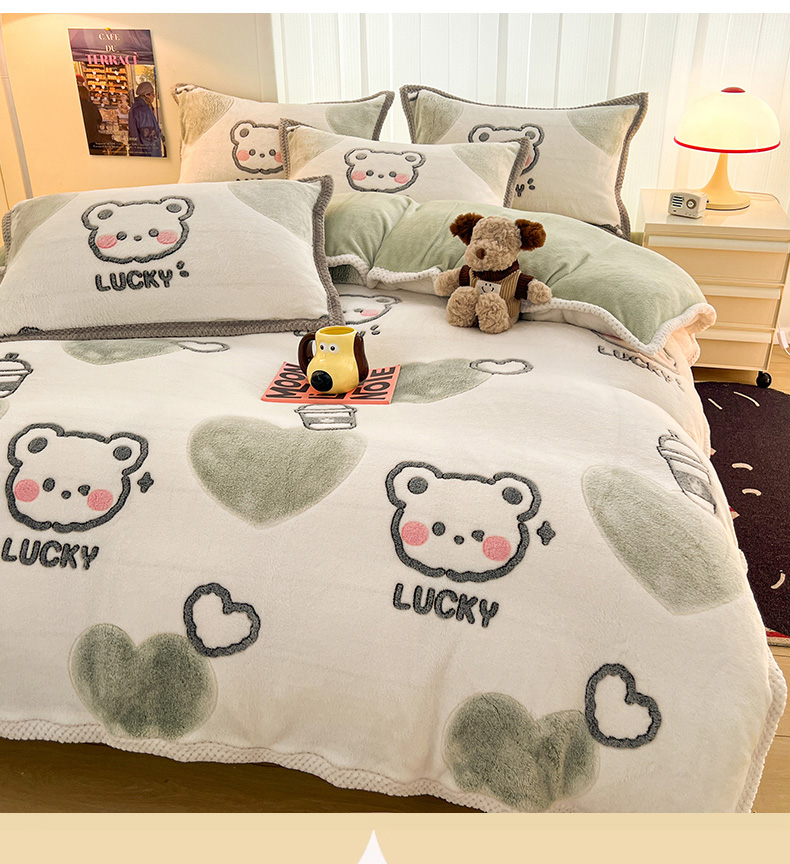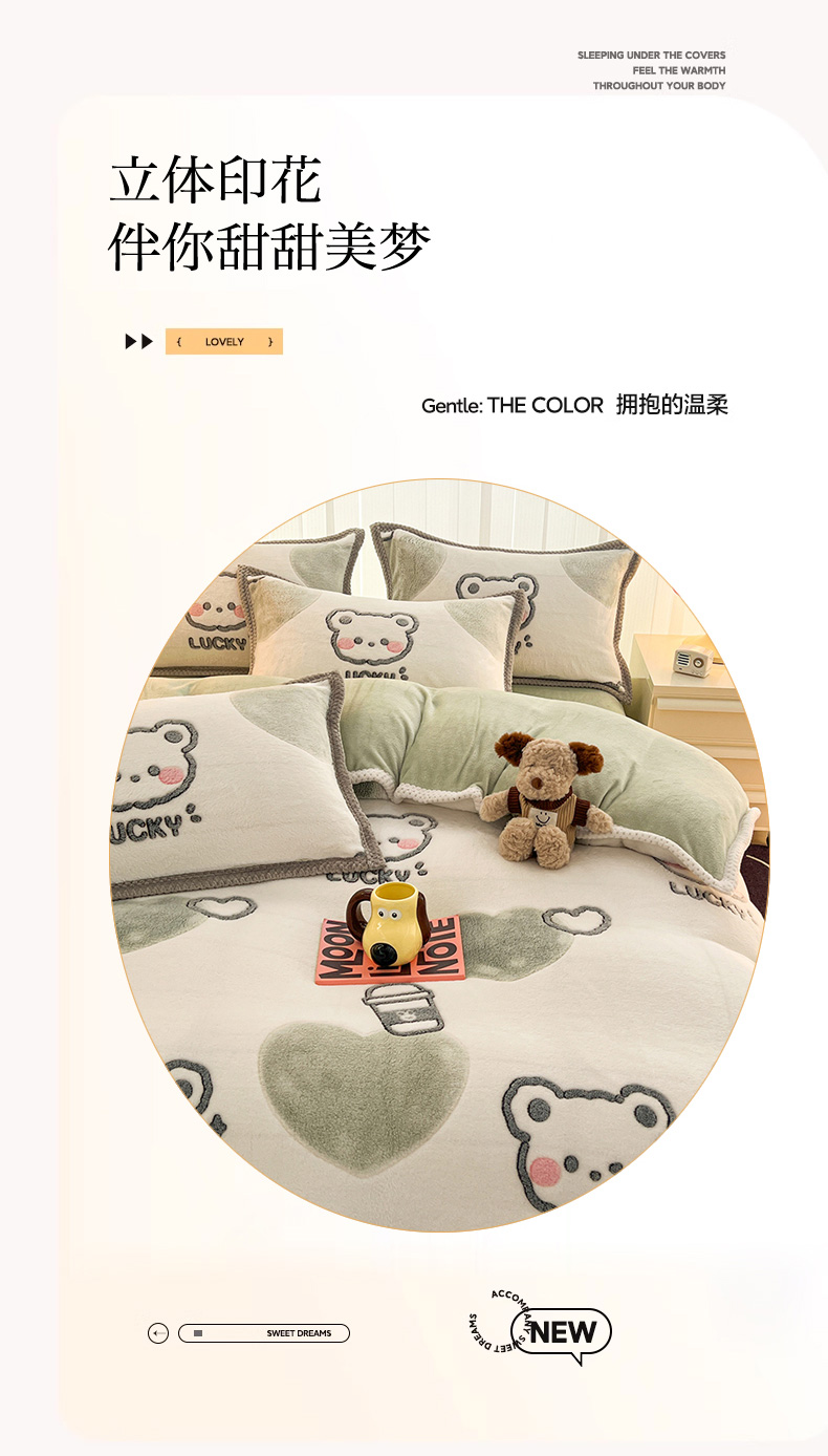(总)倾慕家纺 2025新款卡通毛巾绣加厚保暖牛奶绒四件套,爱心女孩,咖啡小狗,猫咪熊兔,迷你小车,圣诞树熊,音乐企鹅