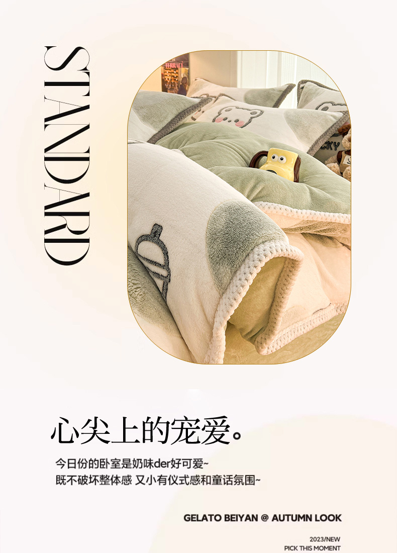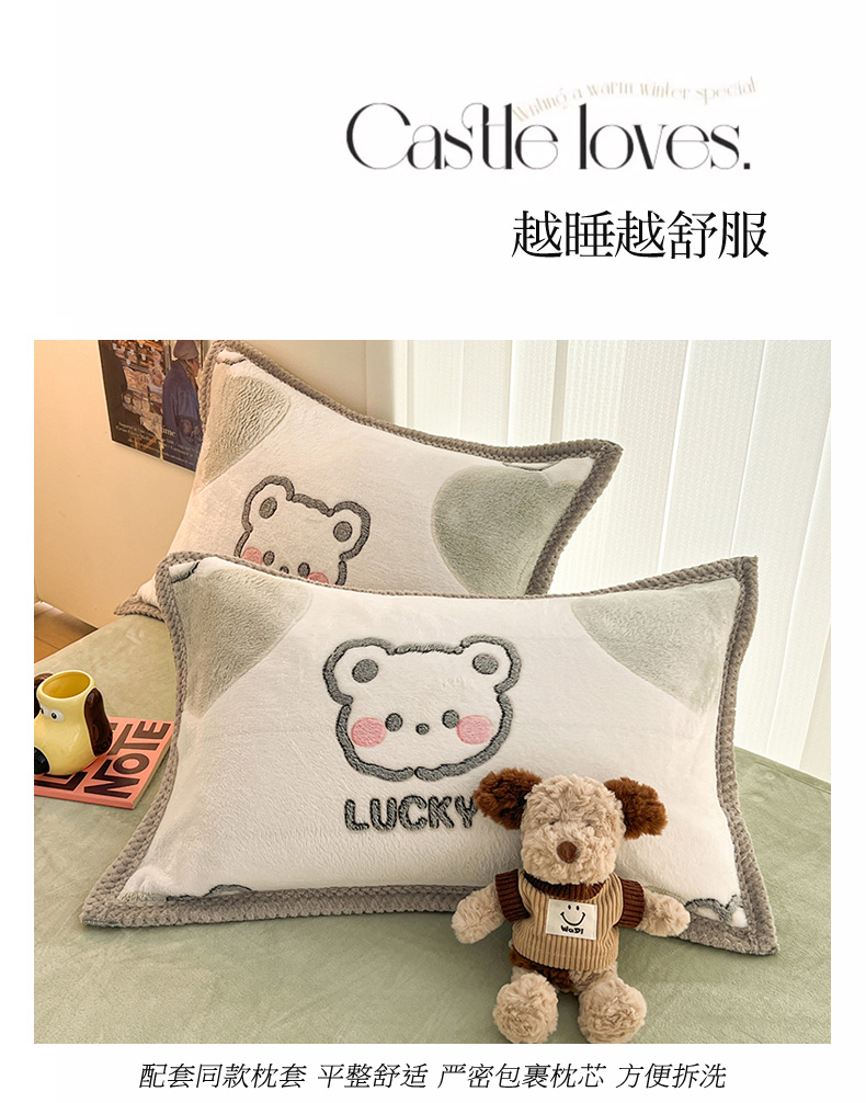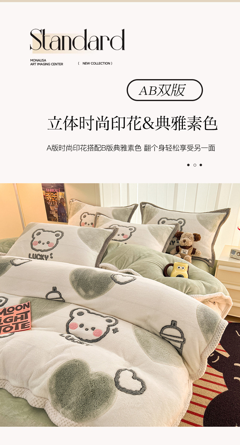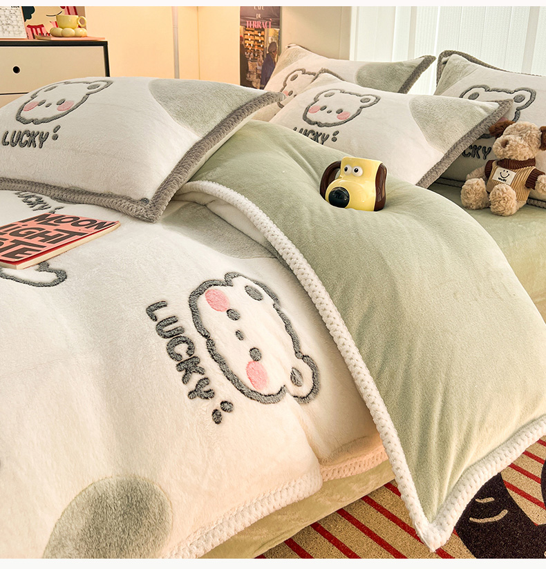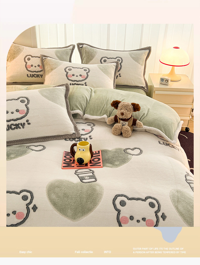 (总)倾慕家纺 2025新款卡通毛巾绣加厚保暖牛奶绒四件套,爱心女孩,咖啡小狗,猫咪熊兔,迷你小车,圣诞树熊,音乐企鹅