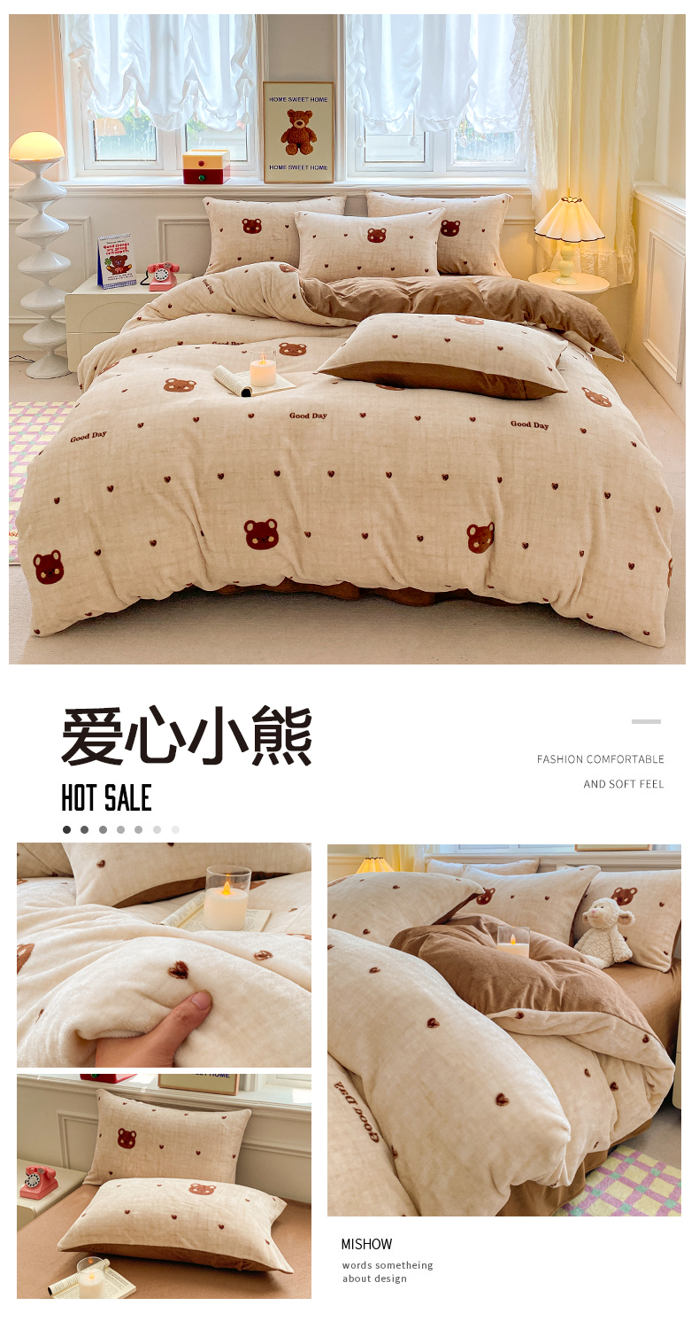 斯卡诺2025新款直播轻奢爆款小清新牛奶宝宝绒四件套 爱心小熊