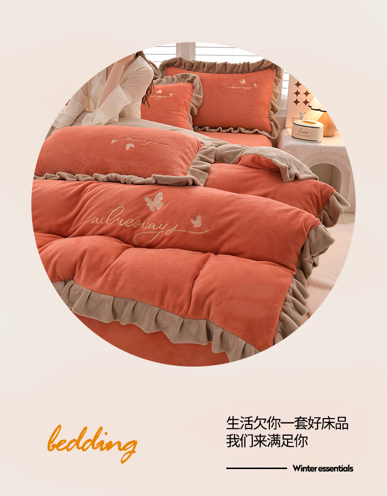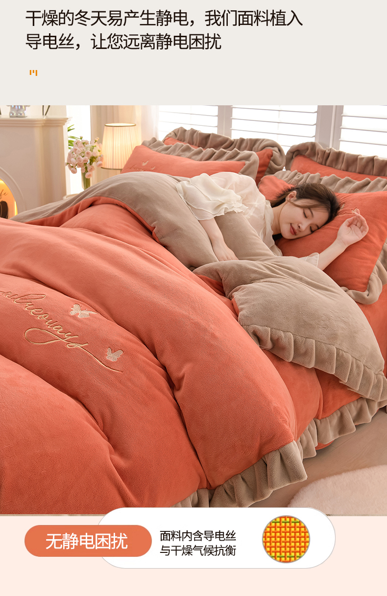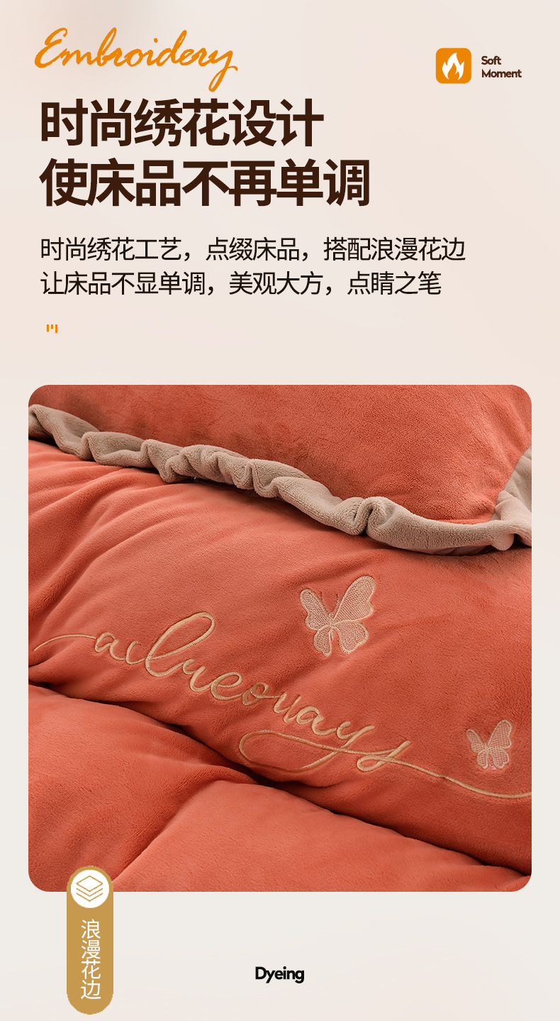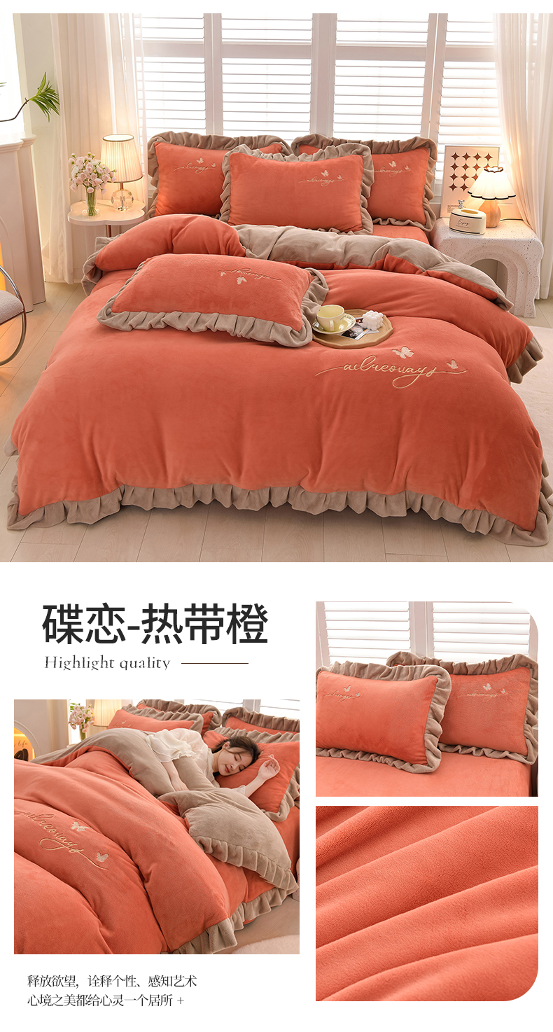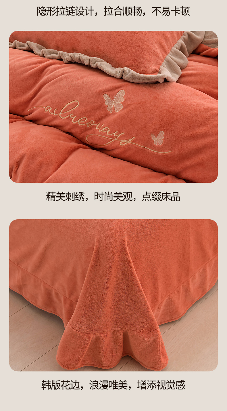 商品名称:氧家 2024新款韩版牛奶绒绣花四件套--蝶恋 羽蝶-橙橘色