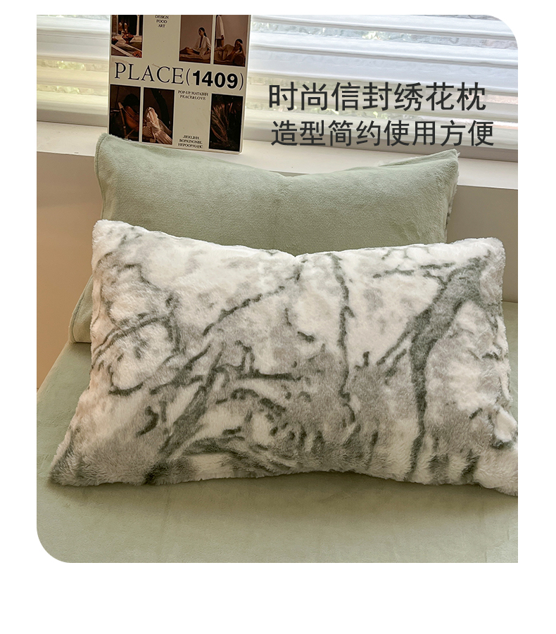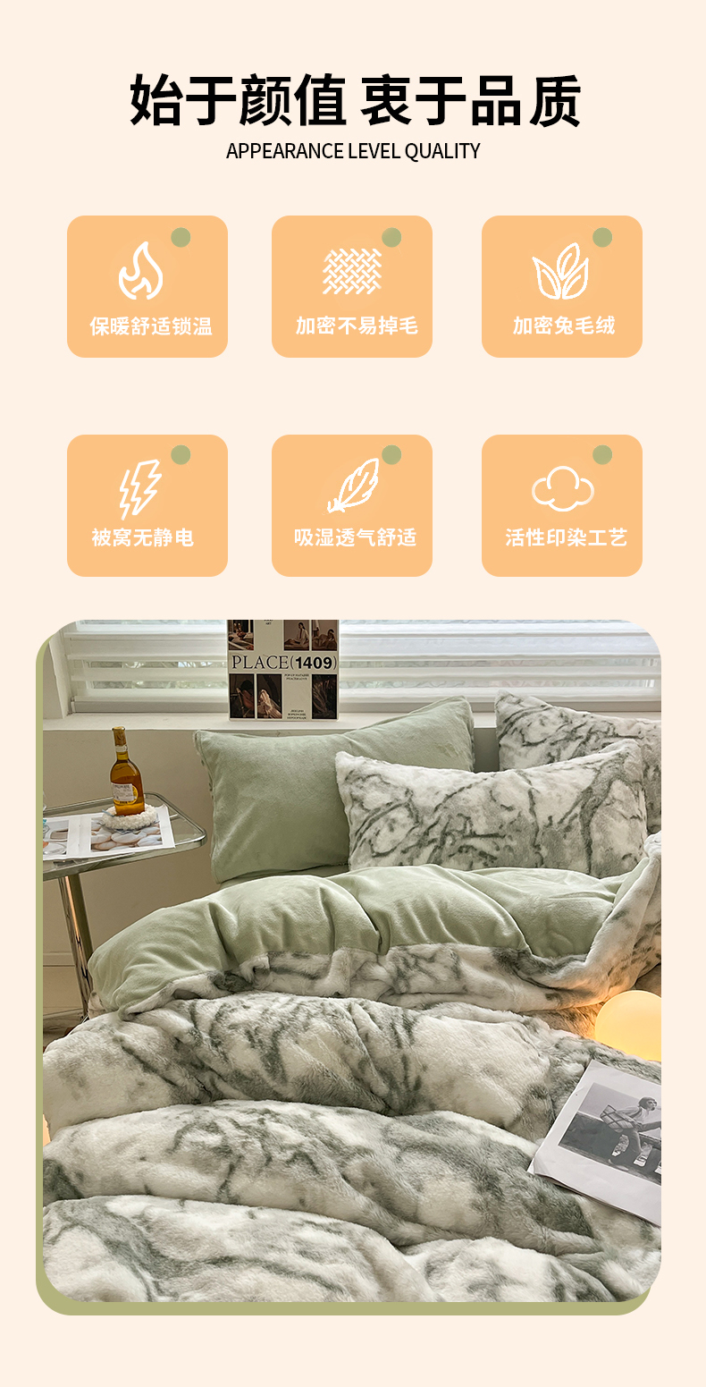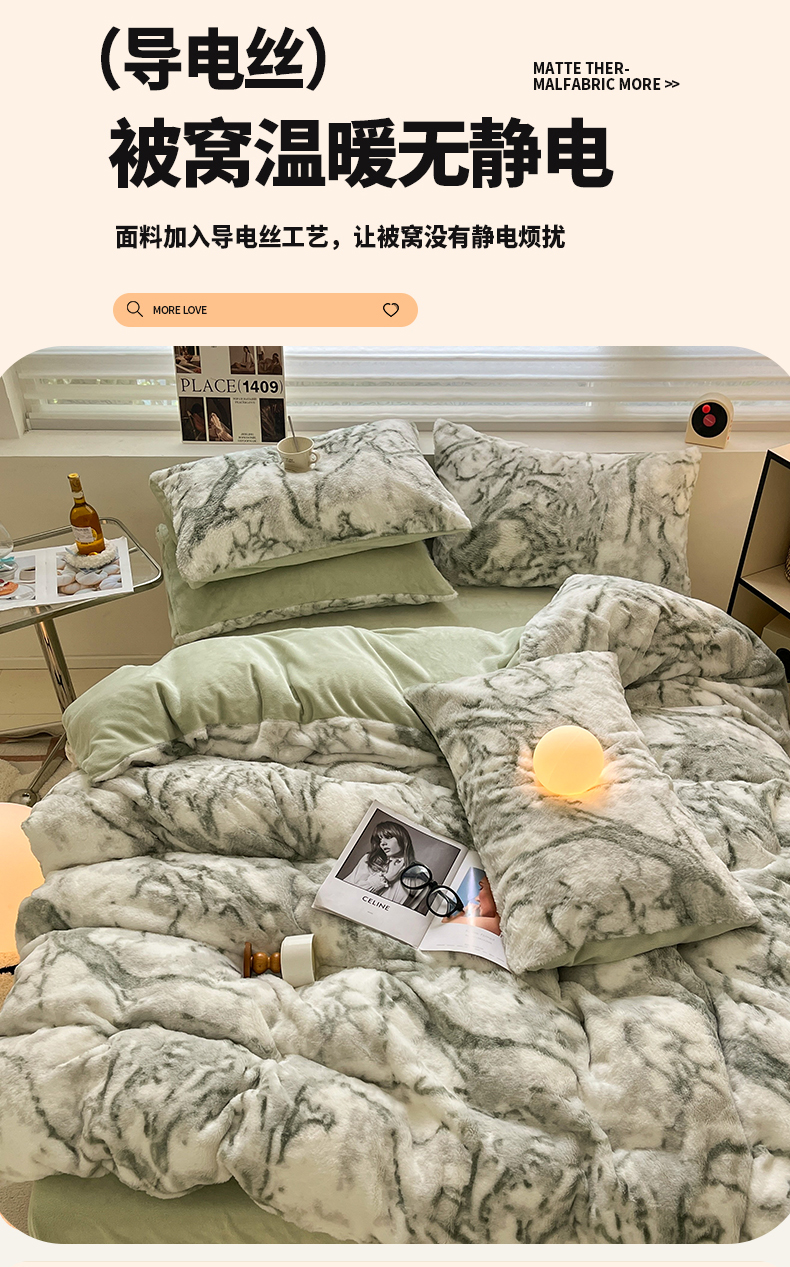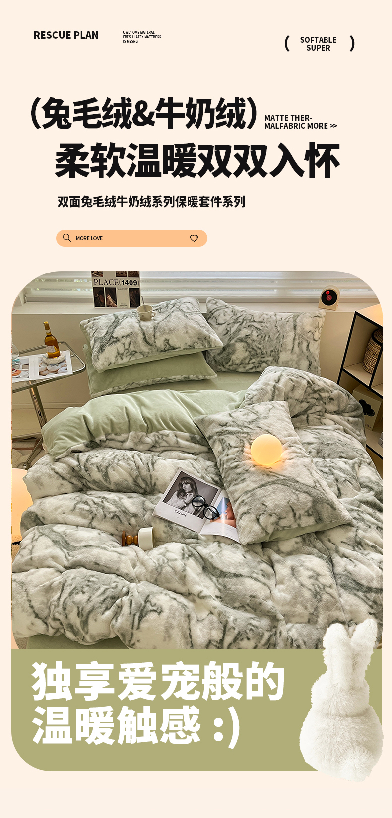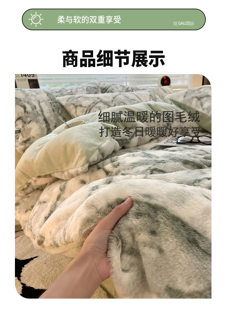 金爱家 2024新款立体牛奶绒兔毛绒印花四件套 兔毛印花-大理石绿