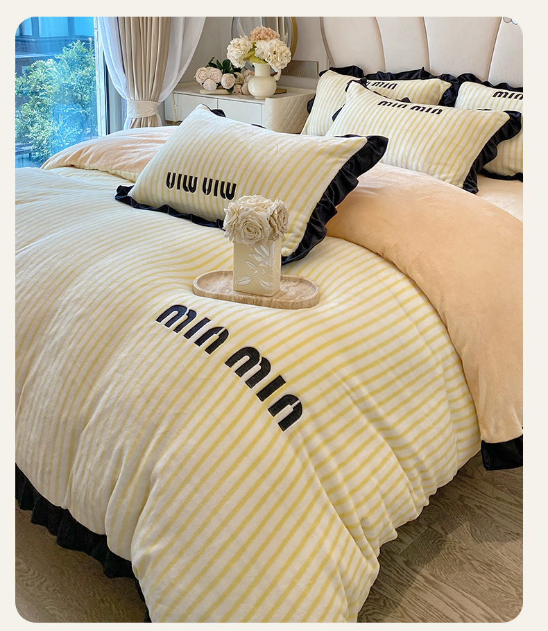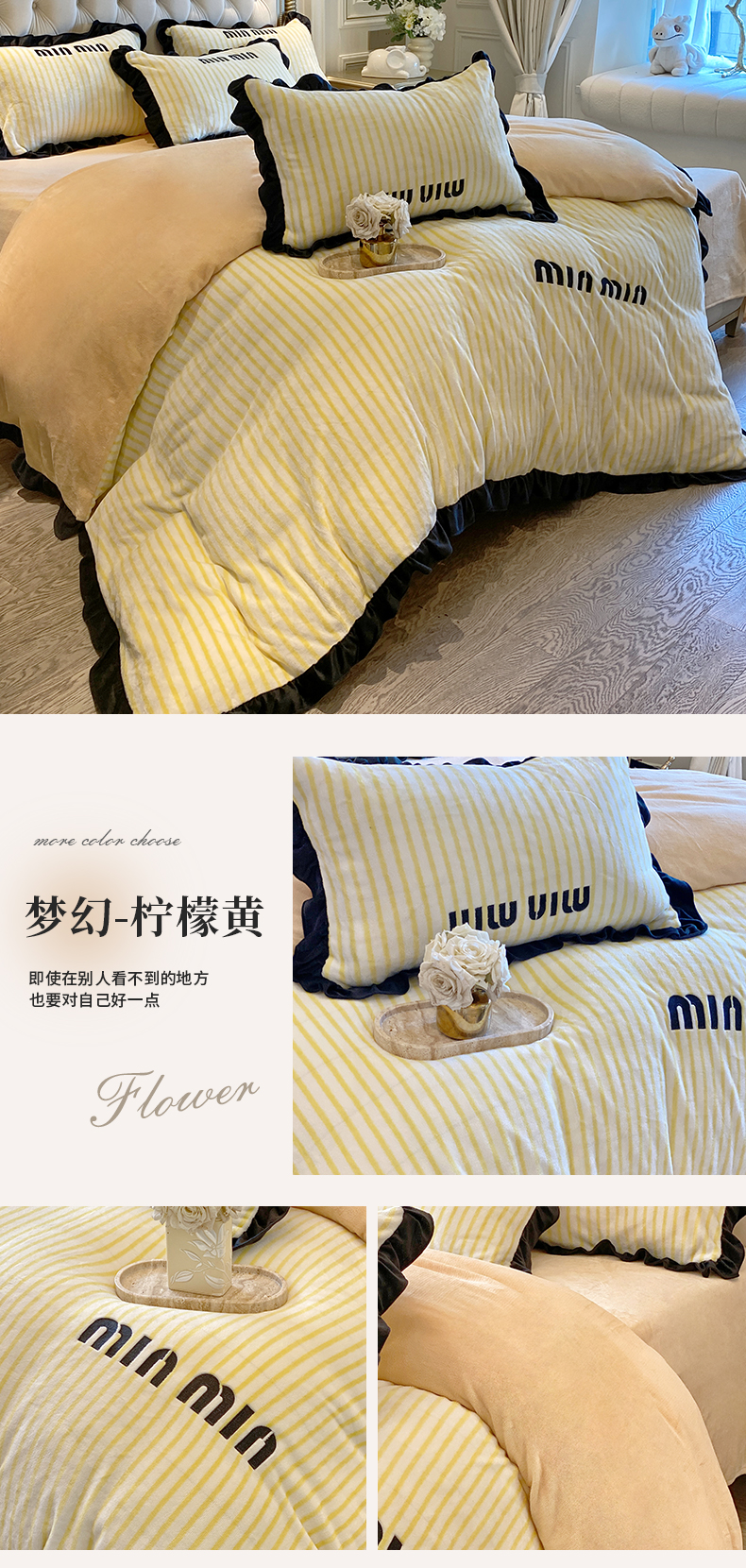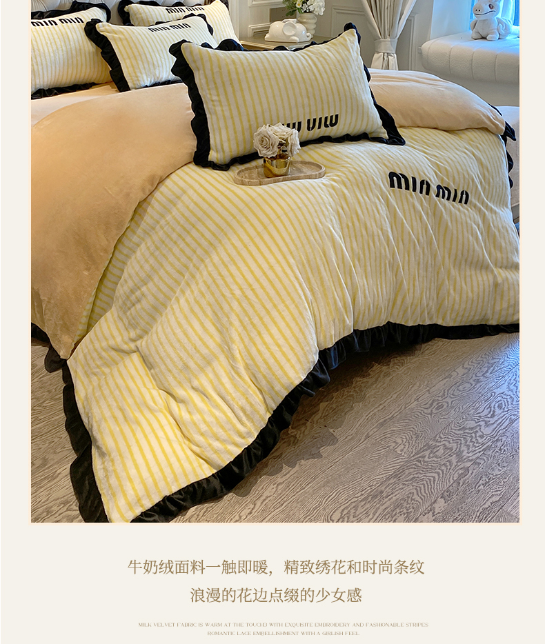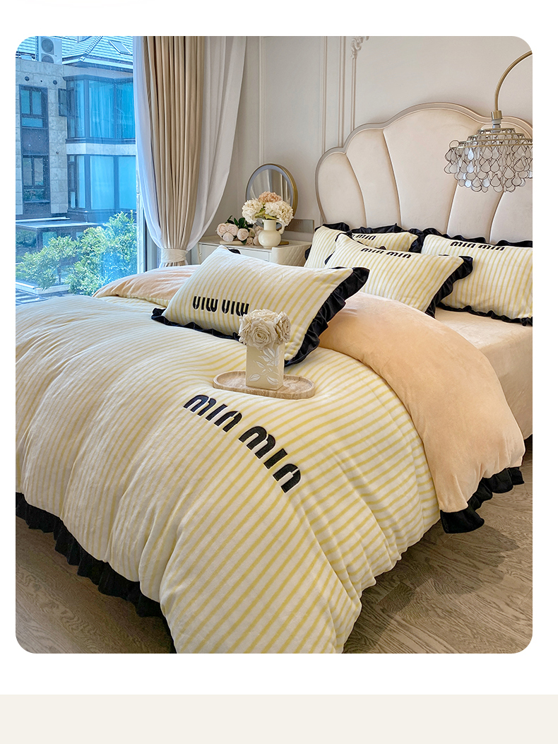 苏源家居 2024新款牛奶绒条纹ins风韩版黑色花边公主风四件套 梦幻-柠檬黄
