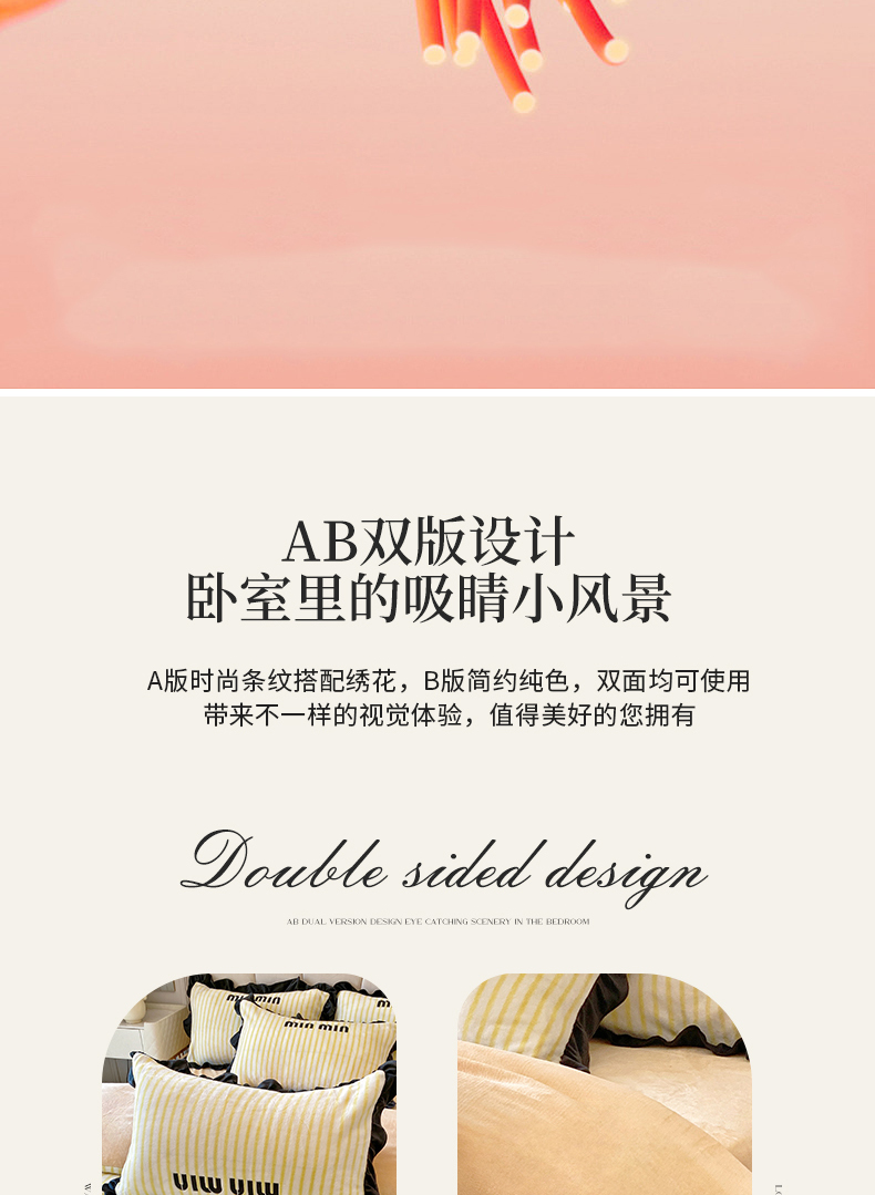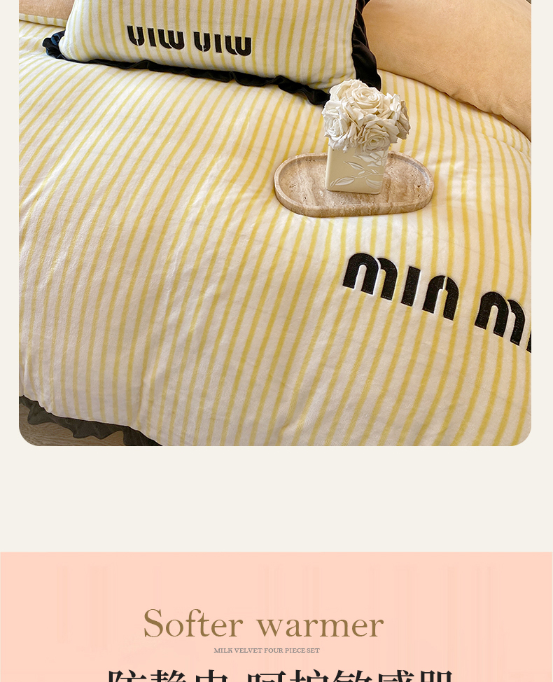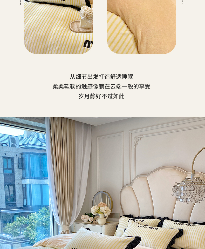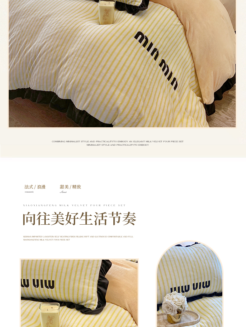 商品名称:苏源家居 2024新款牛奶绒条纹ins风韩版黑色花边公主风四件套 梦幻-柠檬黄