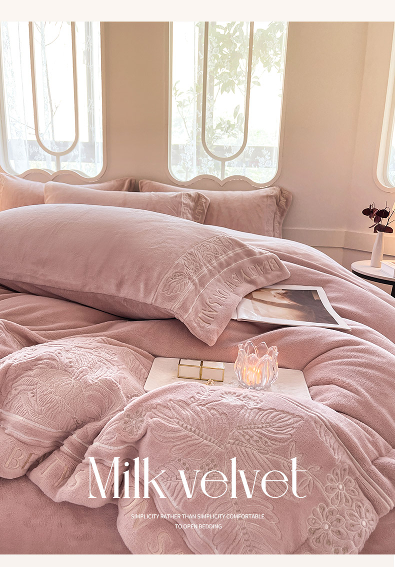 秋冬款9斤重高级感雕花牛奶绒四件套加厚珊瑚绒加绒被套床单床笠床上用品 乔伊-蜜豆红