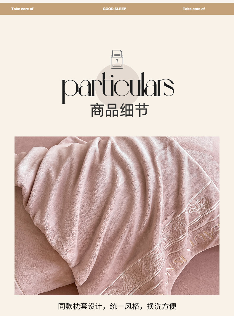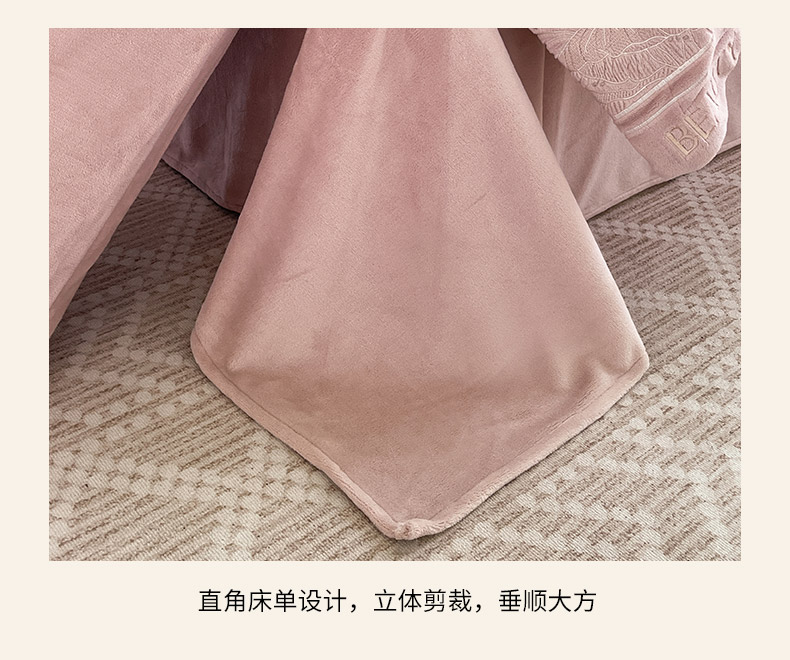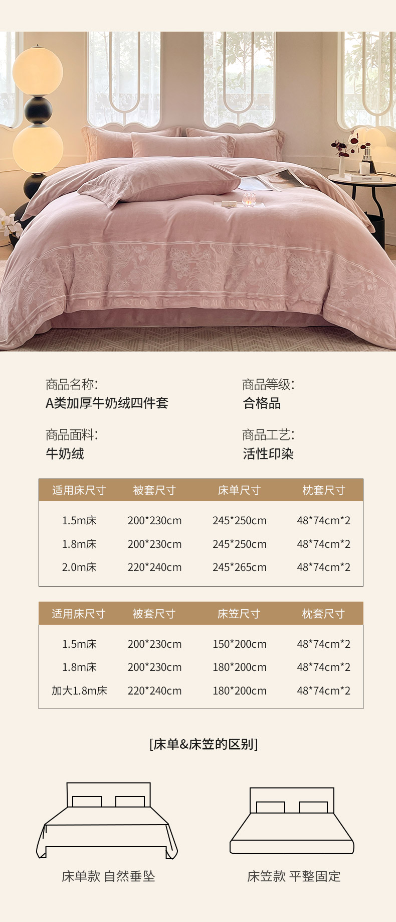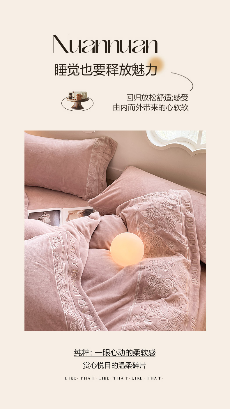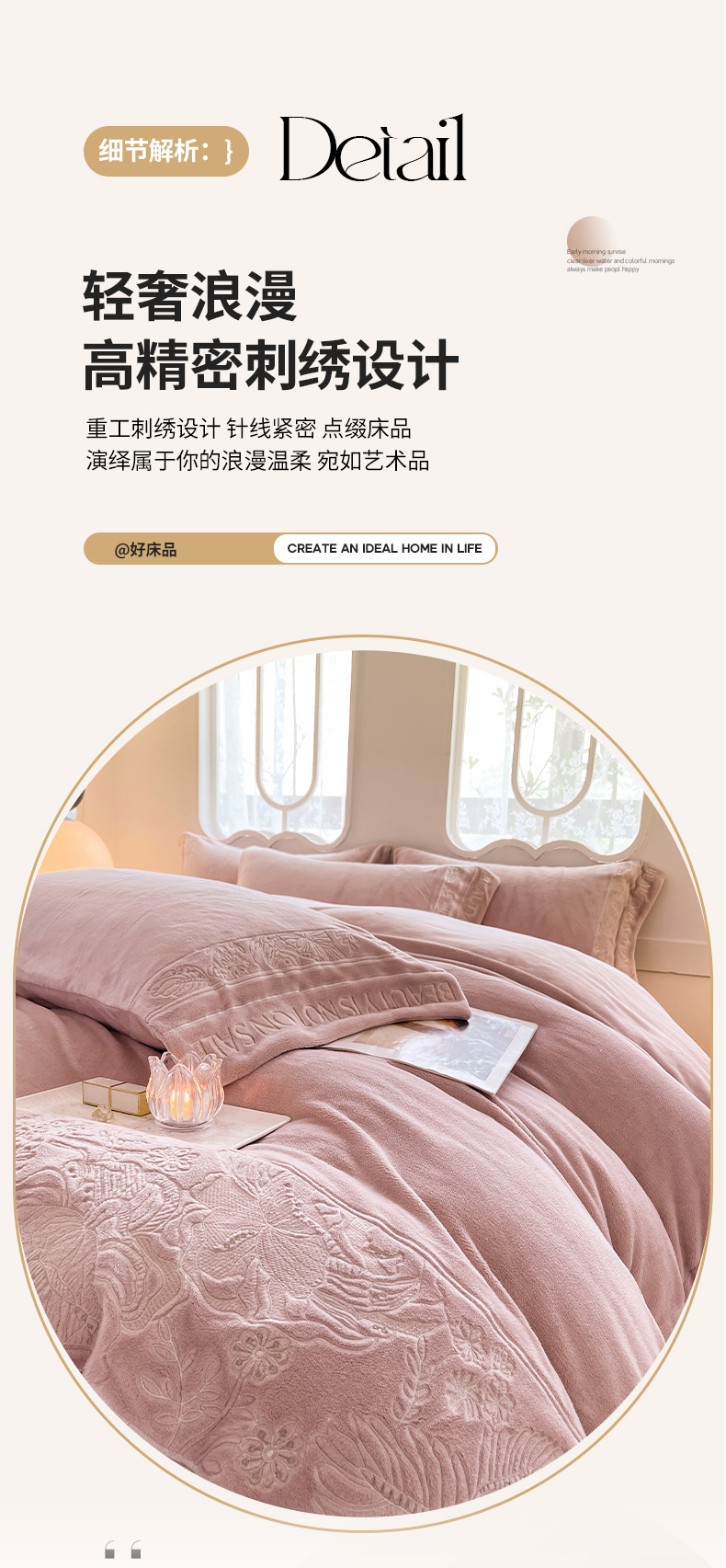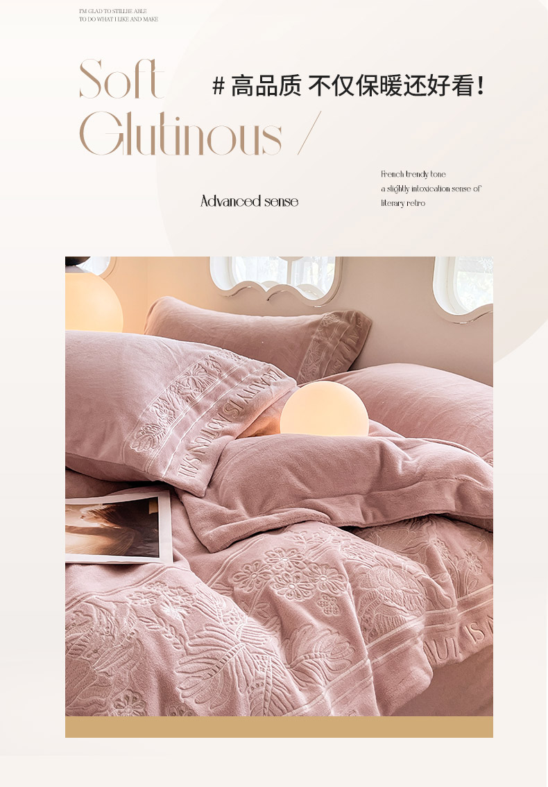 商品名称:秋冬款9斤重高级感雕花牛奶绒四件套加厚珊瑚绒加绒被套床单床笠床上用品 乔伊-蜜豆红