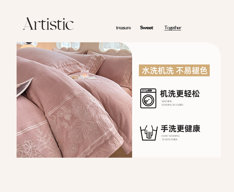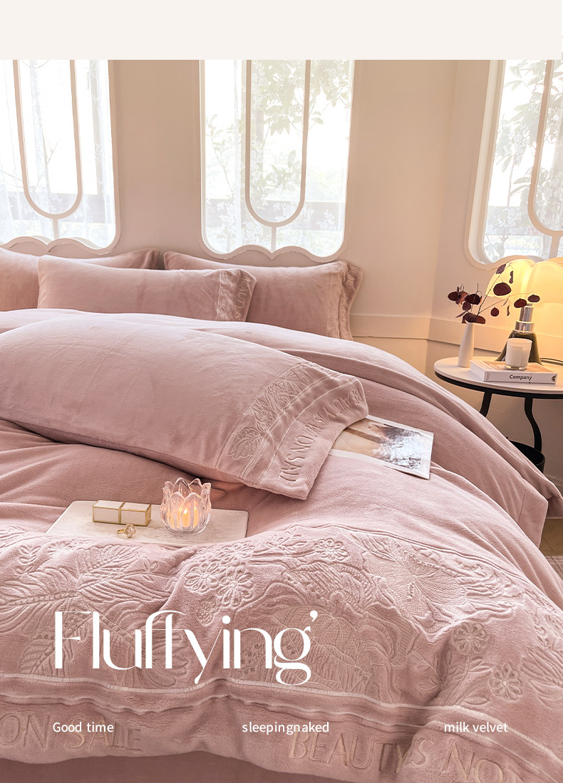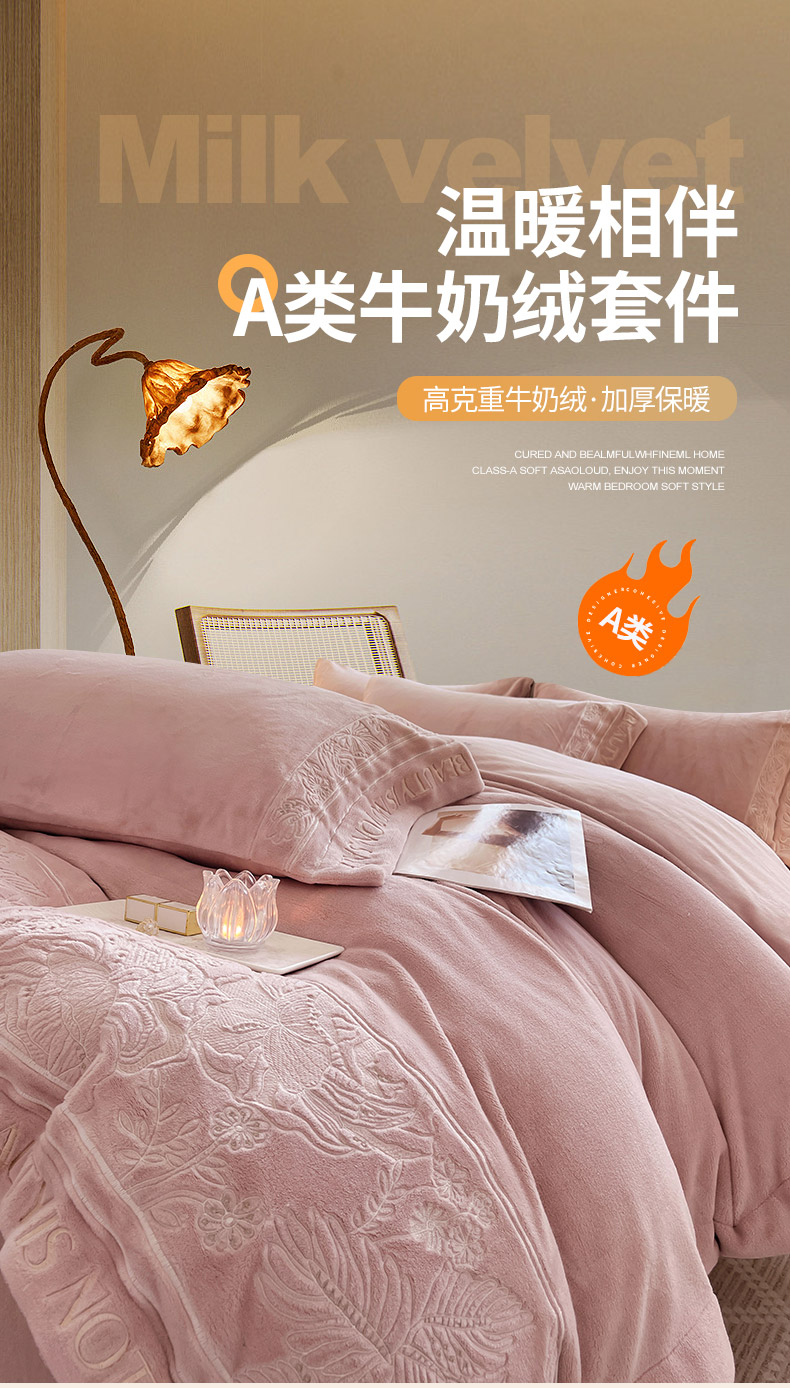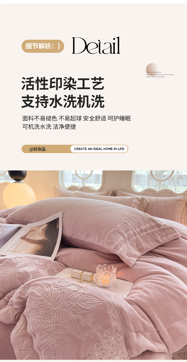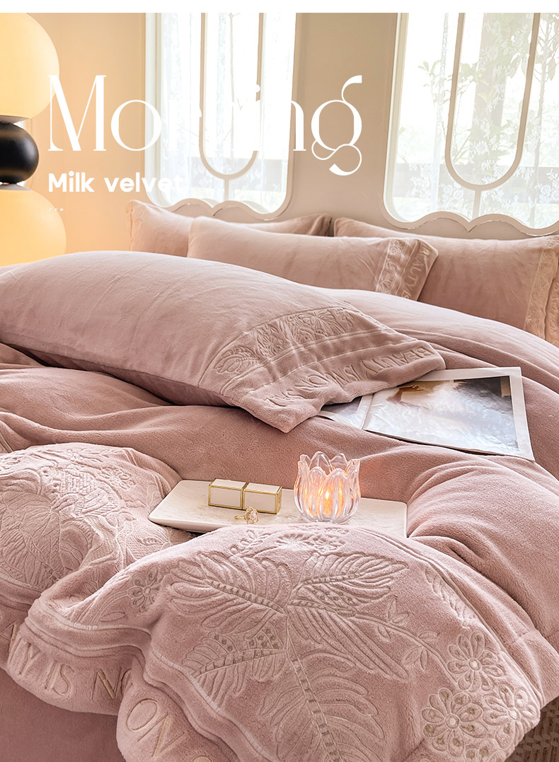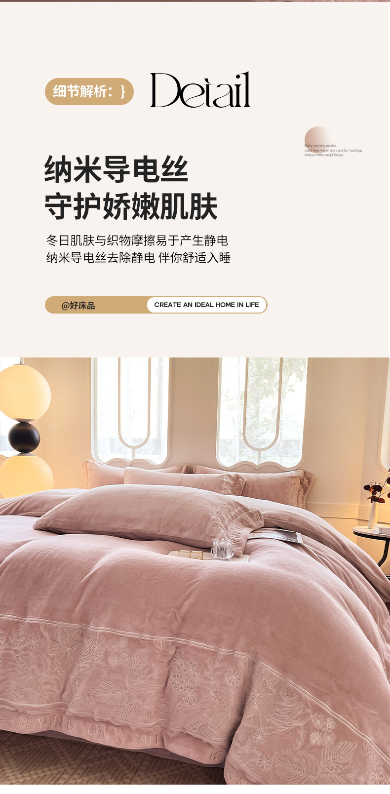 商品名称:秋冬款9斤重高级感雕花牛奶绒四件套加厚珊瑚绒加绒被套床单床笠床上用品 乔伊-蜜豆红