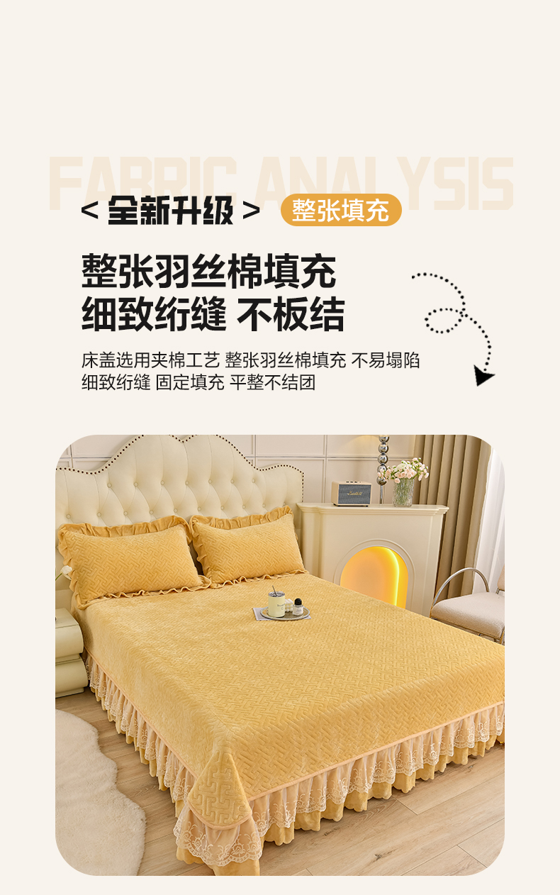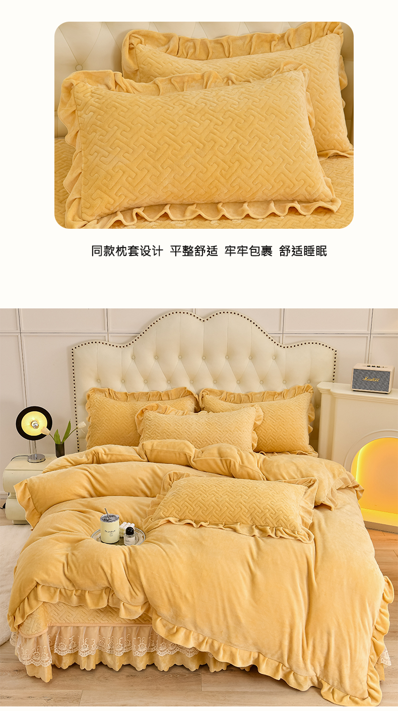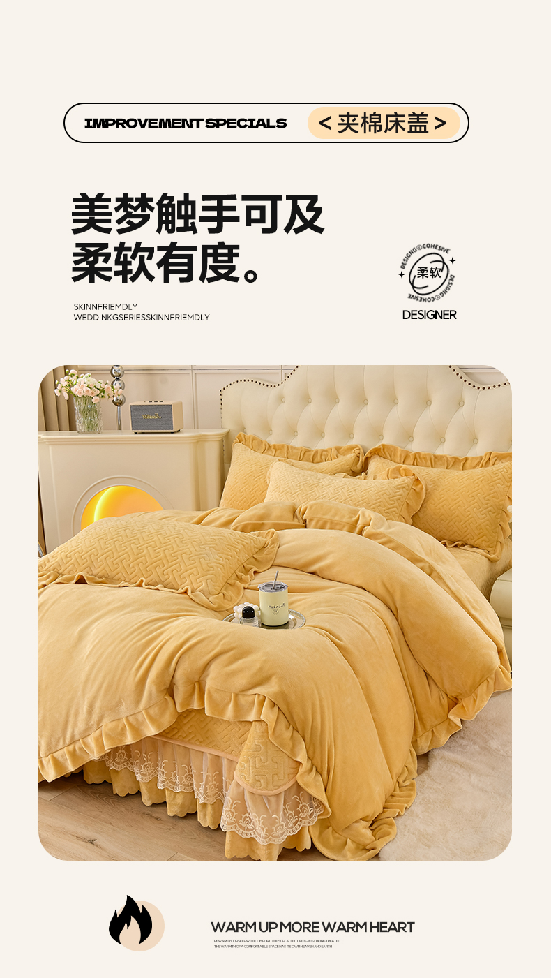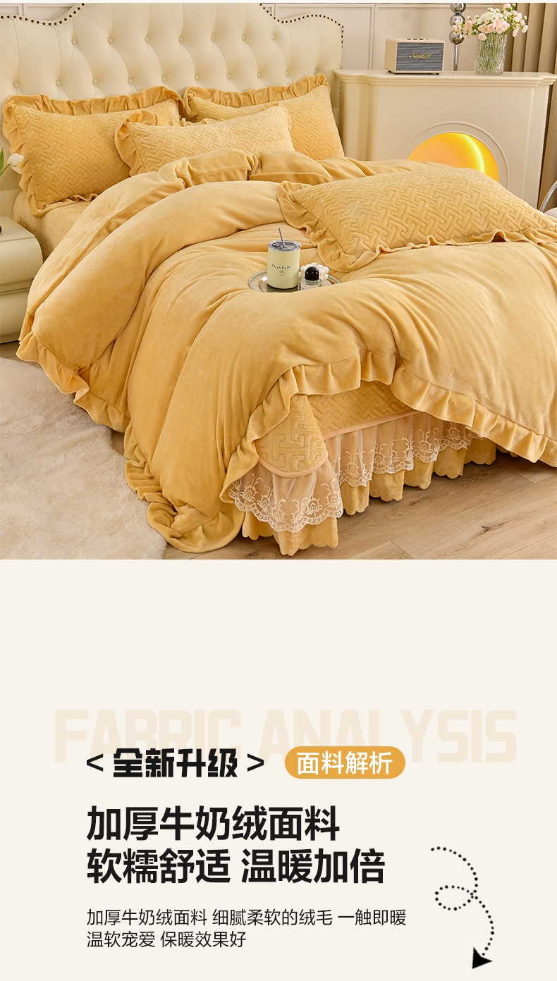 当前位置: 91家纺网 > 商品网购 > 床品套件 > 四件套 > 牛奶绒四件套 > 民新家纺 2025新款牛奶绒印花夹棉床盖四件套倾城-黄