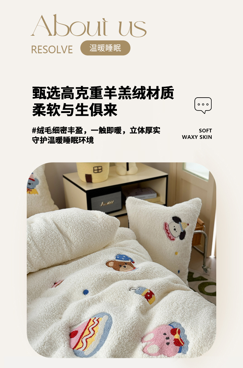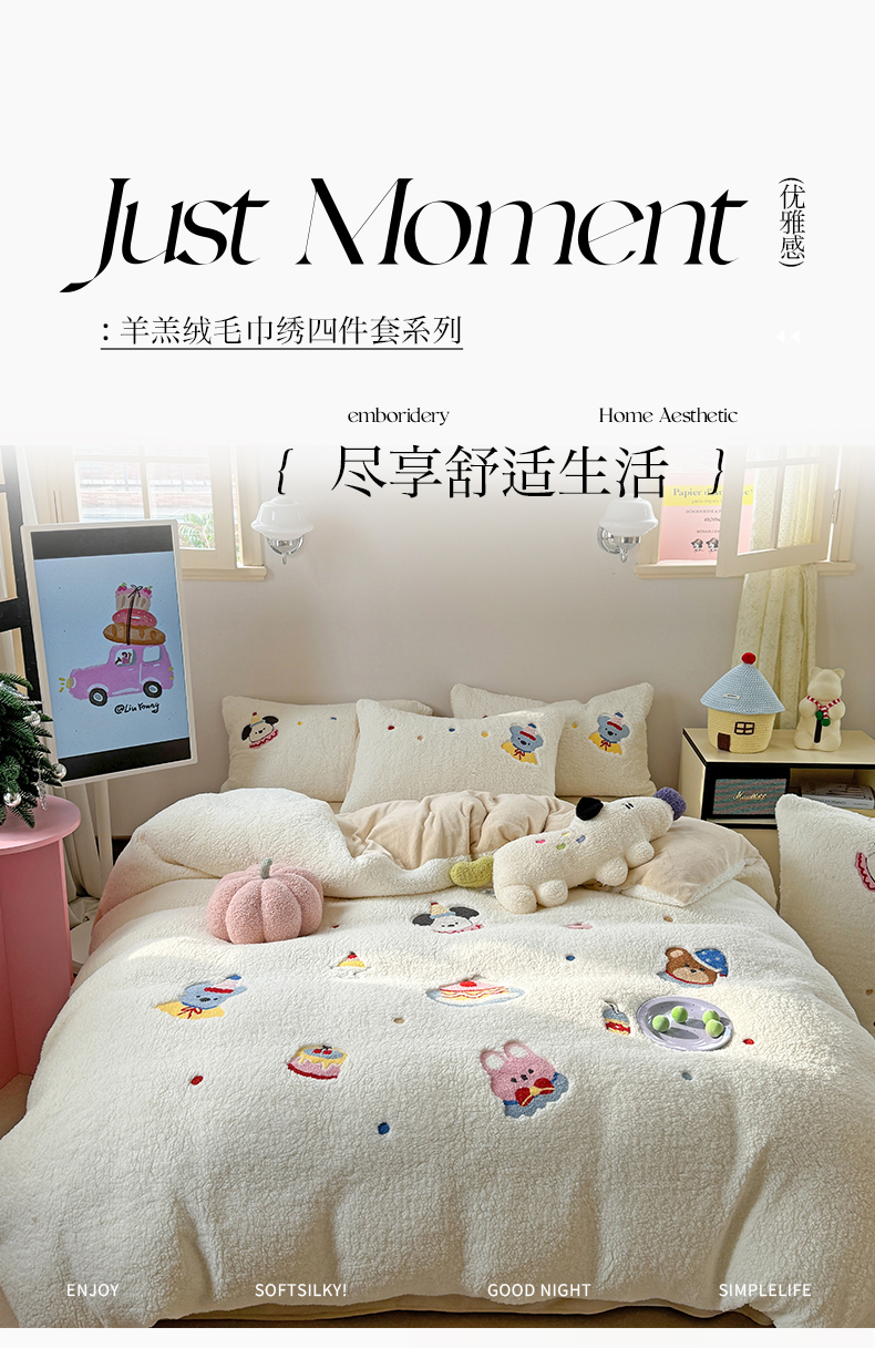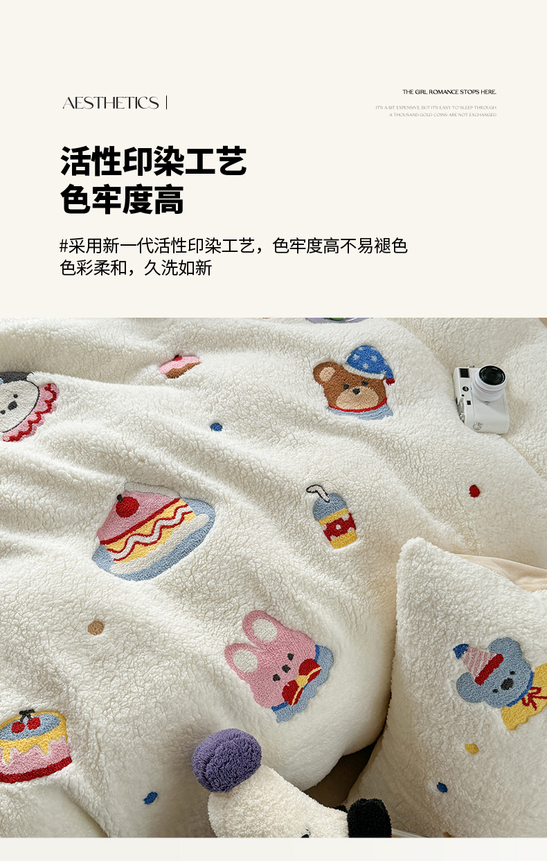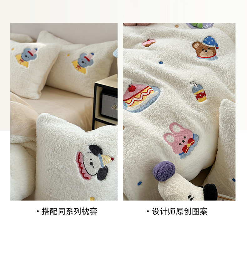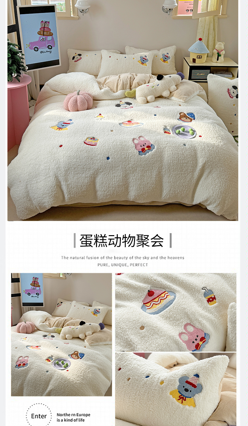 商品名称:眠屿家纺 2025新款羊羔绒毛巾绣四件套 蛋糕动物聚会