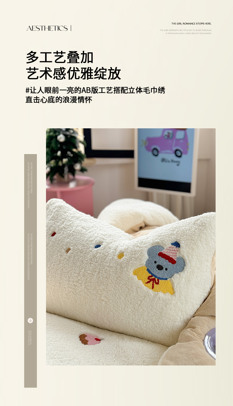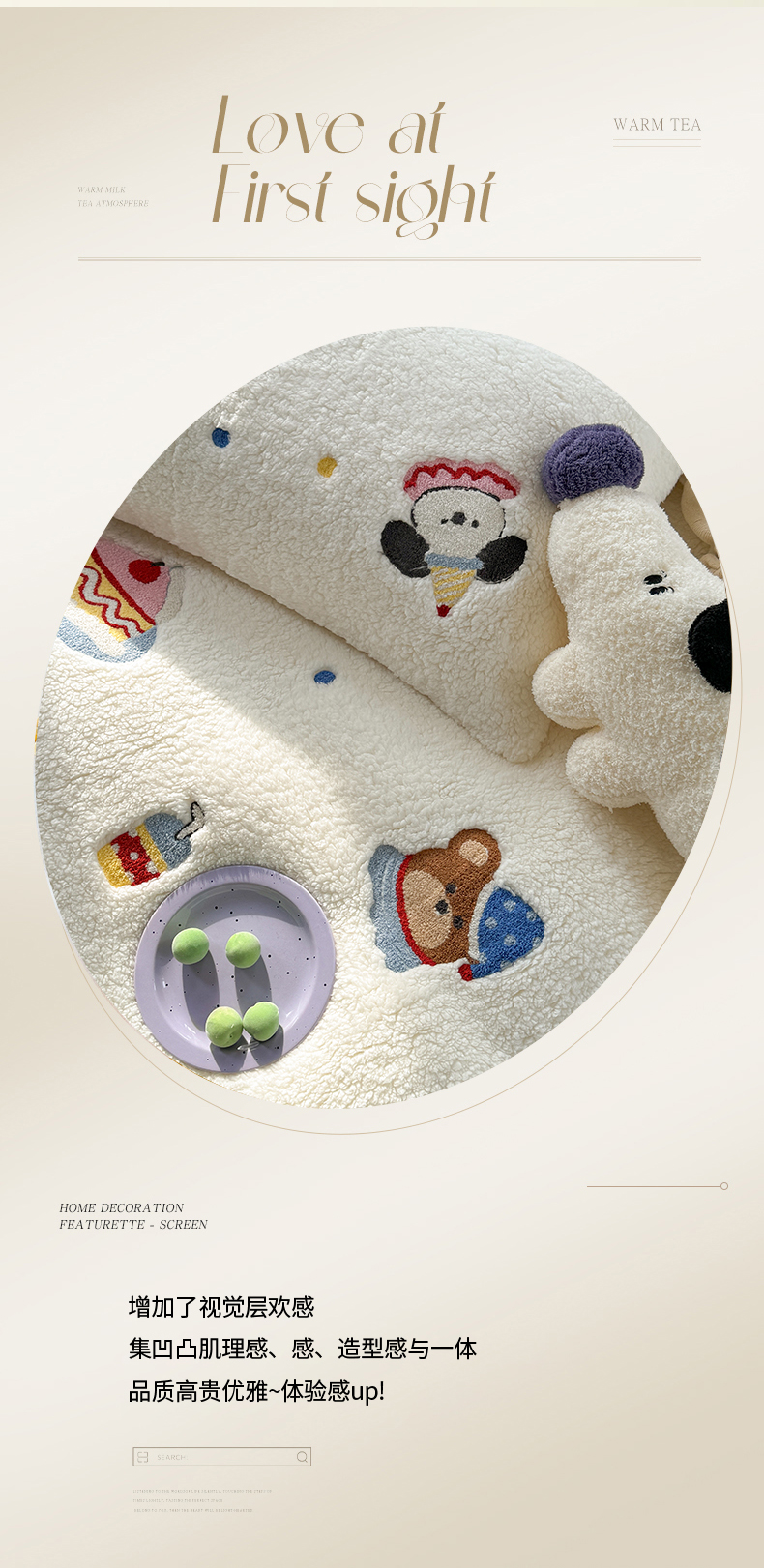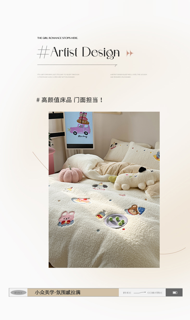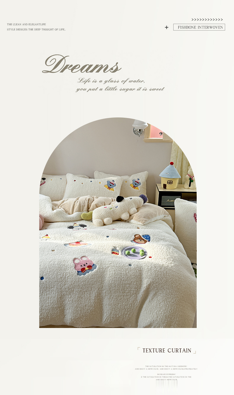 商品名称:眠屿家纺 2025新款羊羔绒毛巾绣四件套 蛋糕动物聚会
