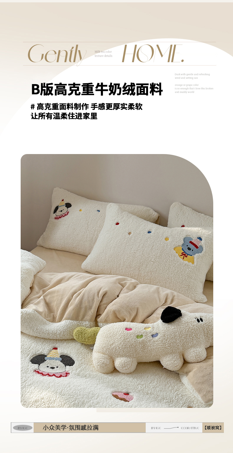 (总)眠屿家纺 2025新款加厚牛奶绒毛巾绣四件套,乐趣,面包狗,玩偶,玩泡泡