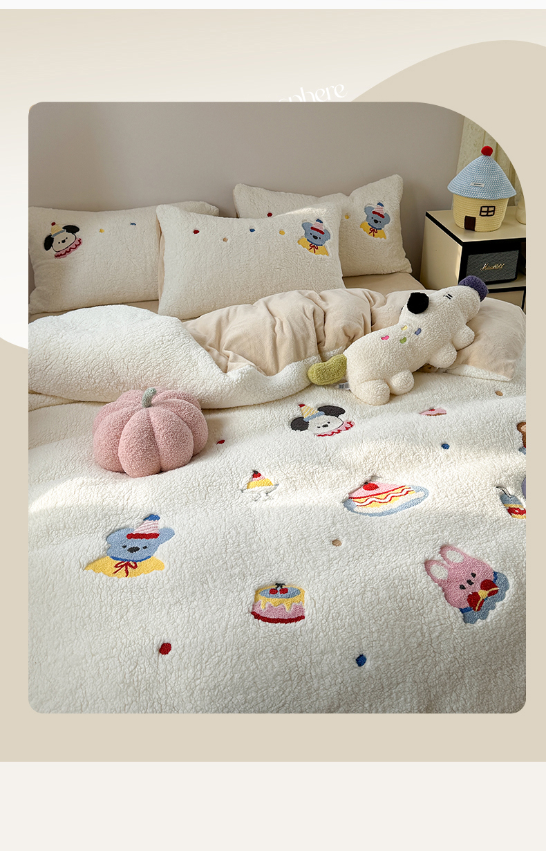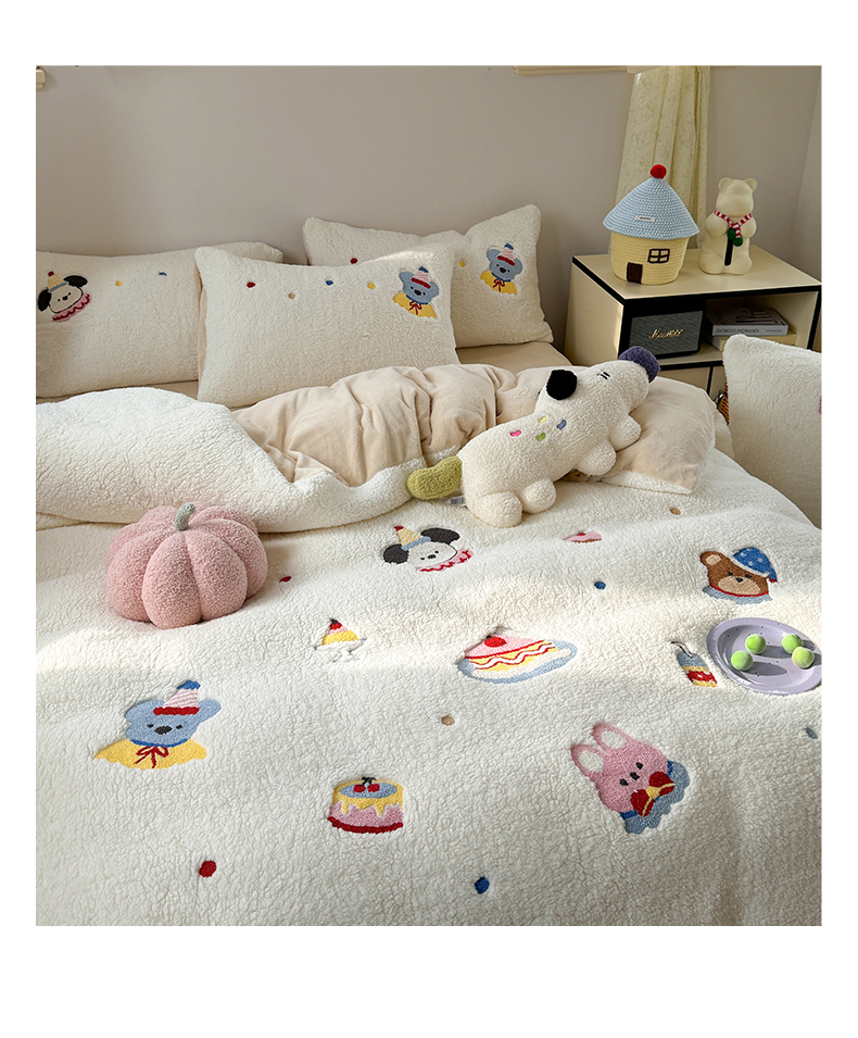 眠屿家纺 2025新款羊羔绒毛巾绣四件套 蛋糕动物聚会