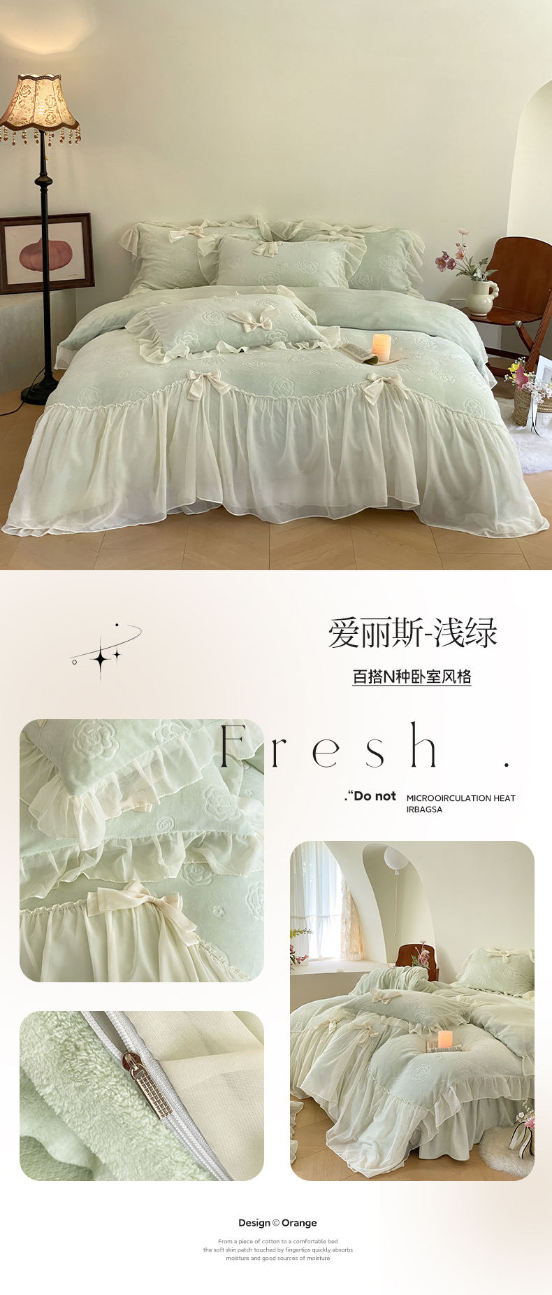 当前位置: 91家纺网 > 商品网购 > 床品套件 > 四件套 > 牛奶绒四件套 > 逸尚阁 2024新款雕花牛奶绒花边四件套-爱丽斯 爱丽斯-浅绿