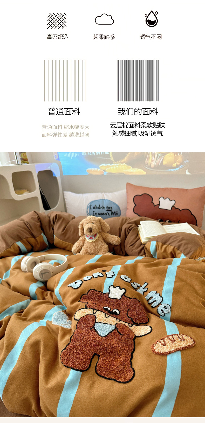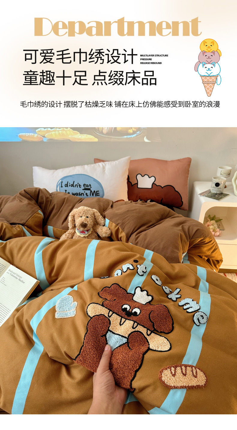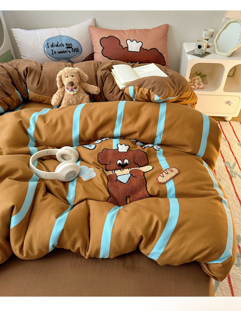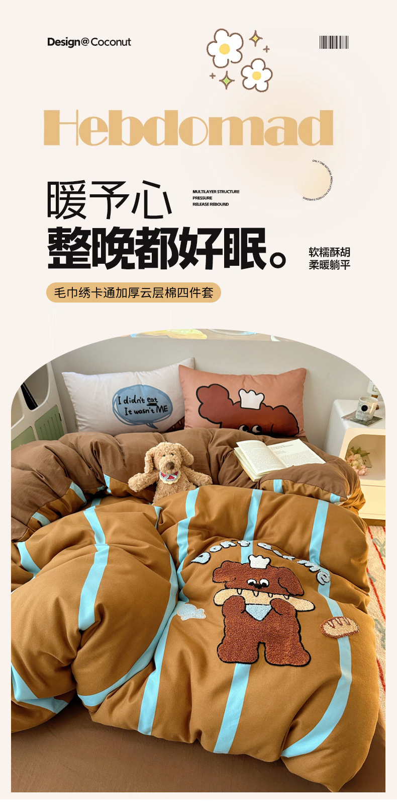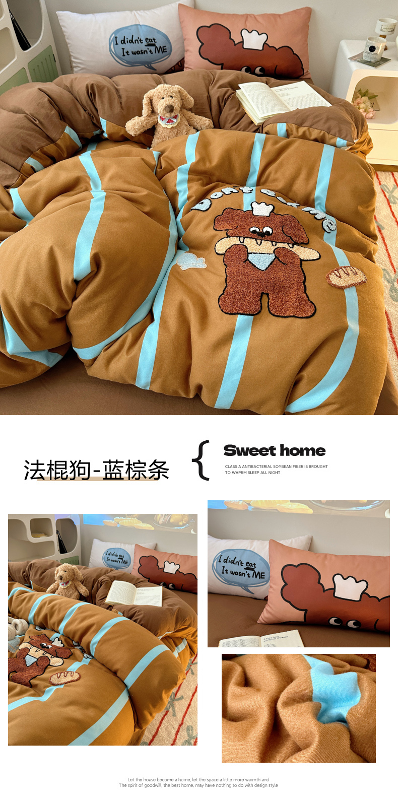 当前位置: 91家纺网 > 商品网购 > 床品套件 > 四件套 > 普通磨毛四件套 > 花伞 2024新款毛巾绣卡通水洗棉磨毛四件套 法棍狗-蓝棕条