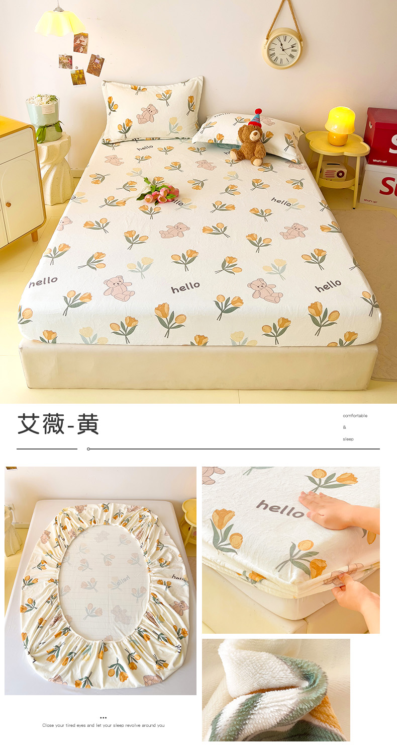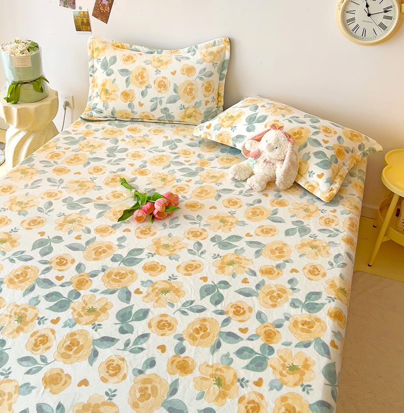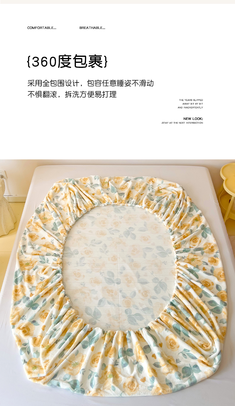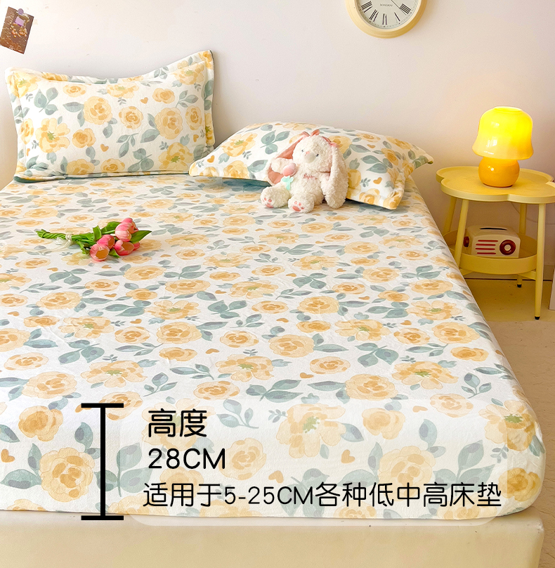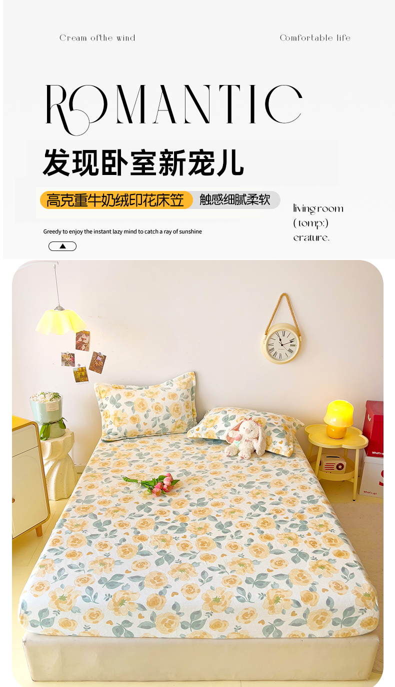 商品名称:大柏树 2025新款A类高克重亲肤舒适牛奶绒印花四件套-单床笠可定制 朵柔-黄