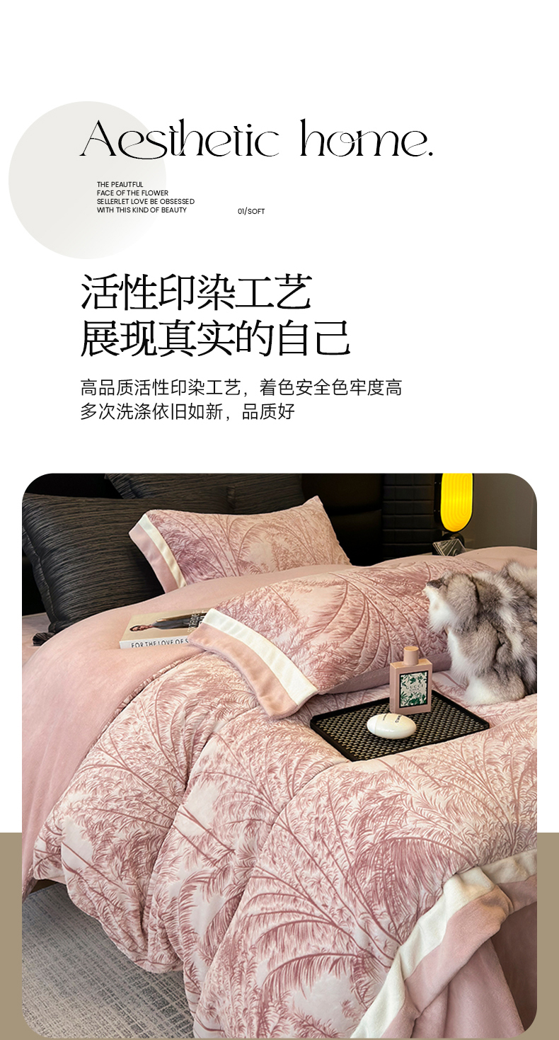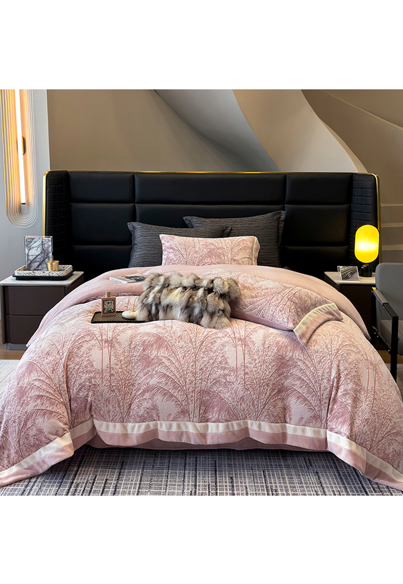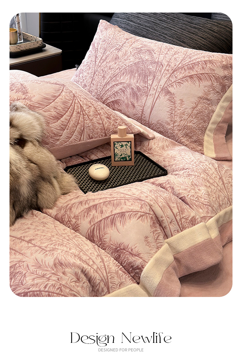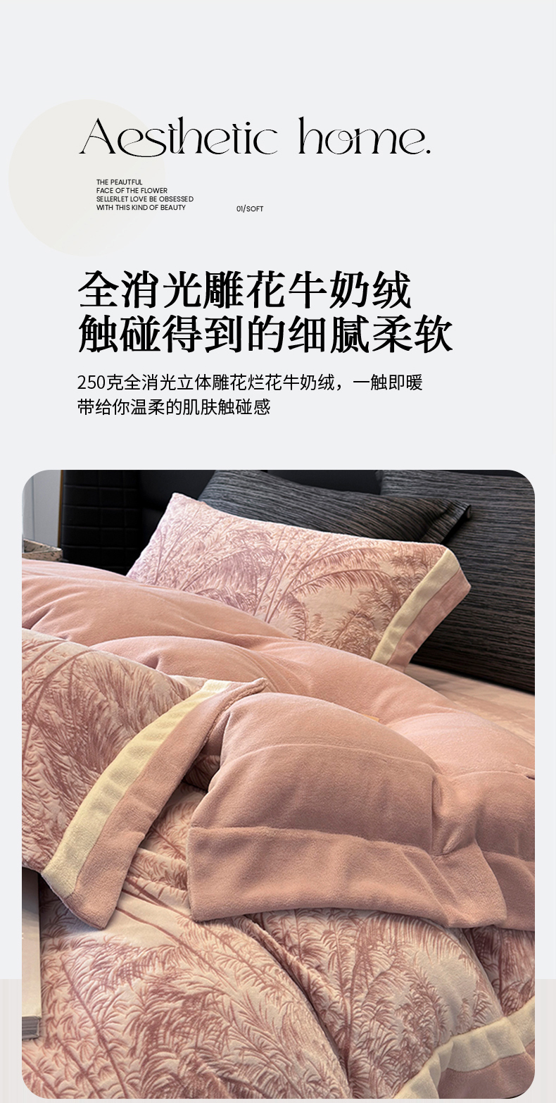 商品名称:若未家居 LOVEWE HOUSE 2025秋冬浪漫双拼角立体着色双色雕花全消光数码印花牛奶绒色烂四件套 南国春风 粉豆沙