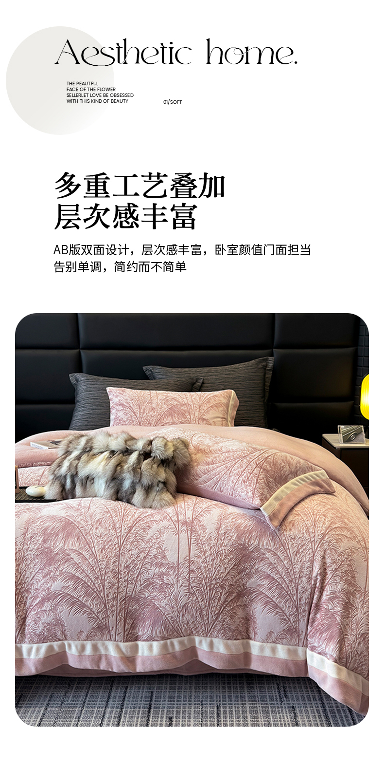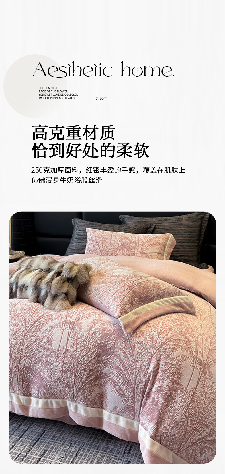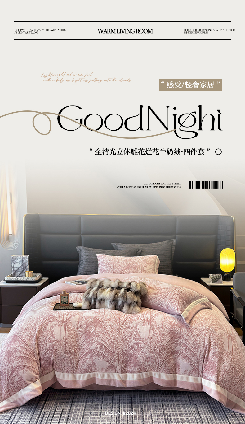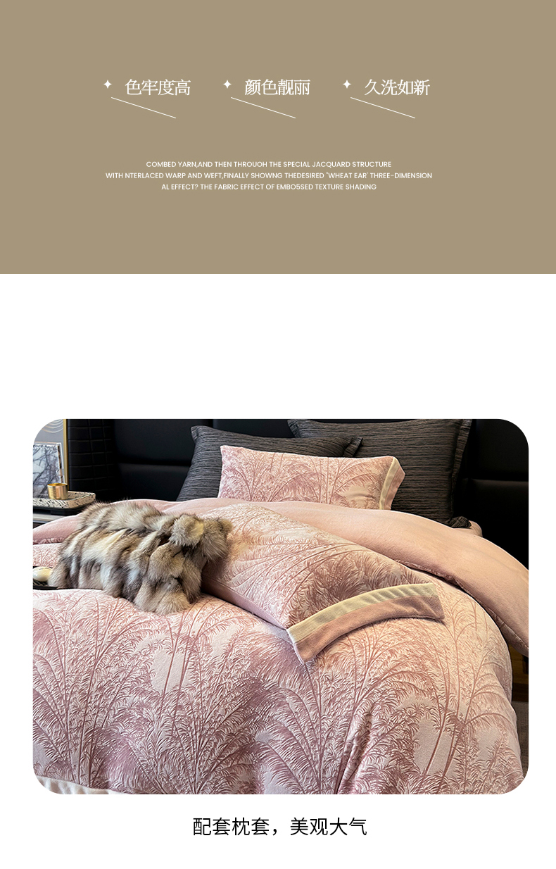 商品名称:若未家居 LOVEWE HOUSE 2025秋冬浪漫双拼角立体着色双色雕花全消光数码印花牛奶绒色烂四件套 南国春风 粉豆沙