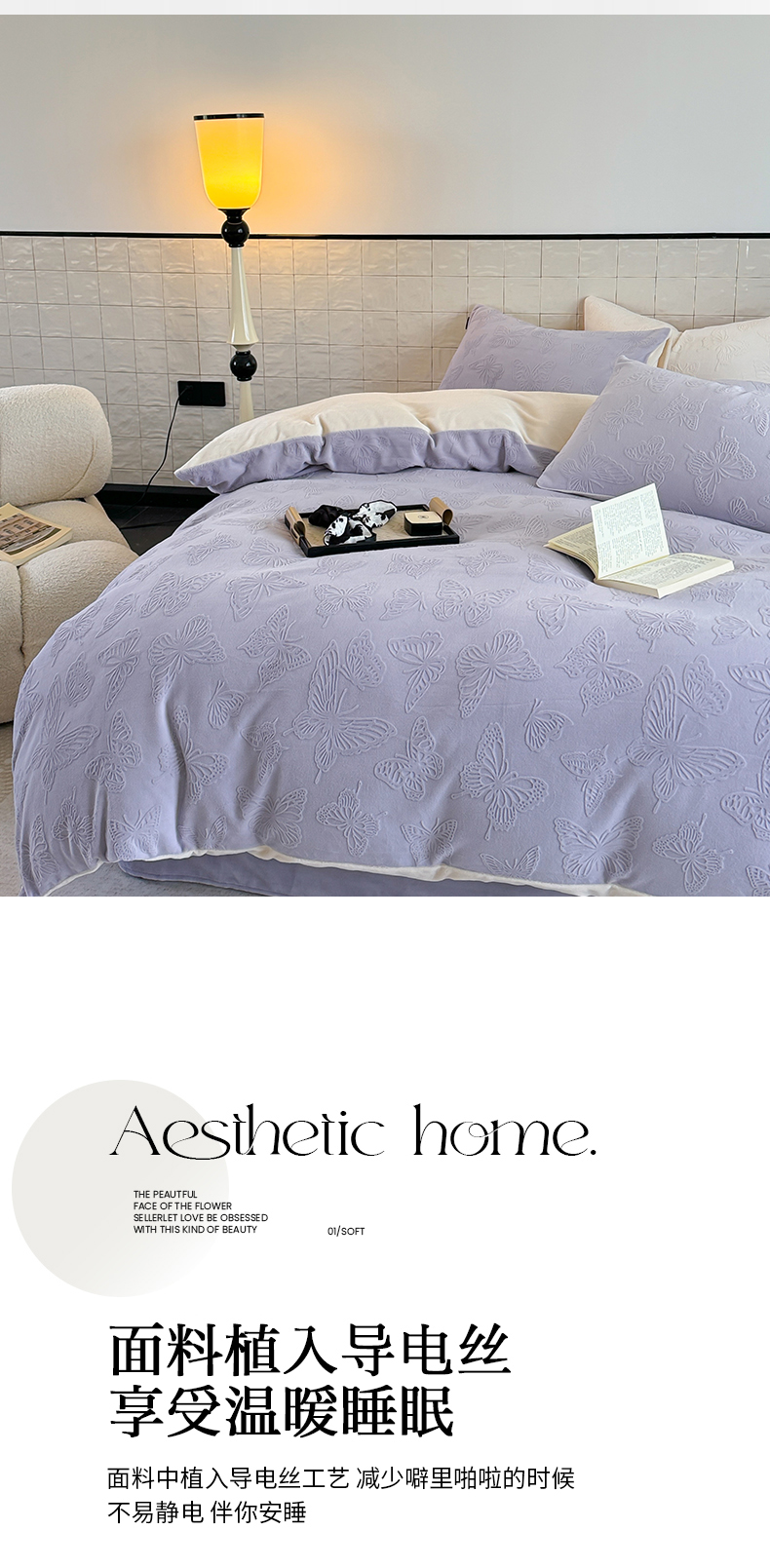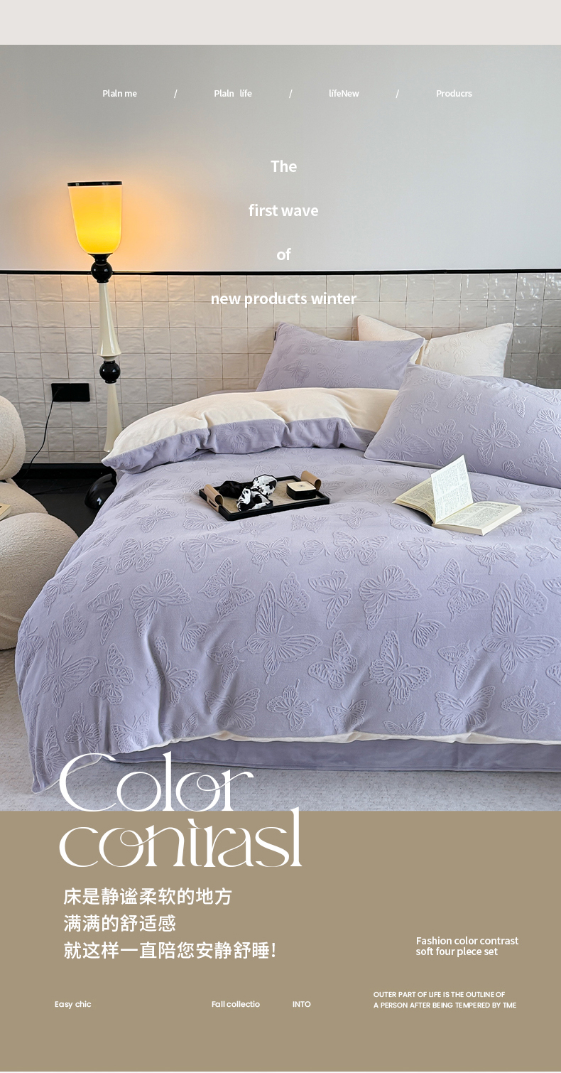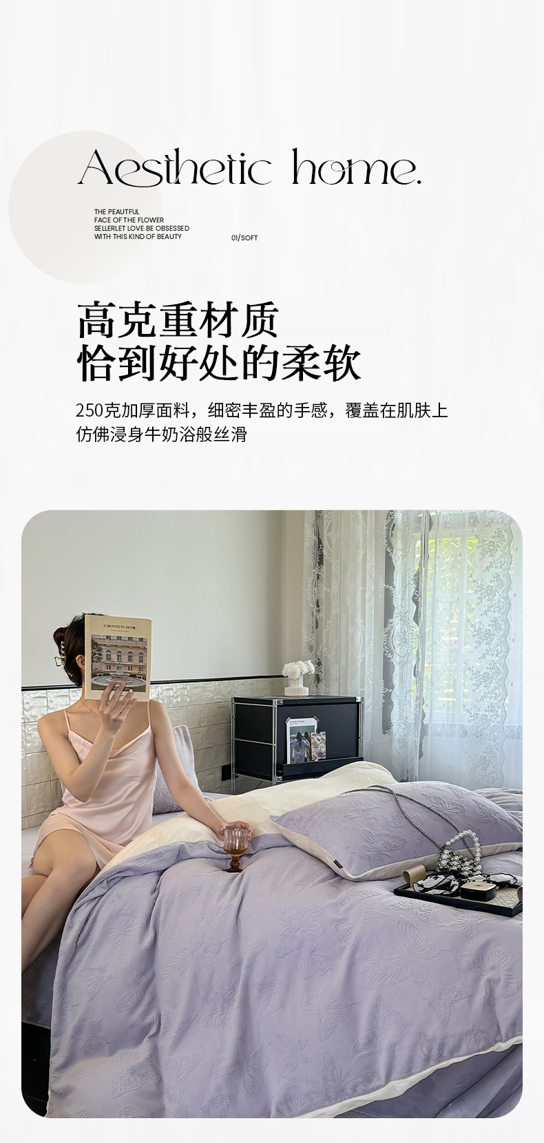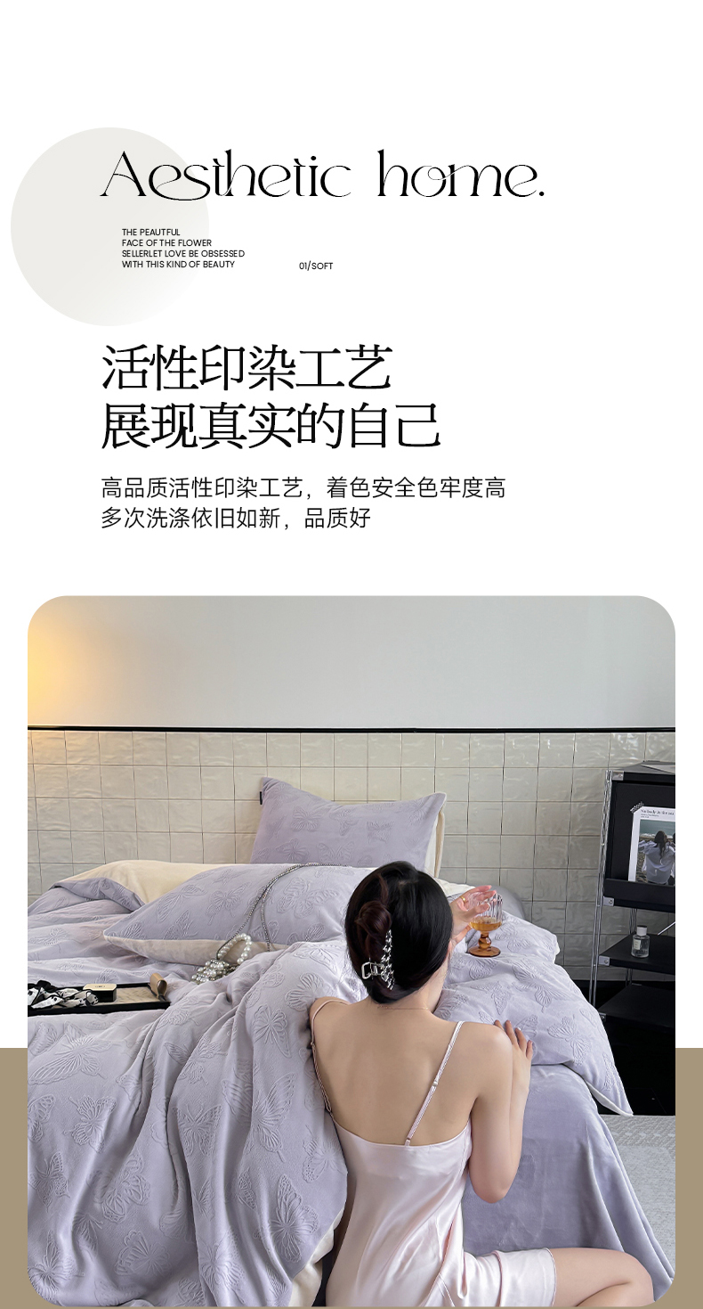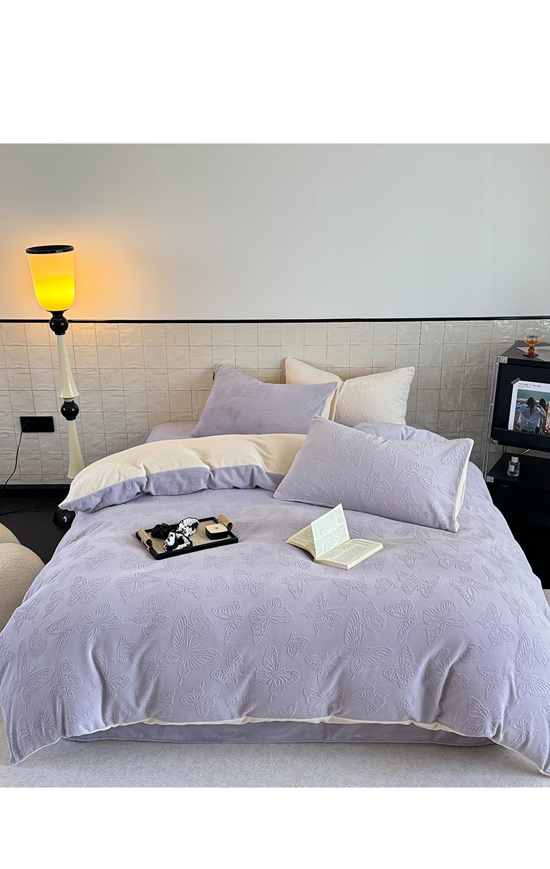 商品名称:若未家居 LOVEWE HOUSE 2025新款AB版250克全消光立体雕花烂花牛奶绒四件套-蝶舞 蝶舞-紫拼米