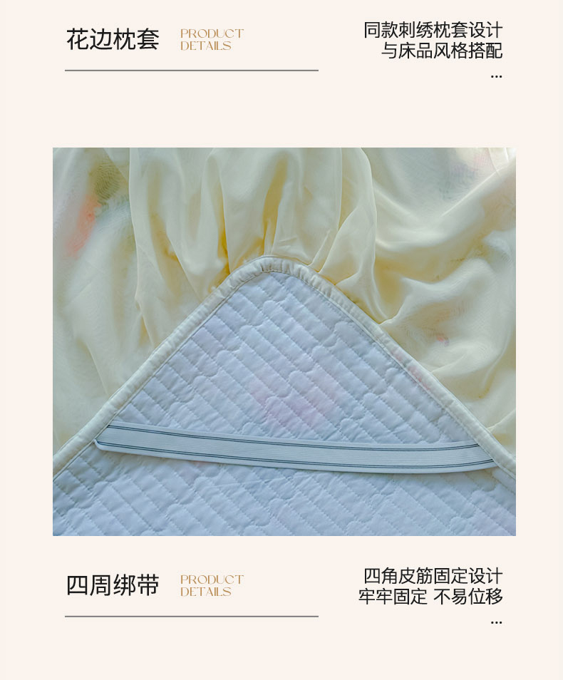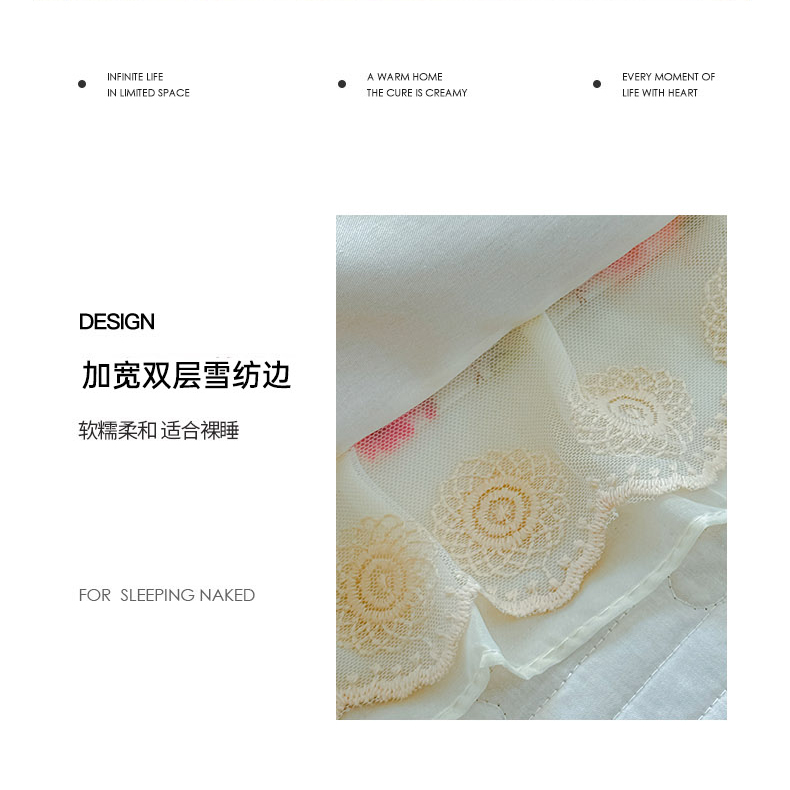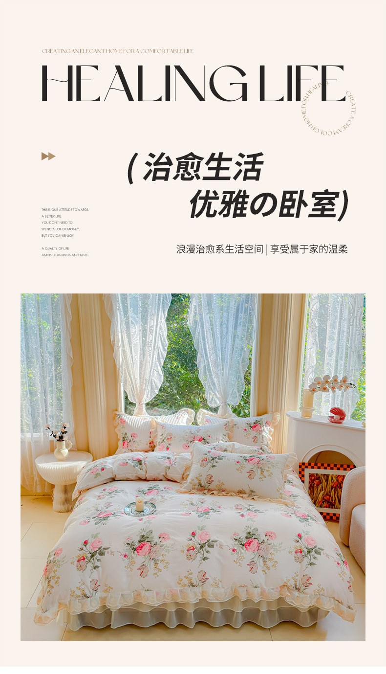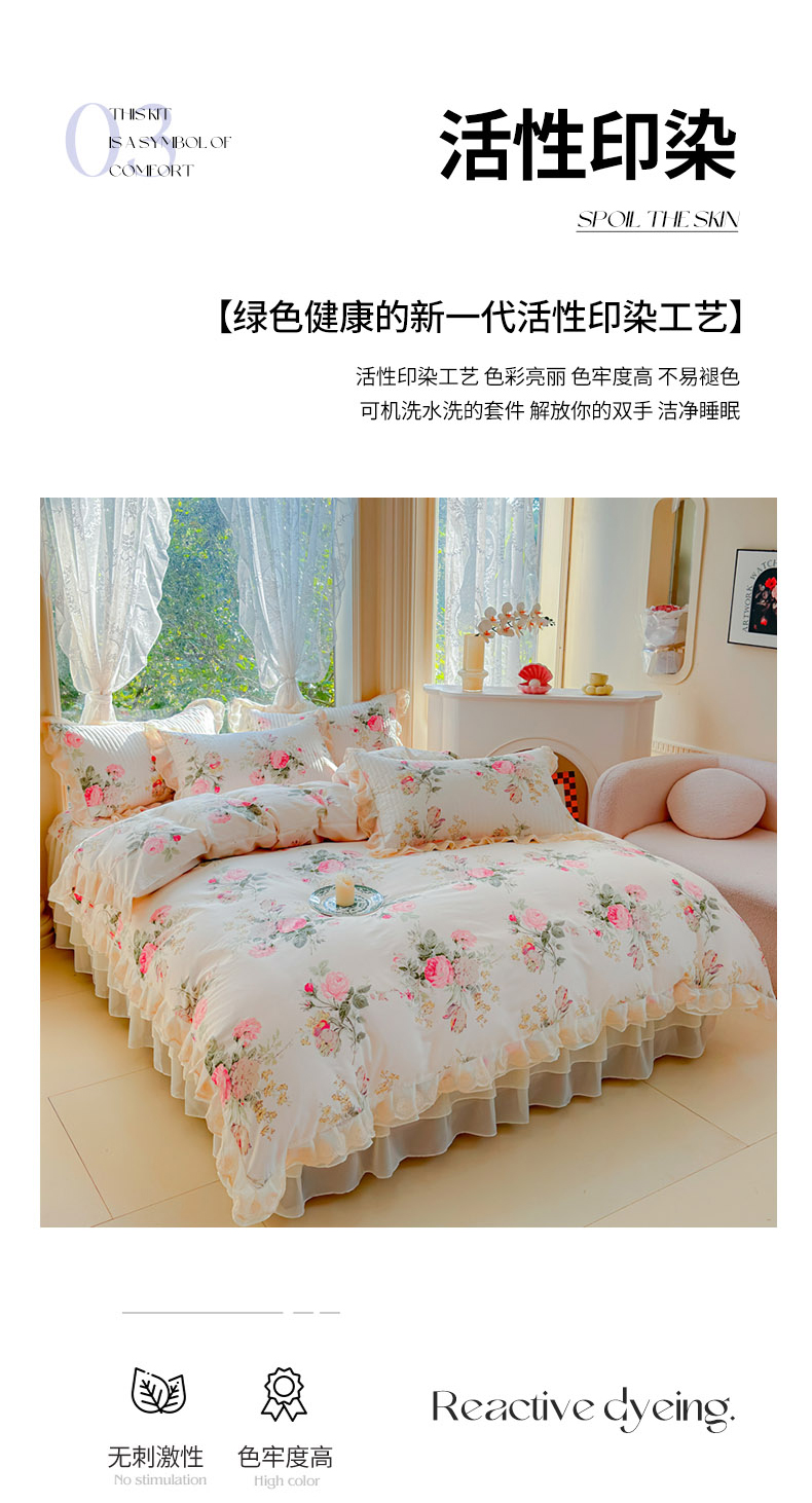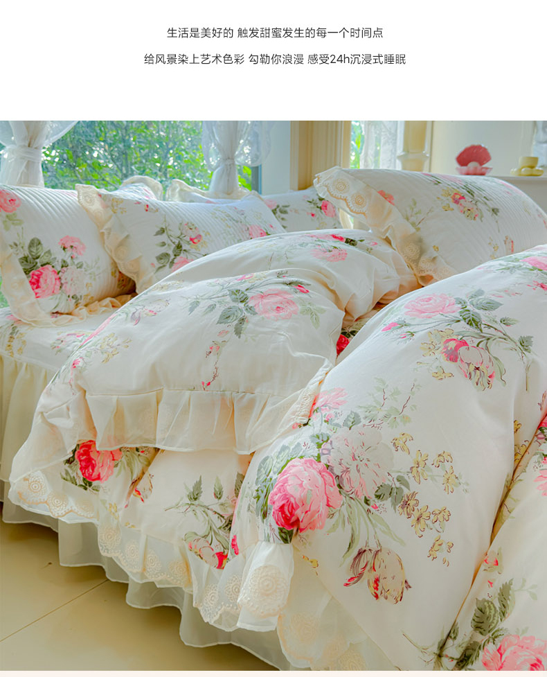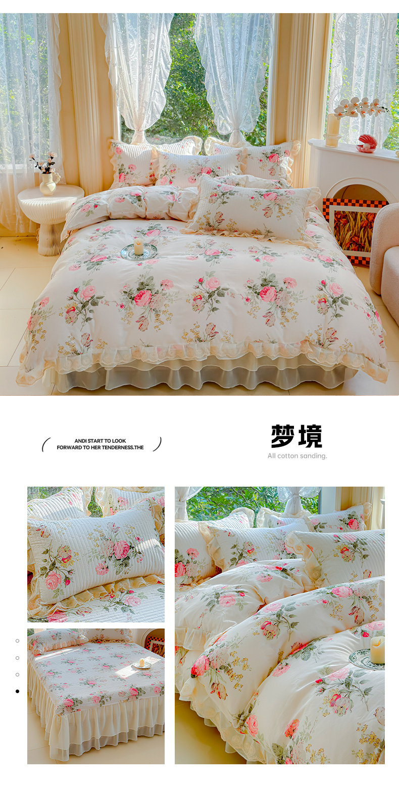 当前位置: 91家纺网 > 商品网购 > 床品套件 > 四件套 > 全棉普通四件套 > 木兰花 2024新款全棉印花被套蕾丝夹棉床裙款四件套 梦境