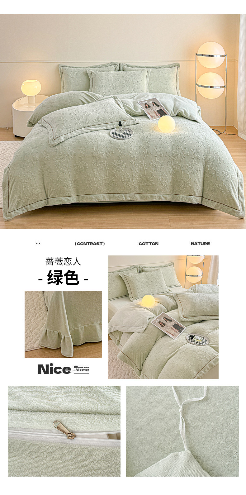 当前位置: 91家纺网 > 商品网购 > 床品套件 > 四件套 > 其它四件套 > (买家秀爆款不断货)A类母婴级牛奶绒雕花四件套珊瑚绒小香风牛奶绒四件套雪花绒四件套雕花绒四件套压线款 蔷薇恋人-绿色