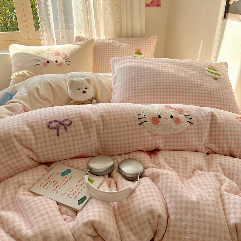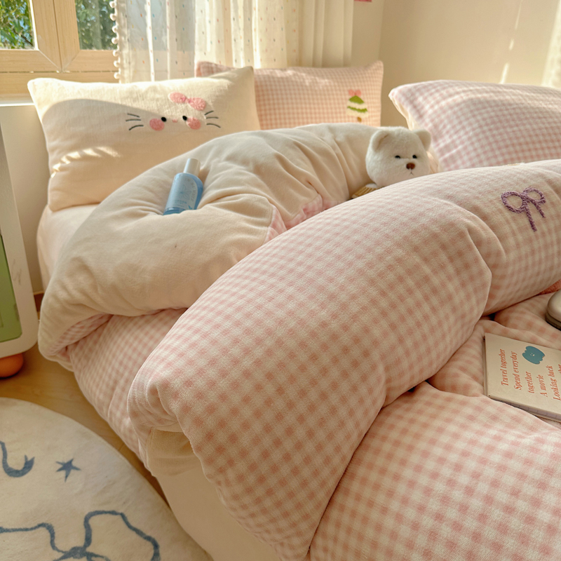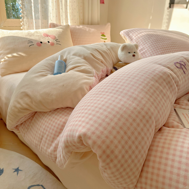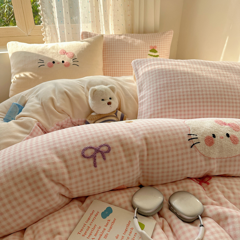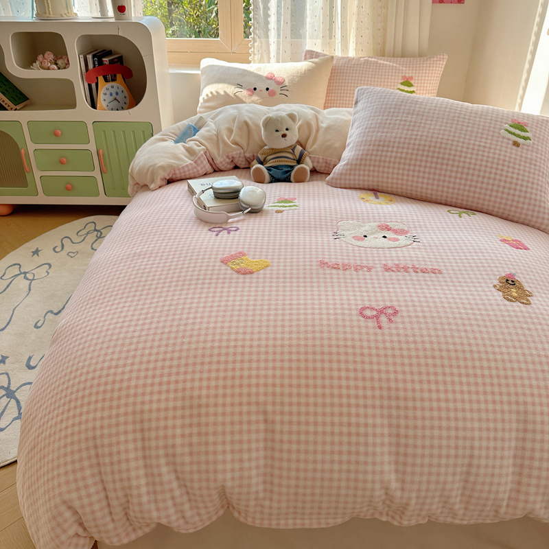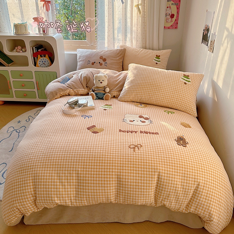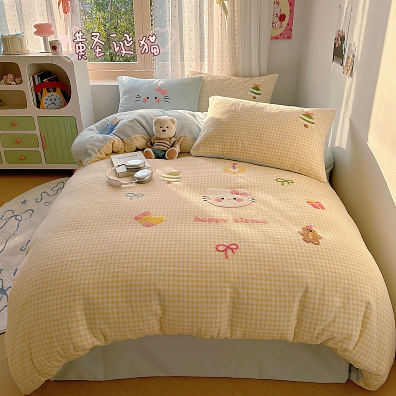 (总)顾里家纺 2024秋冬新款格子猫咪毛巾绣牛奶绒四件套,粉格猫咪,黄格猫咪,咖格猫咪,蓝格猫咪,绿格猫咪