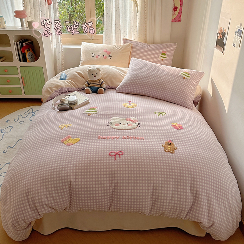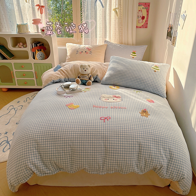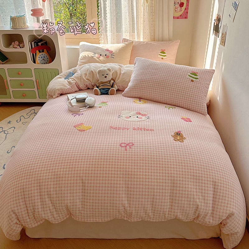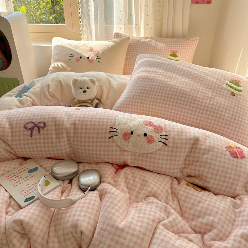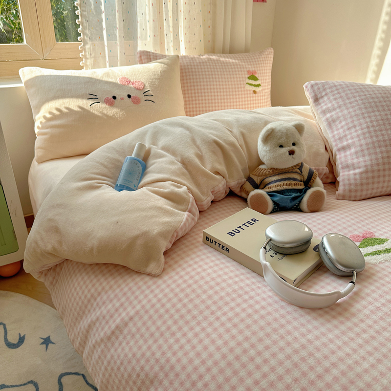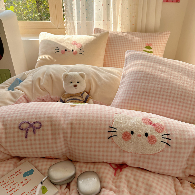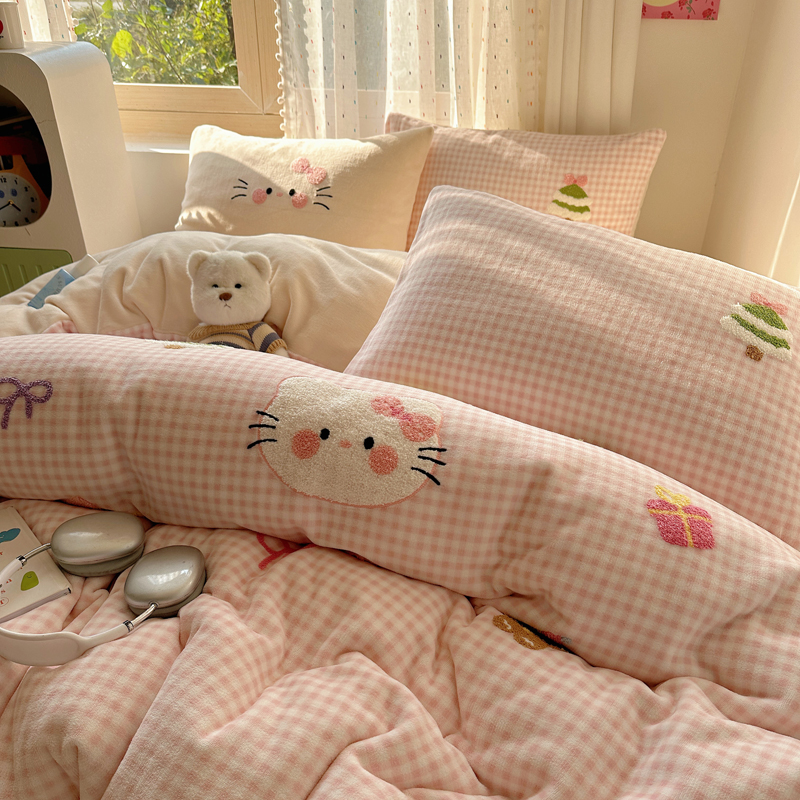 (总)顾里家纺 2024秋冬新款格子猫咪毛巾绣牛奶绒四件套,粉格猫咪,黄格猫咪,咖格猫咪,蓝格猫咪,绿格猫咪