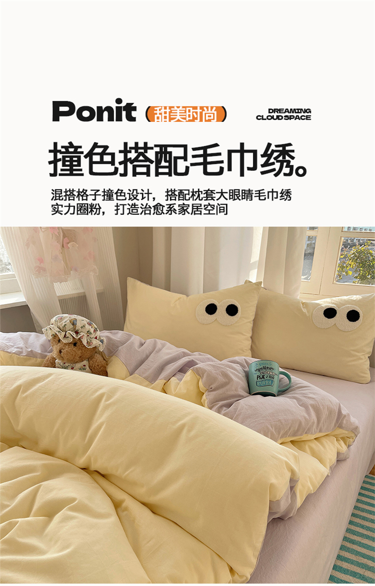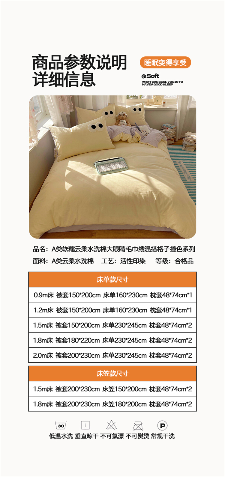 当前位置: 91家纺网 > 商品网购 > 床品套件 > 四件套 > 水洗棉四件套 > 2025新款A类亲肤舒适软糯云柔水洗棉大眼睛毛巾绣混搭格子撞色系列四件套 大眼奶油葡萄