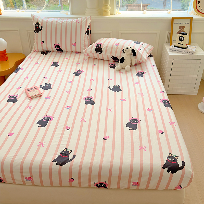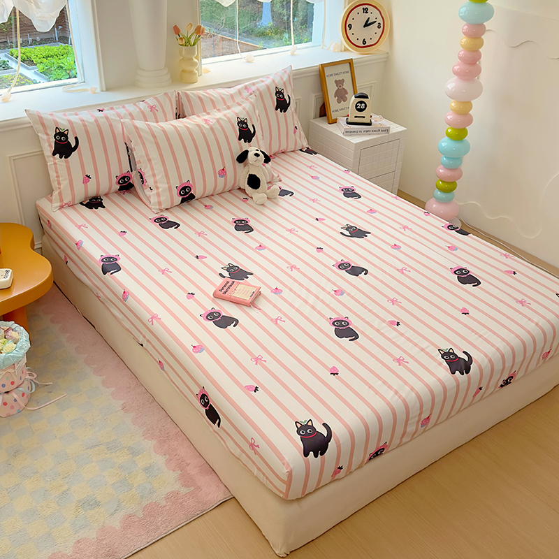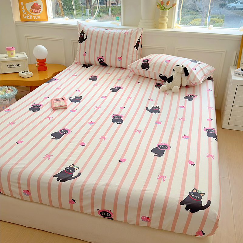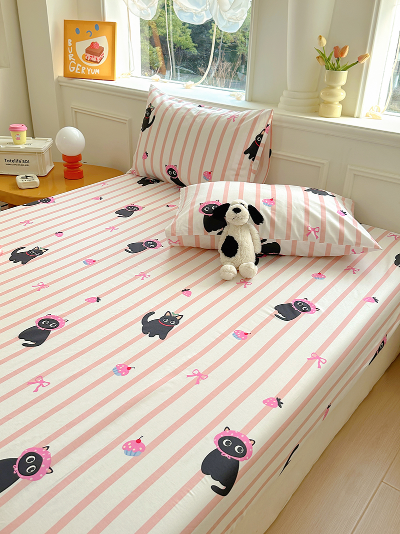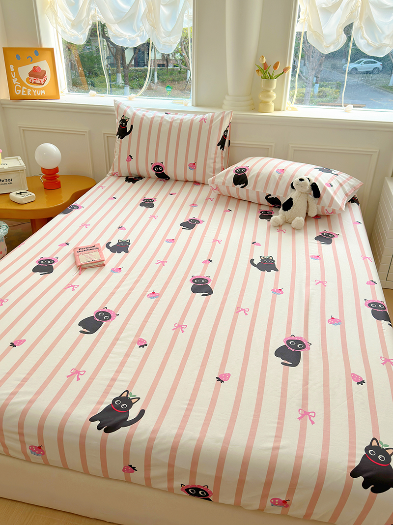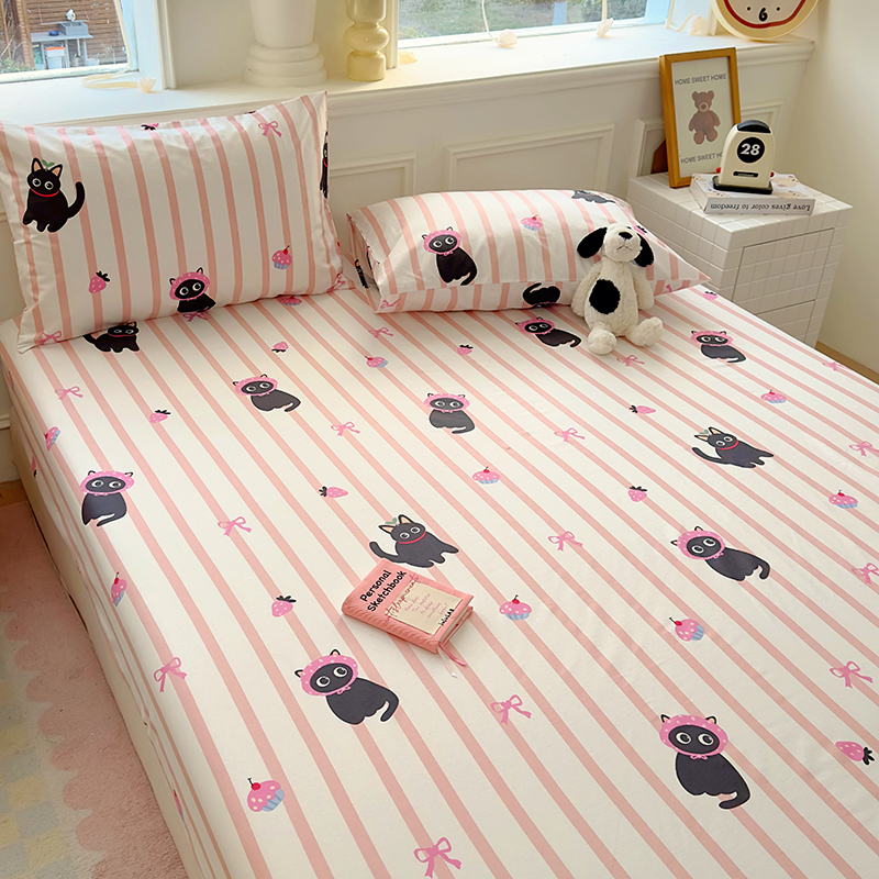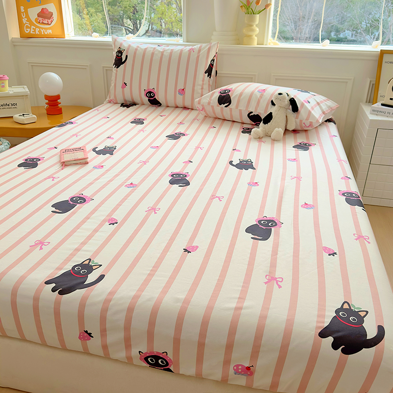 希诺家居 2025新款全棉纯棉卡通小清新床笠 条纹黑猫