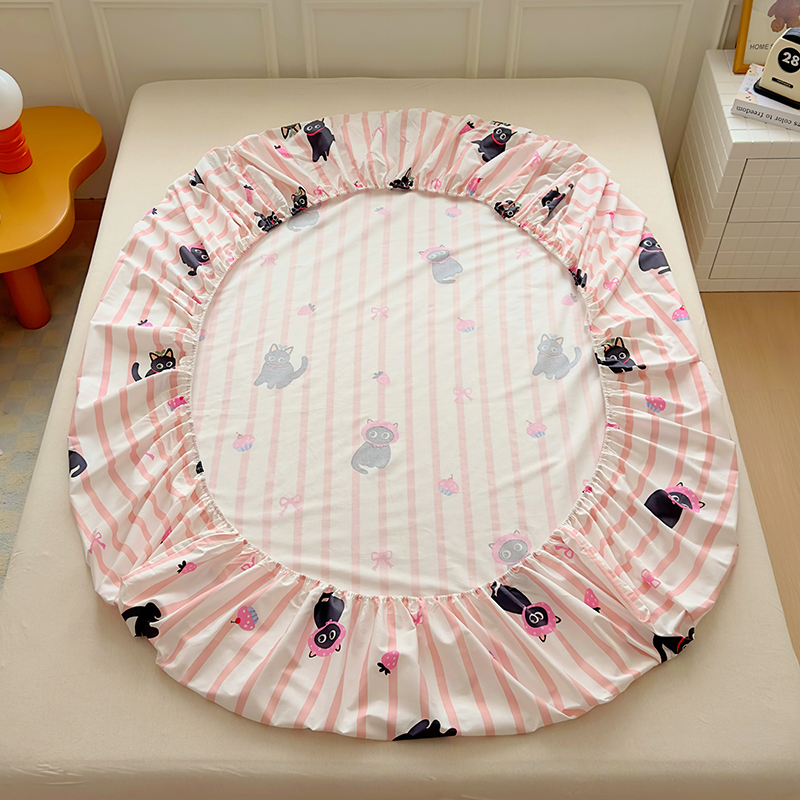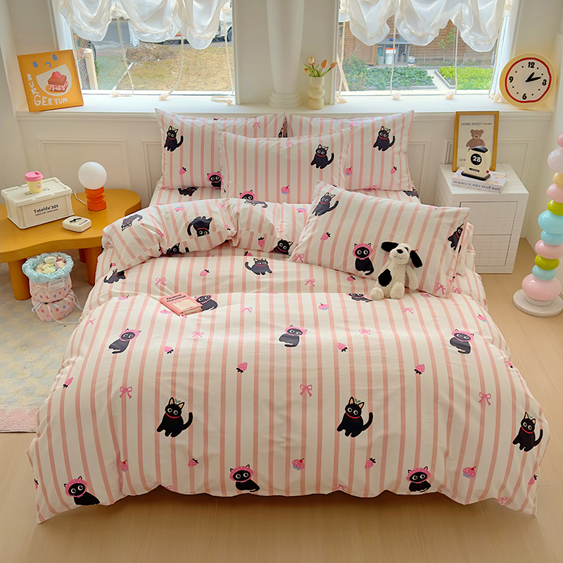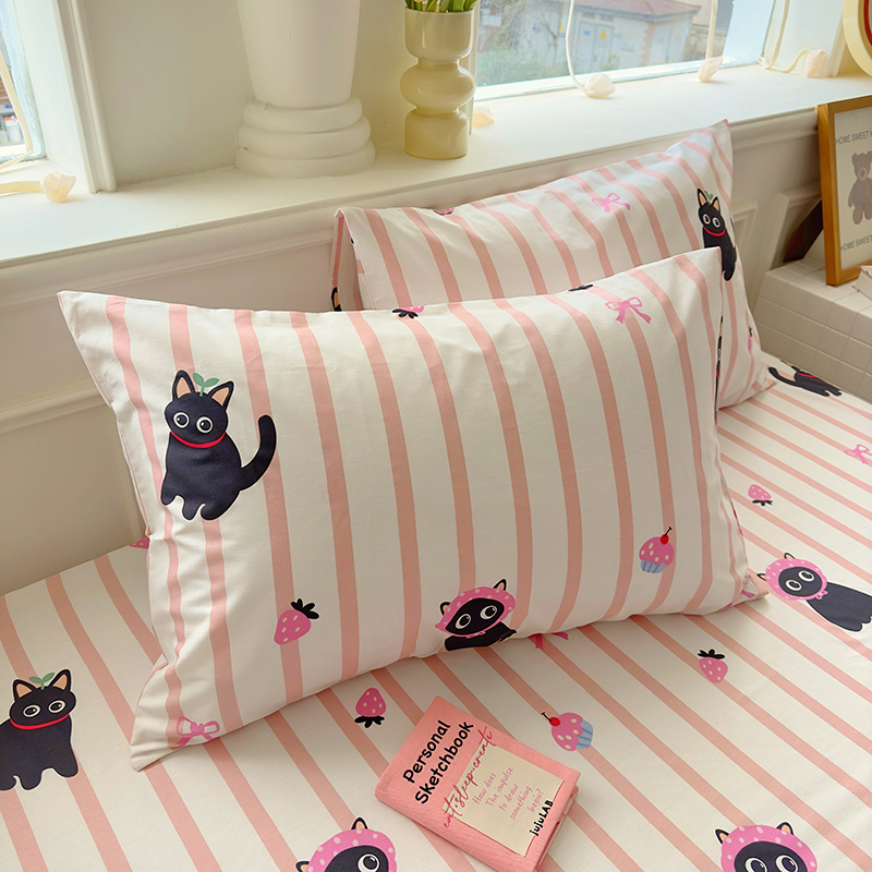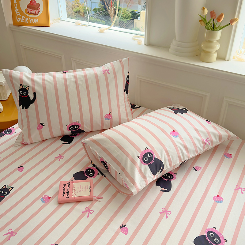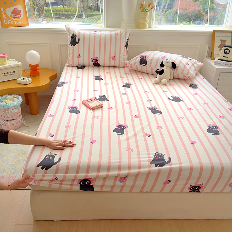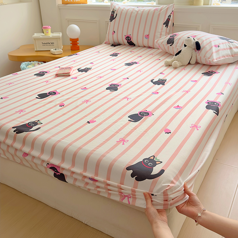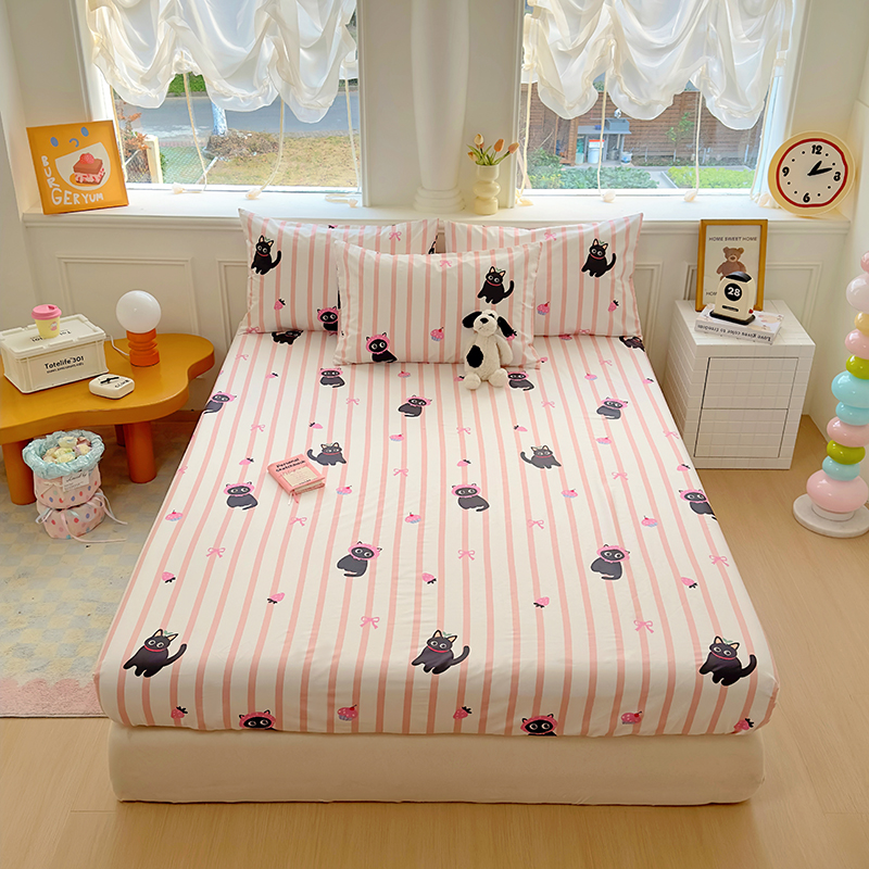 希诺家居 2025新款全棉纯棉卡通小清新床笠 条纹黑猫