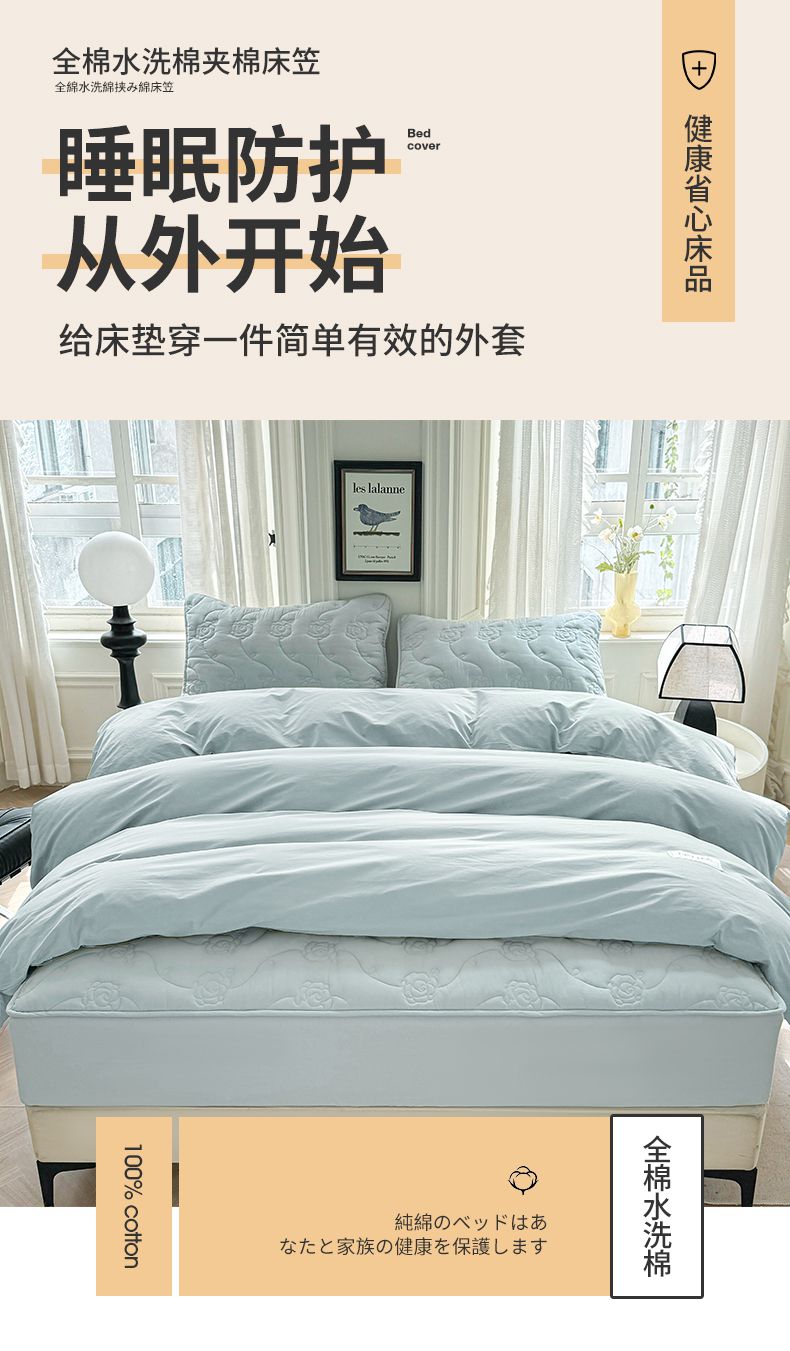 3C 2024新款全棉水洗棉夹棉玫瑰床笠-花语系列 花语 婴儿蓝