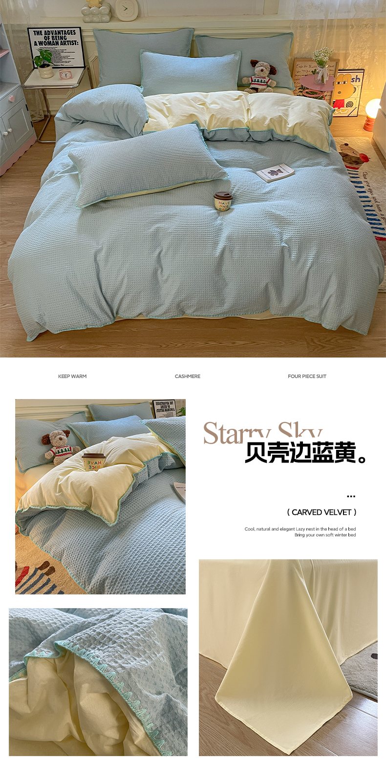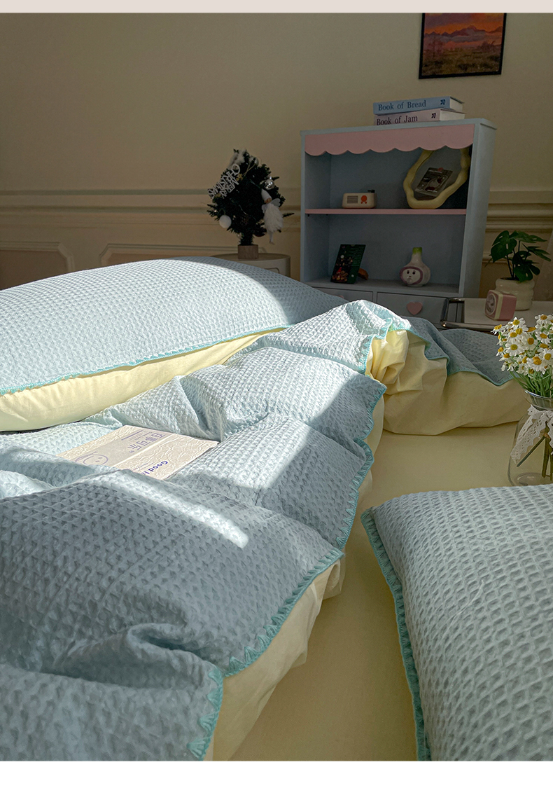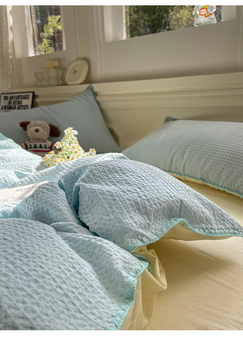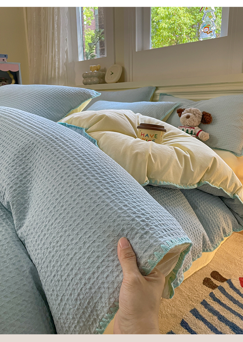 雅居纺家纺 2025新款全棉贝壳边华夫格四件套 贝壳边蓝黄