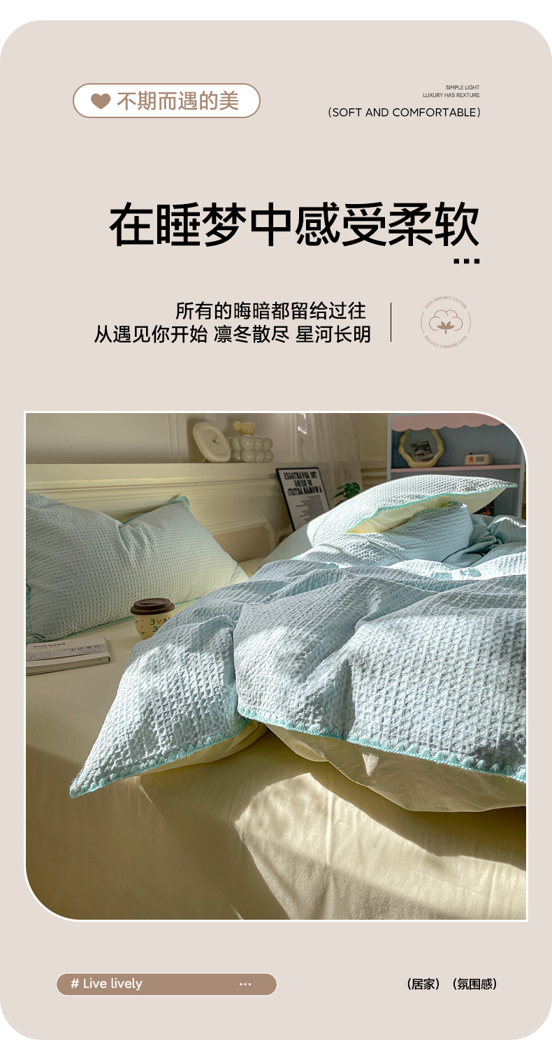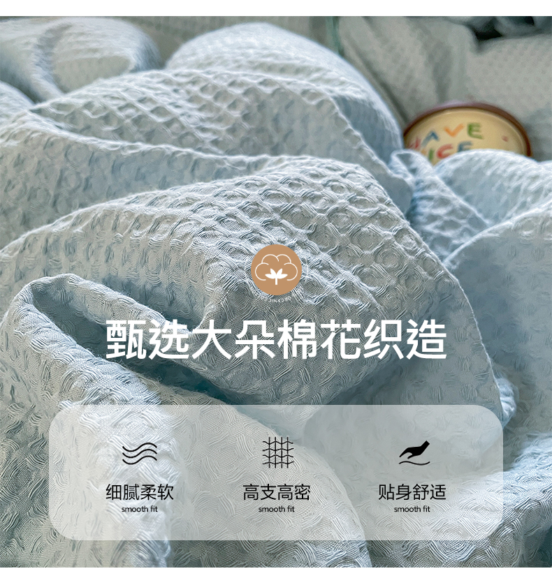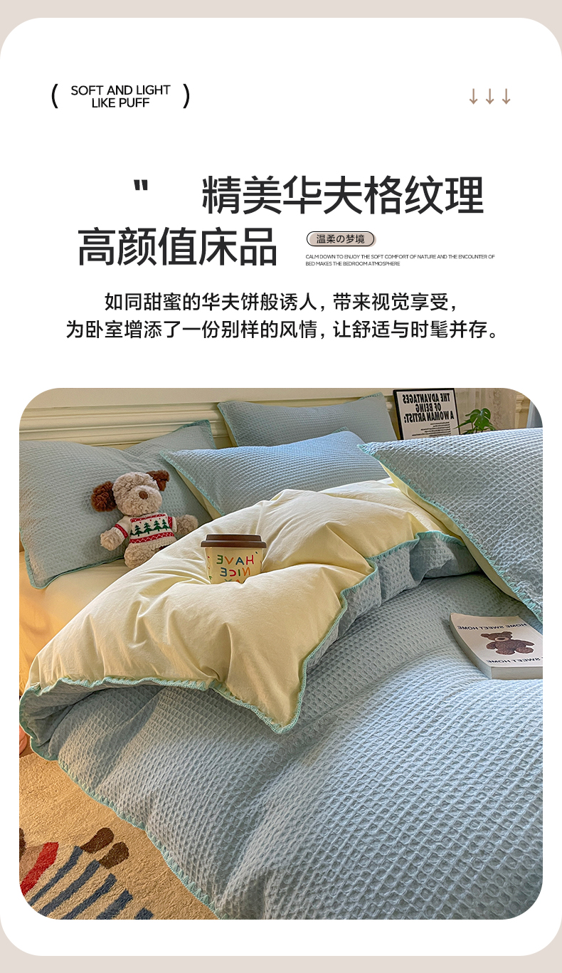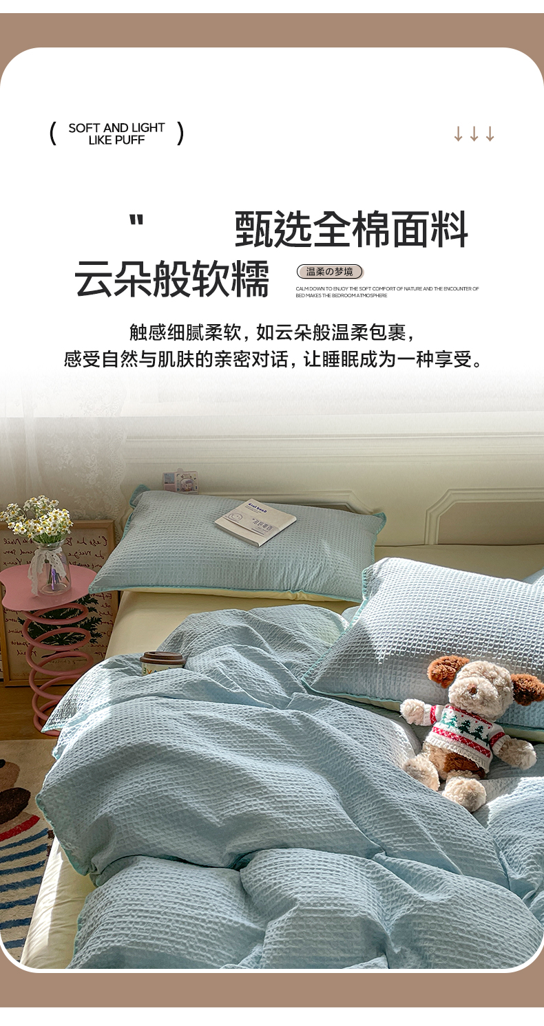 (总)雅居纺家纺 2022新款全棉华夫格普通款四件套,焦糖,米驼,奶油白,柔粉,深灰,雾蓝,月灰