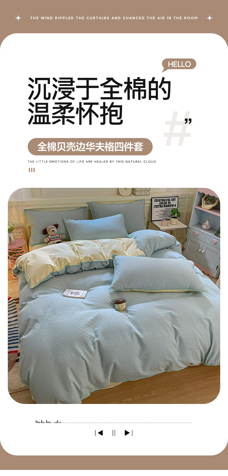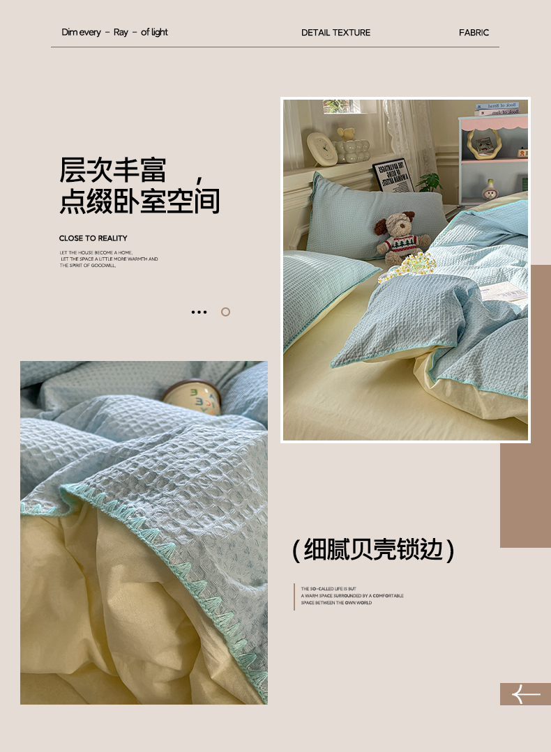 商品名称:雅居纺家纺 2025新款全棉贝壳边华夫格四件套 贝壳边蓝黄