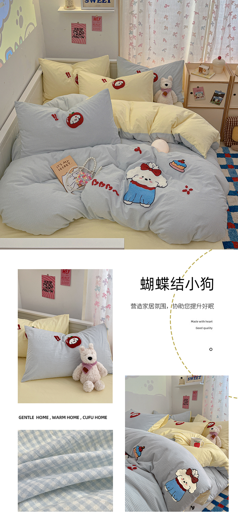 商品名称:呗旺鹿 2025新款A类全棉色织水洗棉毛巾绣系列四件套 蝴蝶结小狗