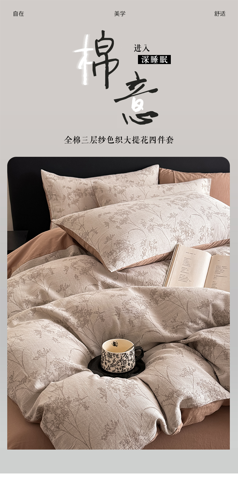 水云缦 2025新款水云缦全棉三层纱色织大提花四件套 琼枝丽影-咖