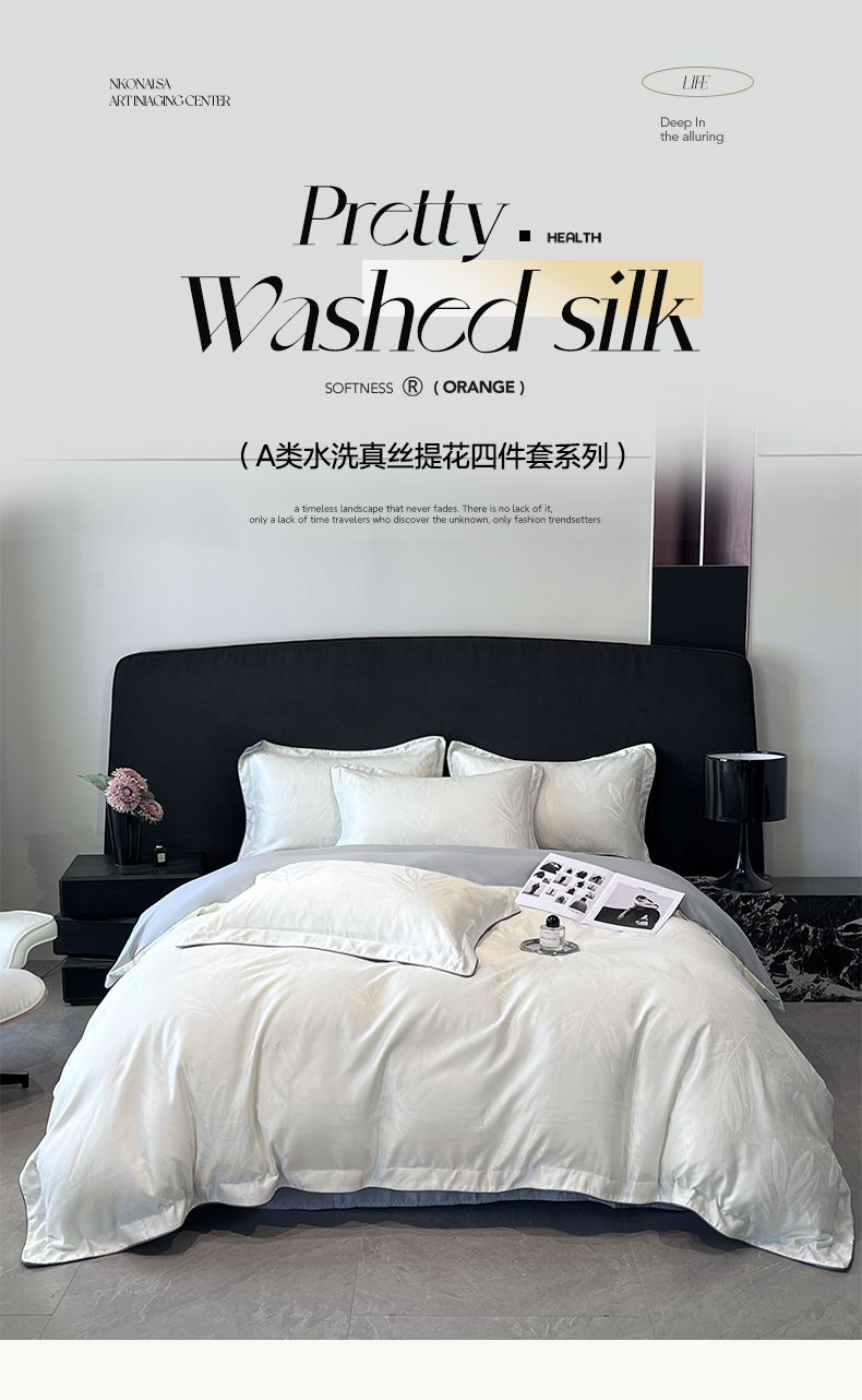 (总)米彩家纺 2025新款A类水洗真丝亮光浮雕花边四件套,粉香槟,粉玉,奶昔白,浅灰,天兰