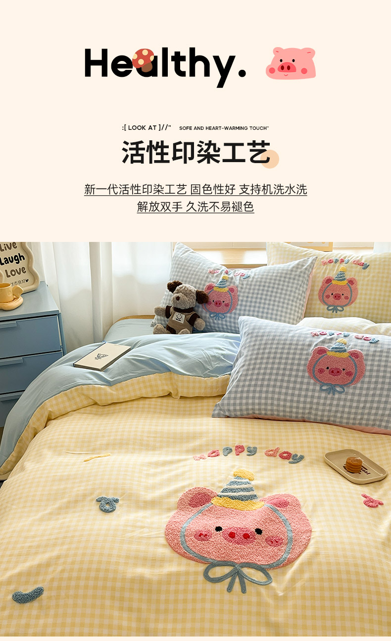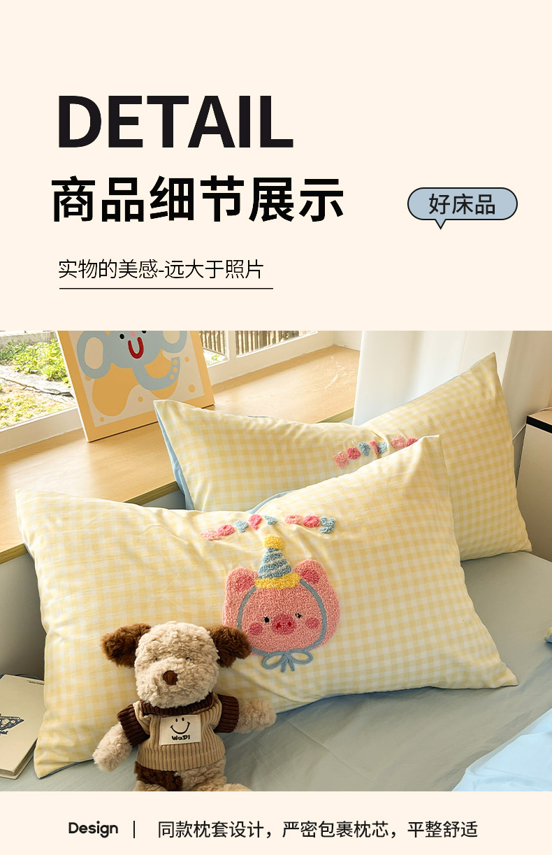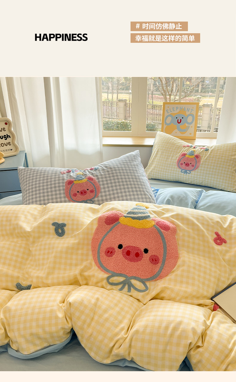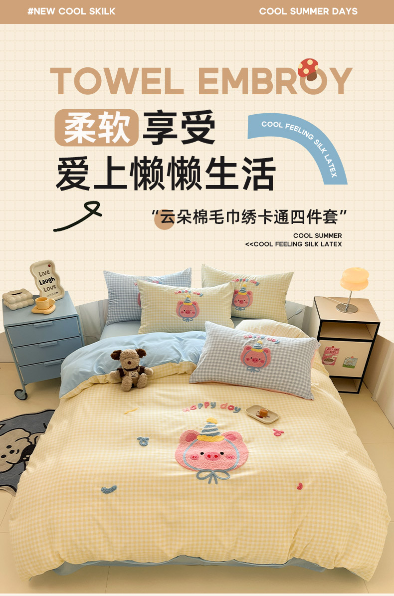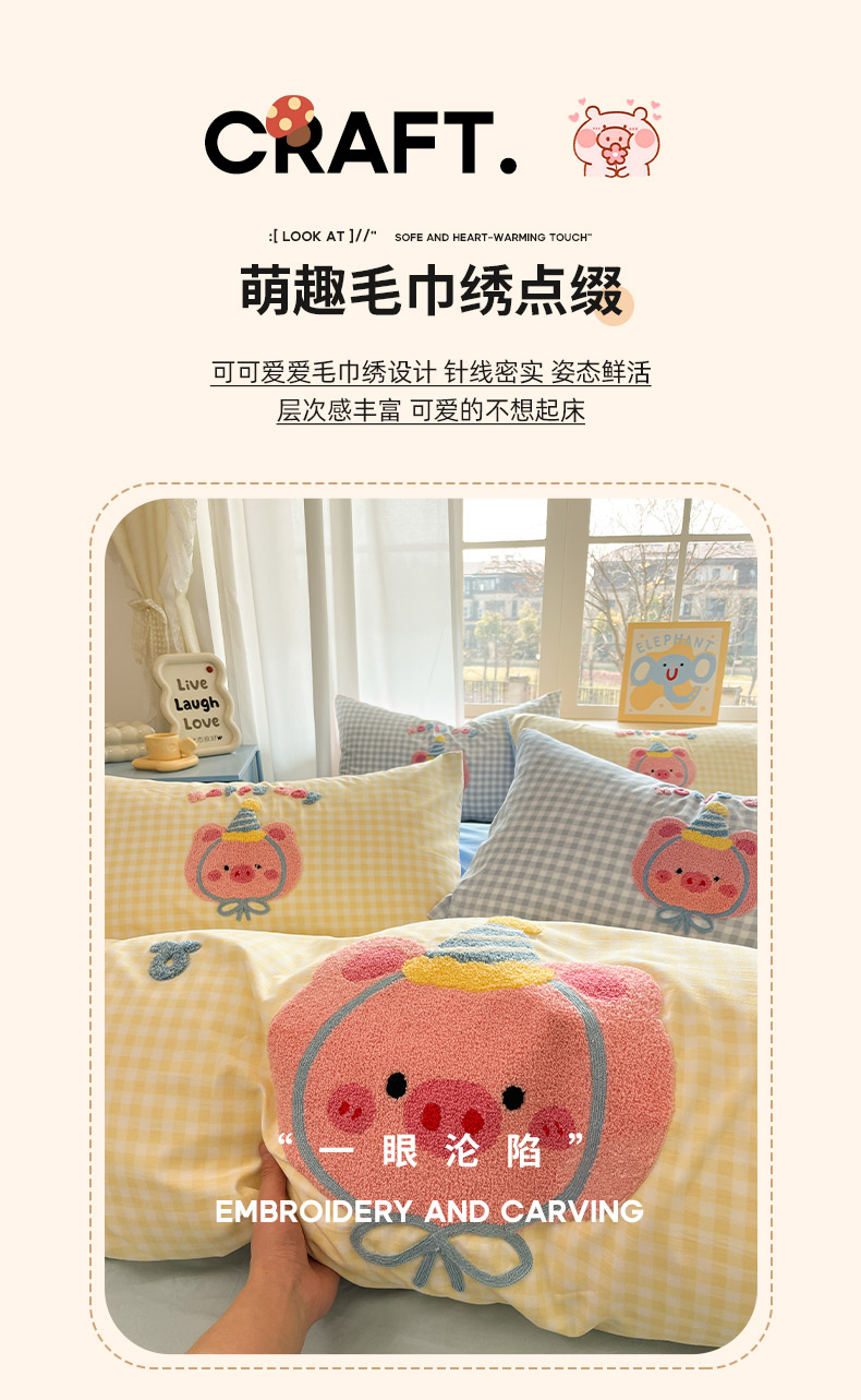 商品名称:乐坊2025新款云朵棉毛巾绣四件套 猪猪-黄格