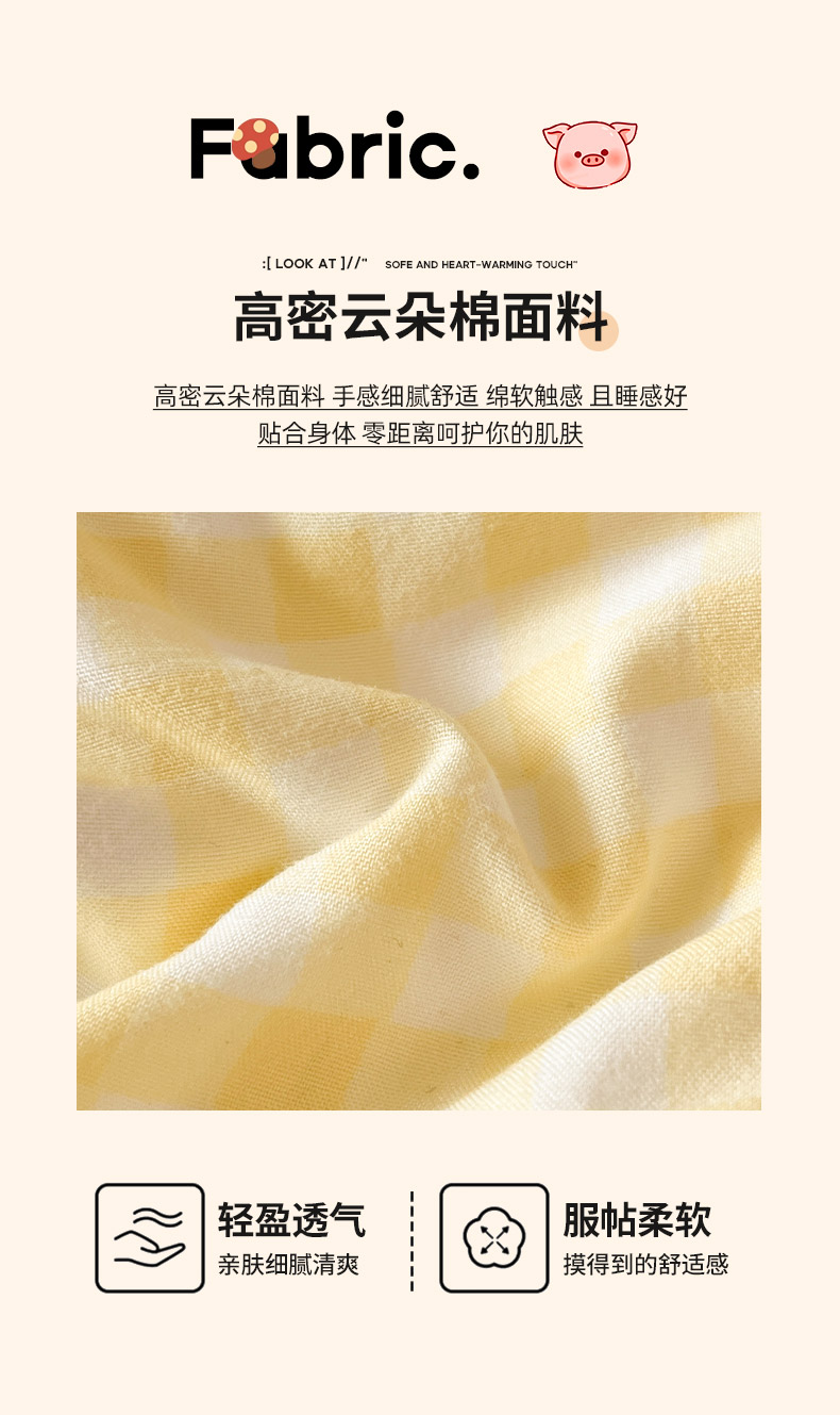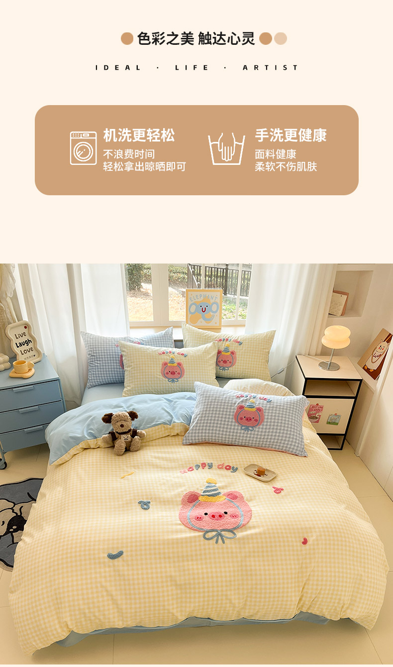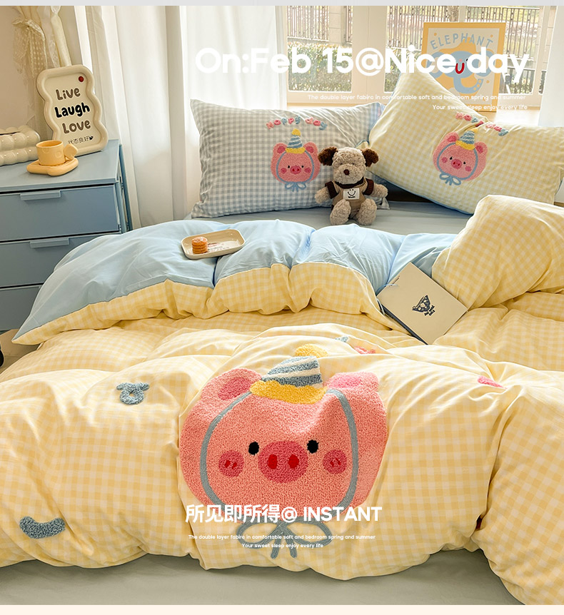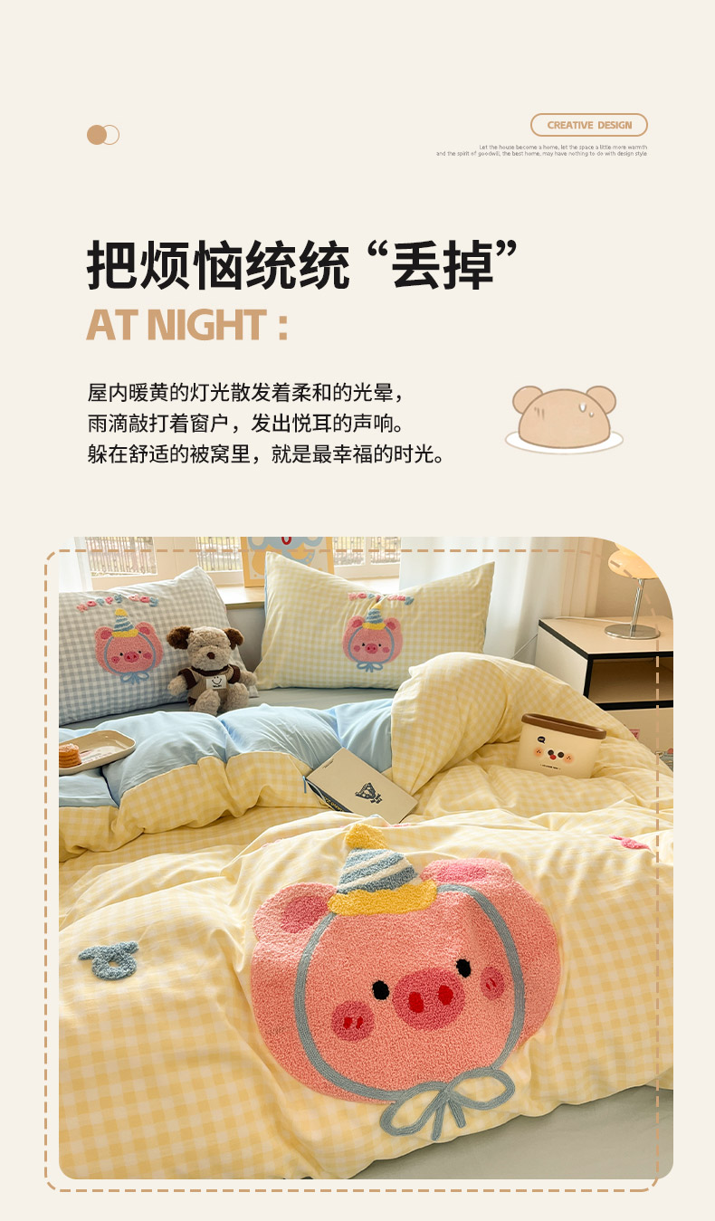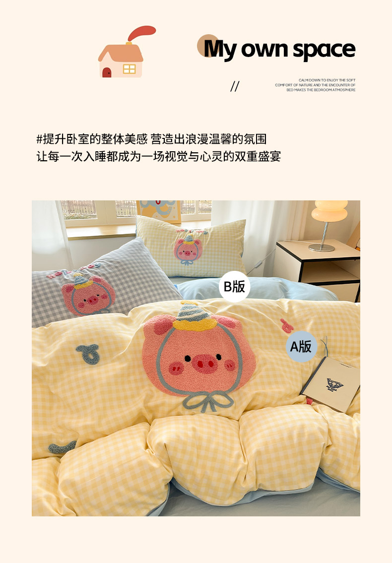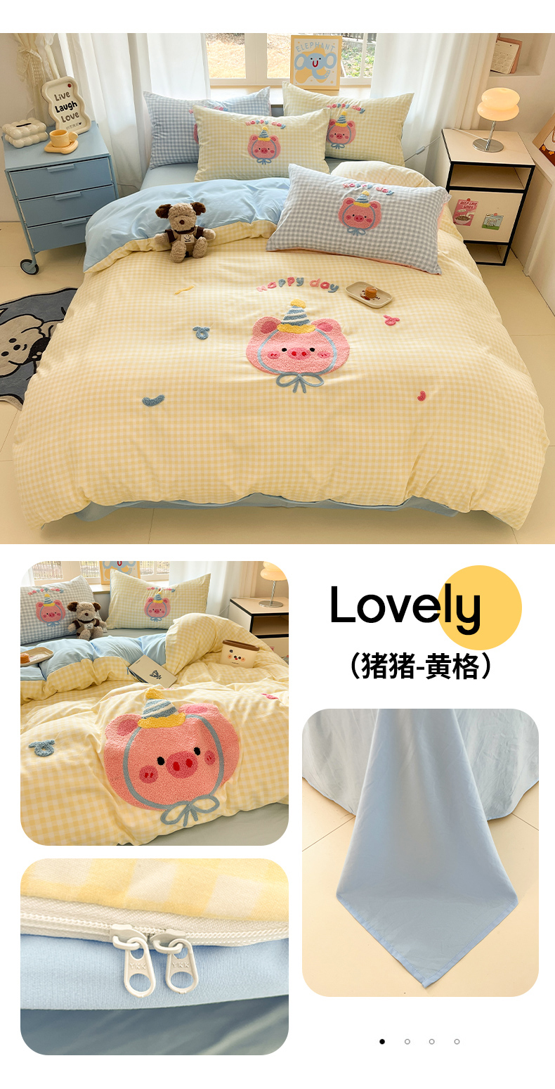 商品名称:乐坊2025新款云朵棉毛巾绣四件套 猪猪-黄格